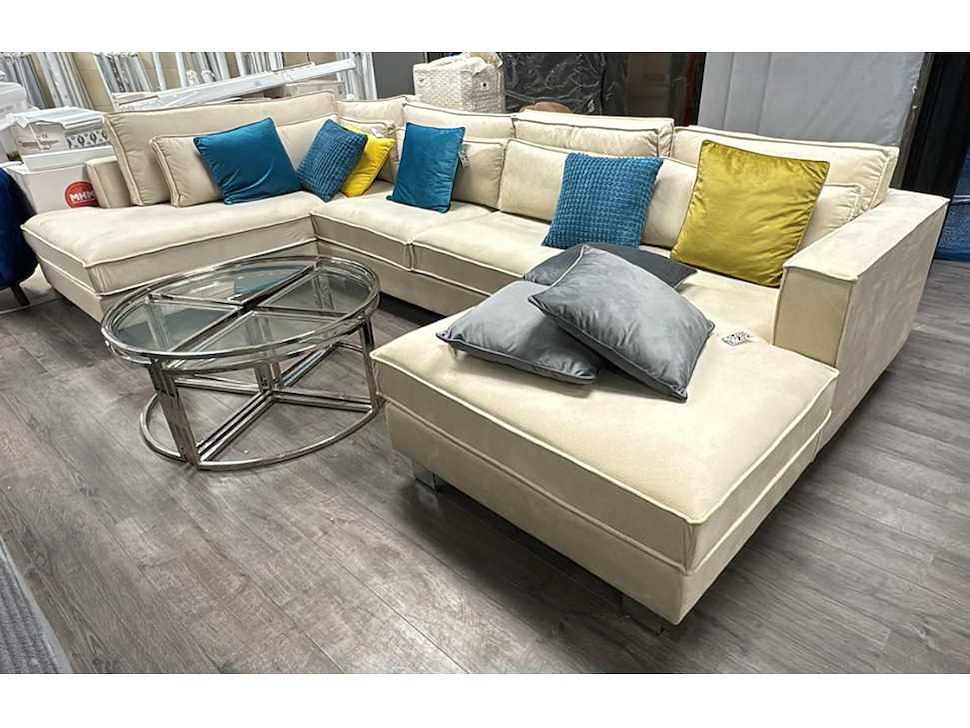 Type: Morgan hoeksalon; afmeting L: 400 cm, B: 205 cm; lounge 220cm hoeksalon bestaande uit: otm - 3 zitten - longchair; kleur: beige; staat: showroom model;