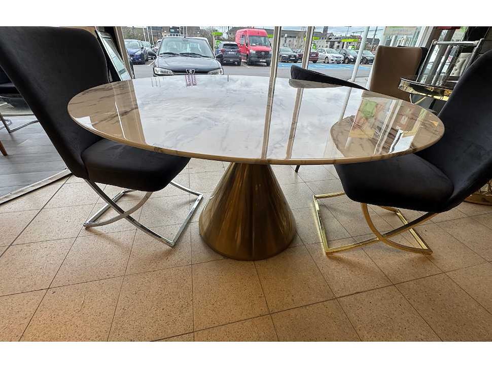 Type: Ronde eettafel Raspen afmeting; B: 130cm kleur: wit marmerlook - gouden poten ;staat: showroommodel
