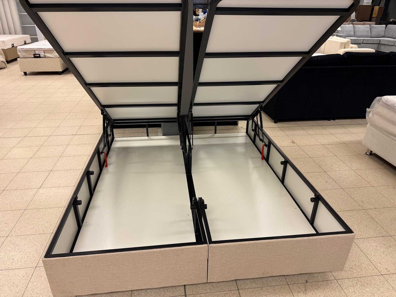 2x box 80x200 beige kleur stof; staat: showroommodel
