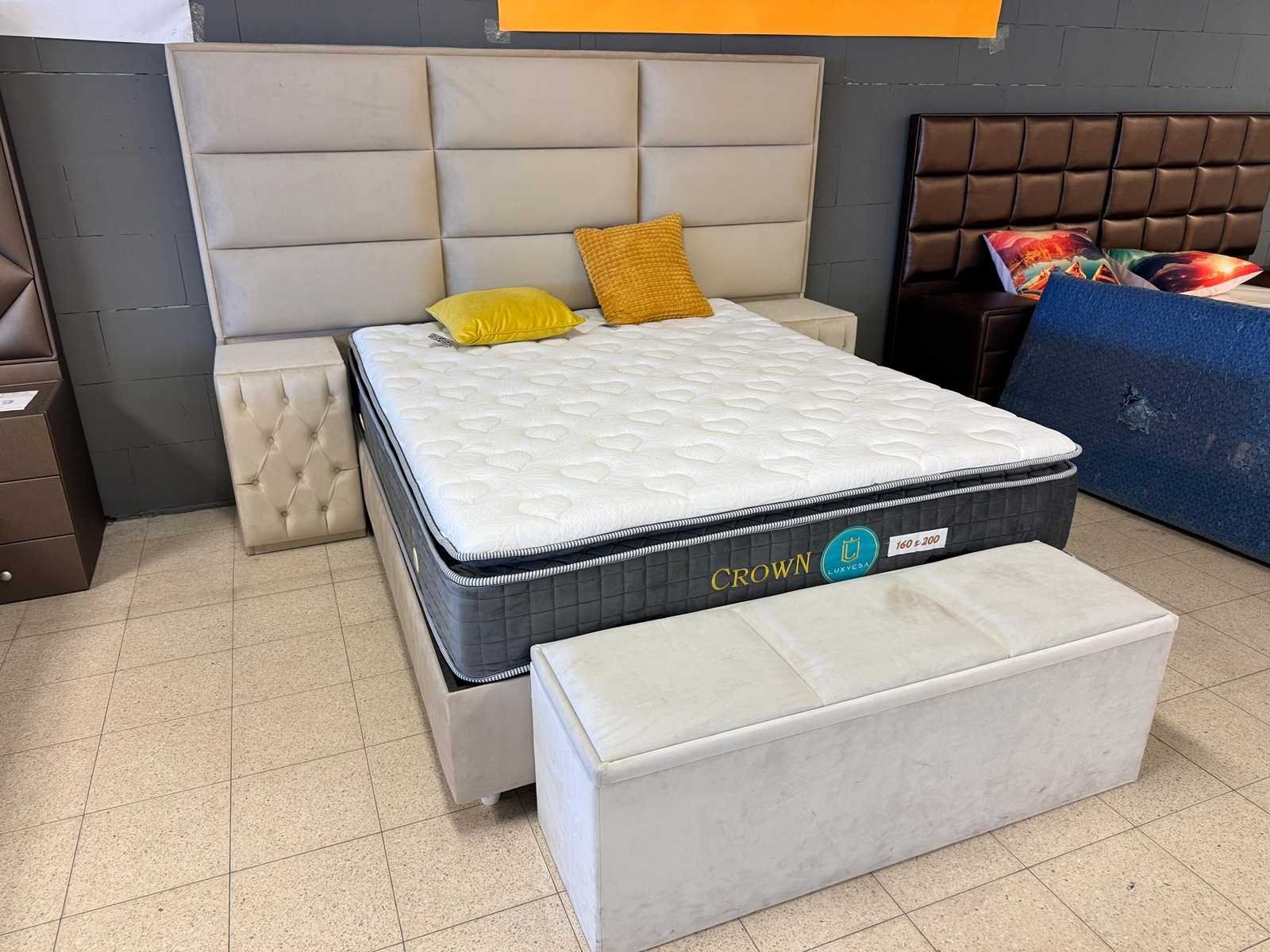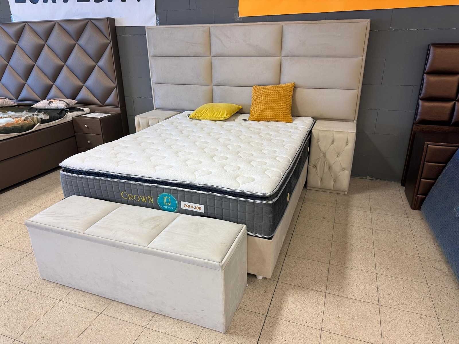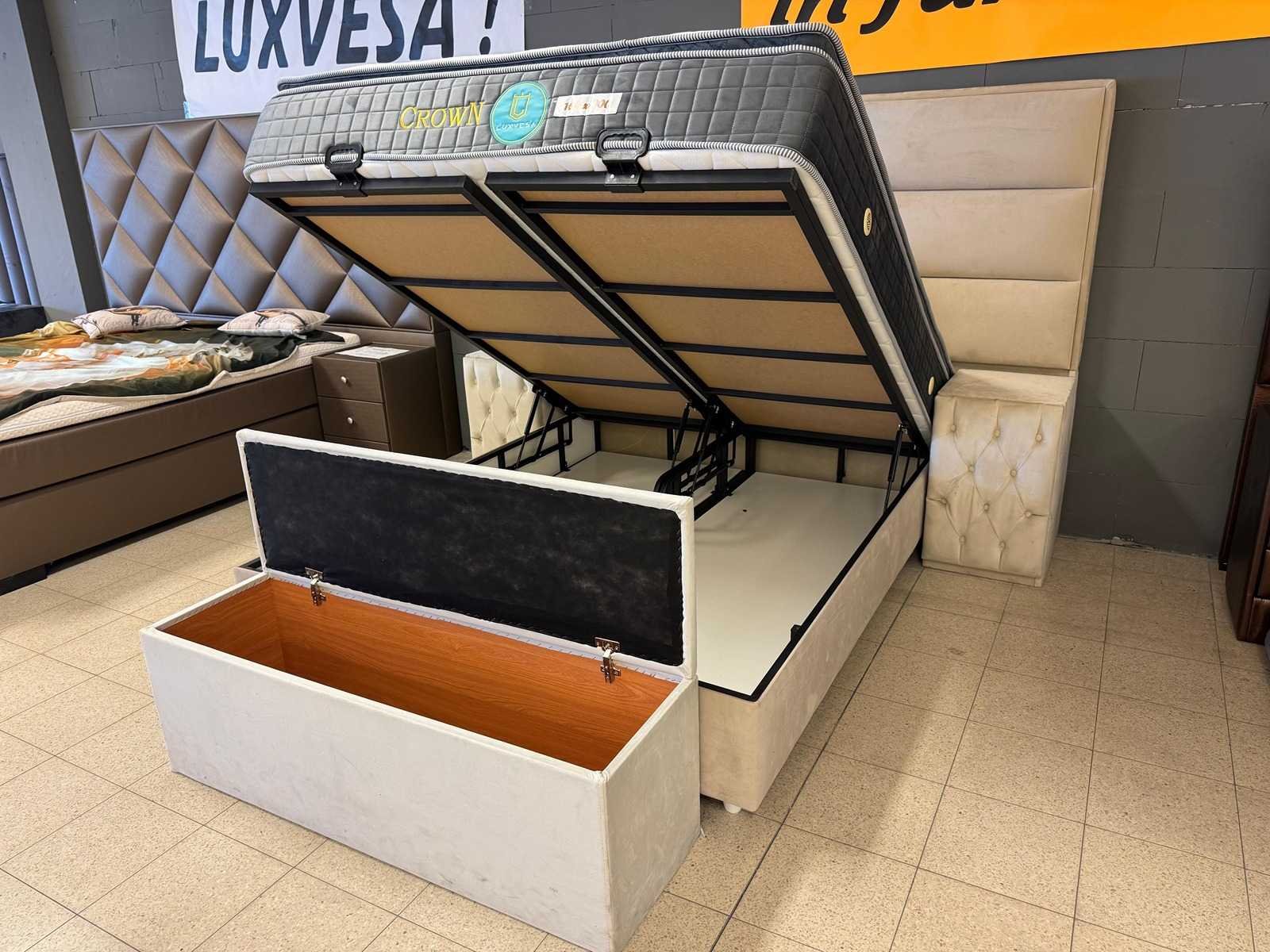 Type: next boxspring; afmeting L: 160 cm; B: 200 cm; hoofdbord, boxen met opbergruimte, nachtkasten en voetbank, luxe pocket veren matras kleur: beige stof. staat: showroom model.