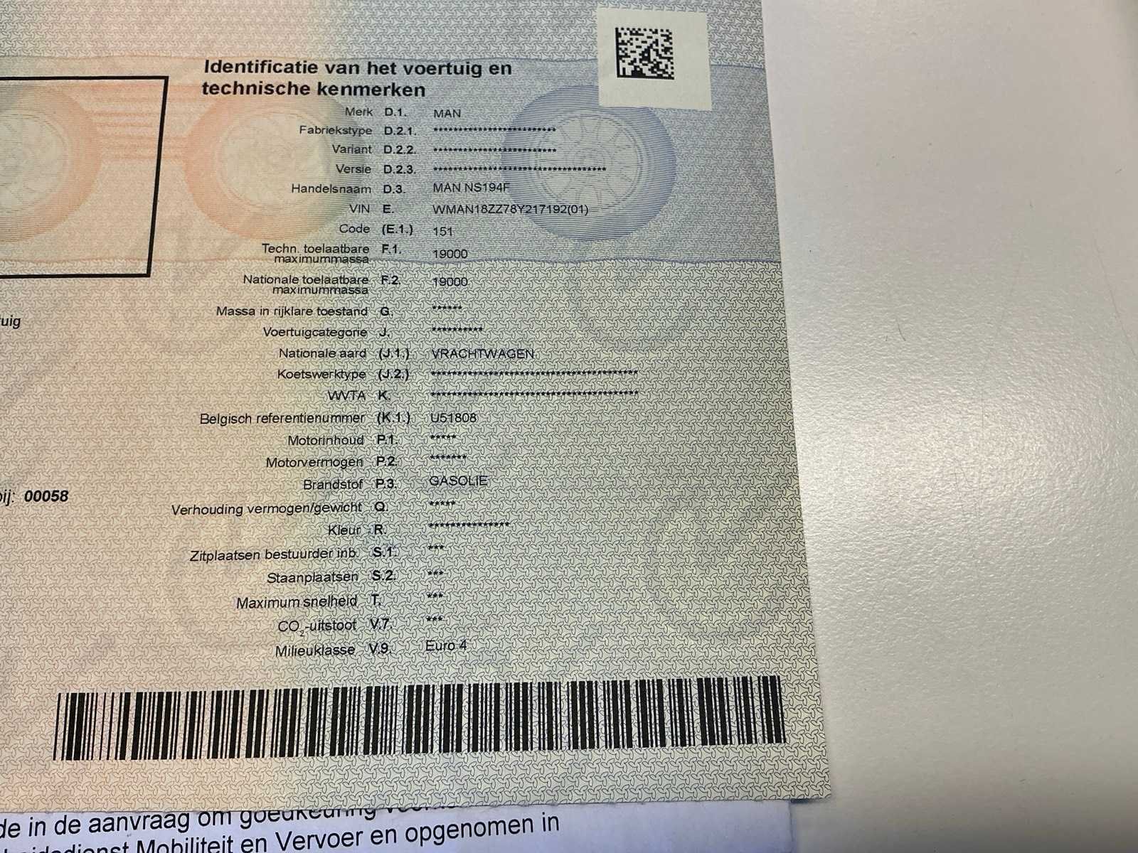 <Br> - Inschrijvingsbewijs: deel1 aanwezig, deel2 aanwezig. - Gelijkvormigheidsattest: aanwezig. - Gebruikssporen. Merk: MAN Type: TGM NS 194 F Chassisnummer VIN: WMAN18ZZ78Y217192 Kilometerstand bij opname: 64811km Datum eerste toelating: 14/07/2008 Type transmissie: Automatisch Fuel Type: Diesel Aantal sleutels: 2 Hydraulische laadklep: true Diesel: true