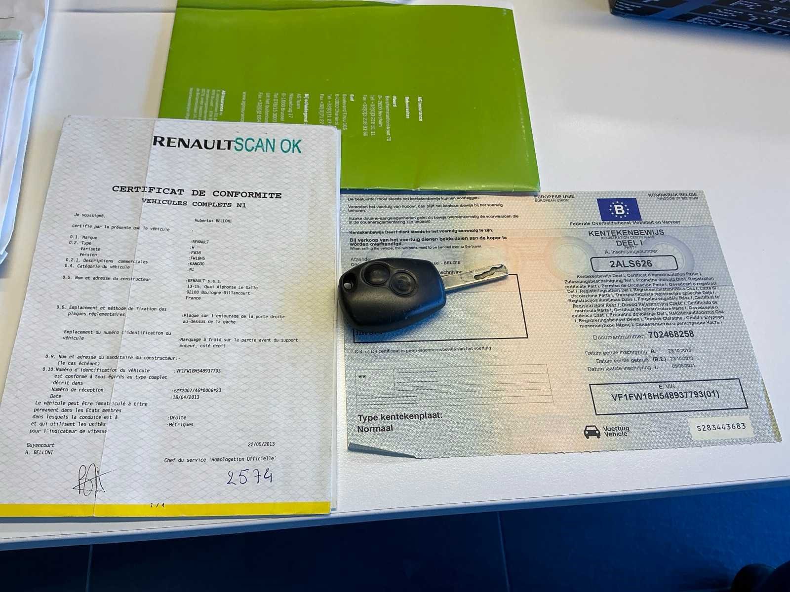 <Br> - Inschrijvingsbewijs: deel1 aanwezig, deel2 Niet aanwezig. - Gelijkvormigheidsattest: aanwezig. - krassen, deuken. Merk: Renault Type: Kangoo Chassisnummer: VF1FW18H548937793 Afgelezen kilometerstand: 272833km Cilinderinhoud: 1461cc Vermogen (kW): 66kW Brandstof: diesel Datum eerste inschrijving: 23/10/2013 Transmissie: Handgeschakeld Aantal sleutels: 1 Emissieklasse: Euro5