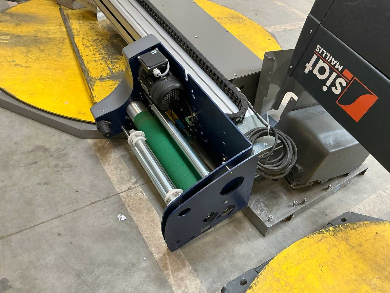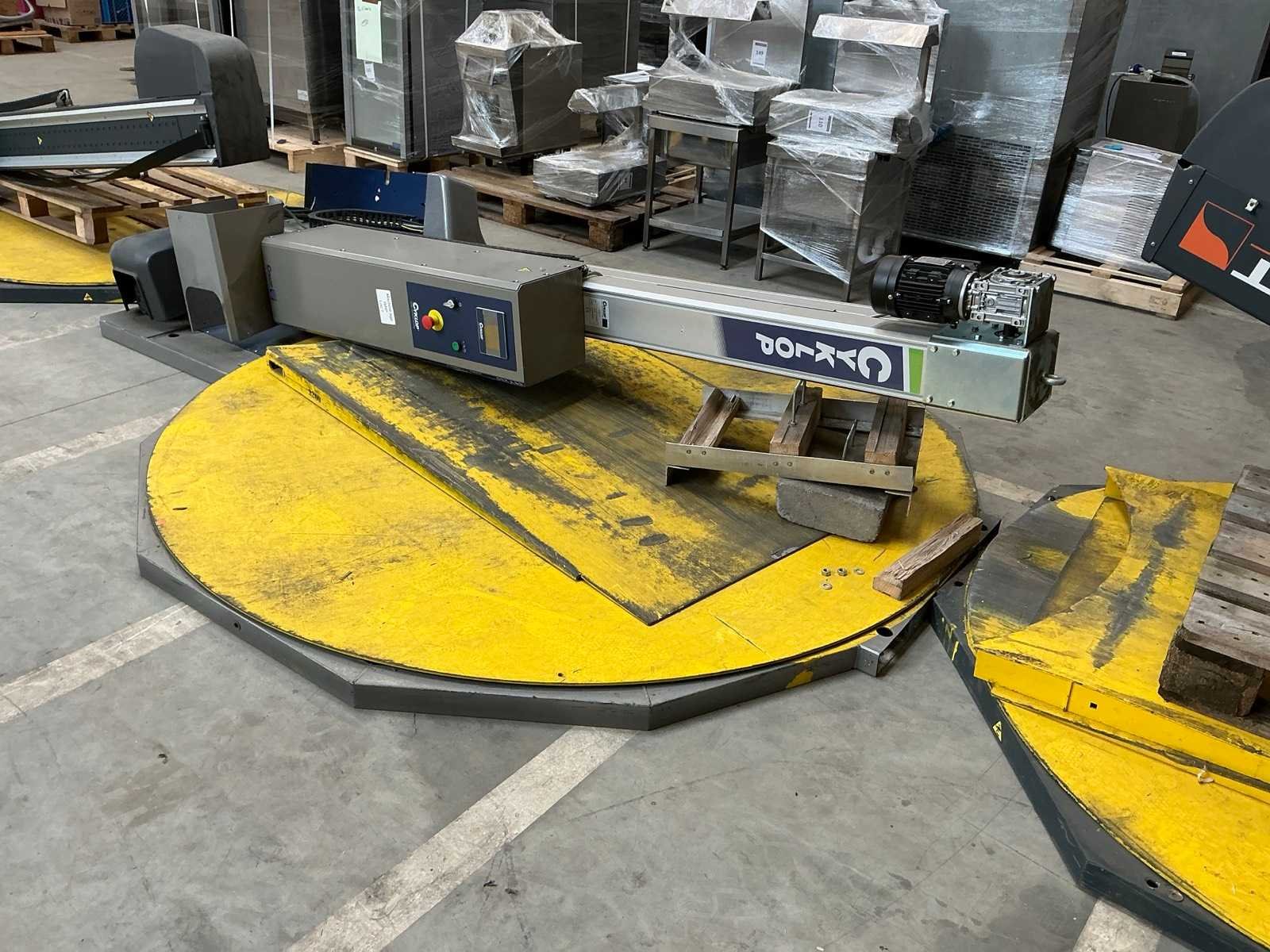 Met oprijplaat. Merk: Cyclop Type: CTT230-CTT2301010 Serienummer: 210154 Plateau Ø: 2200mm Foliebreedte: 550mm Aansluiting: 230V Totale afmeting L: 2860mm Totale afmeting Breedte: 2200mm Totale afmeting Hoogte: 2850mm
