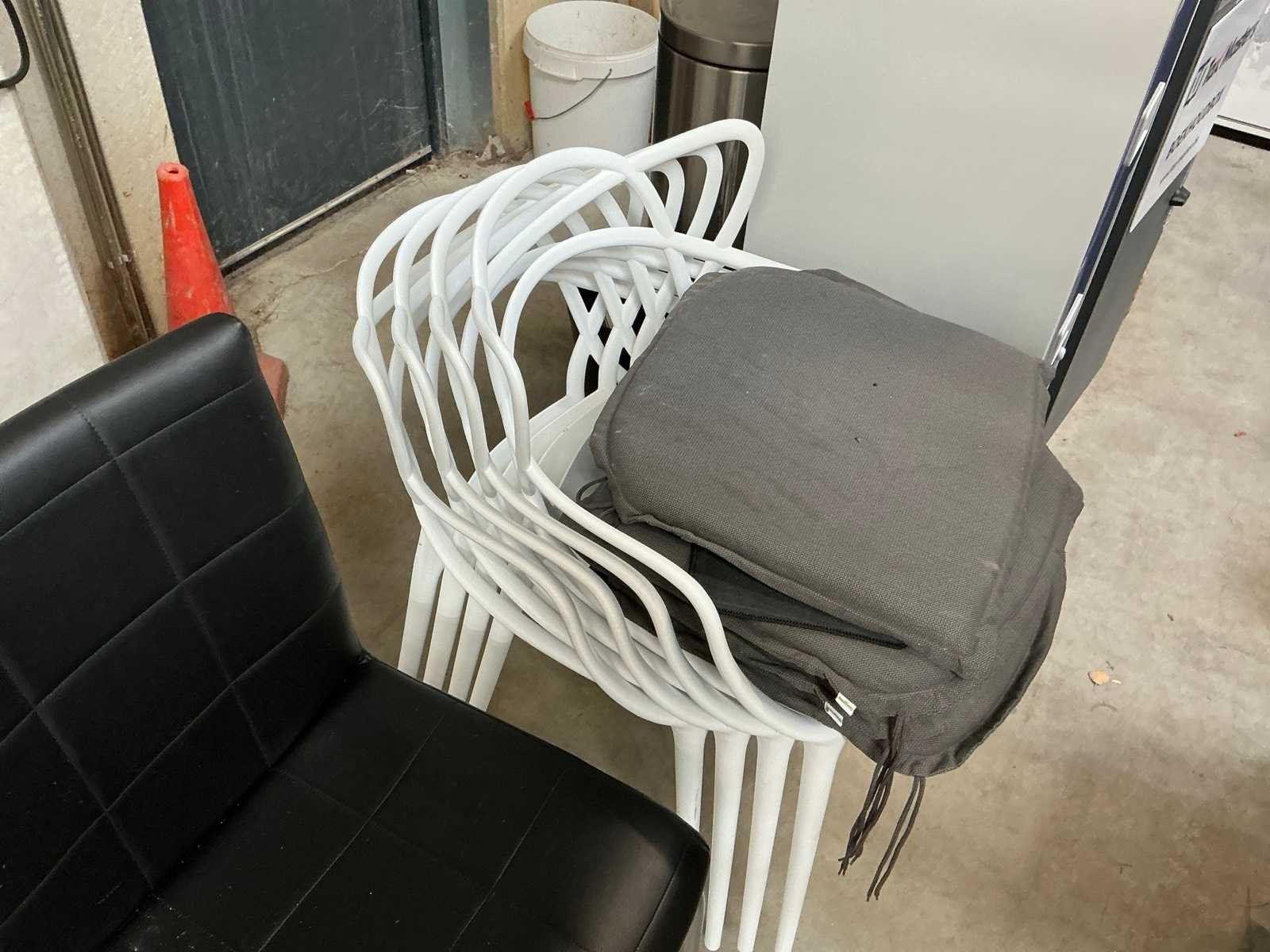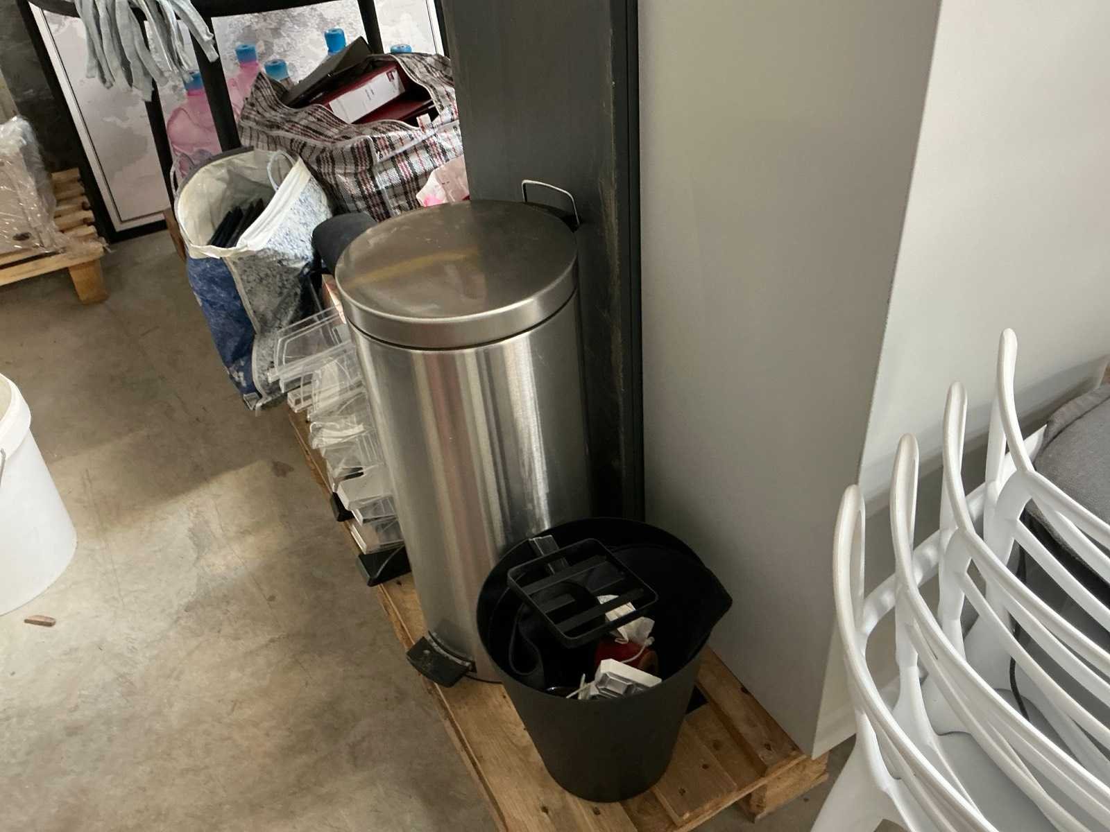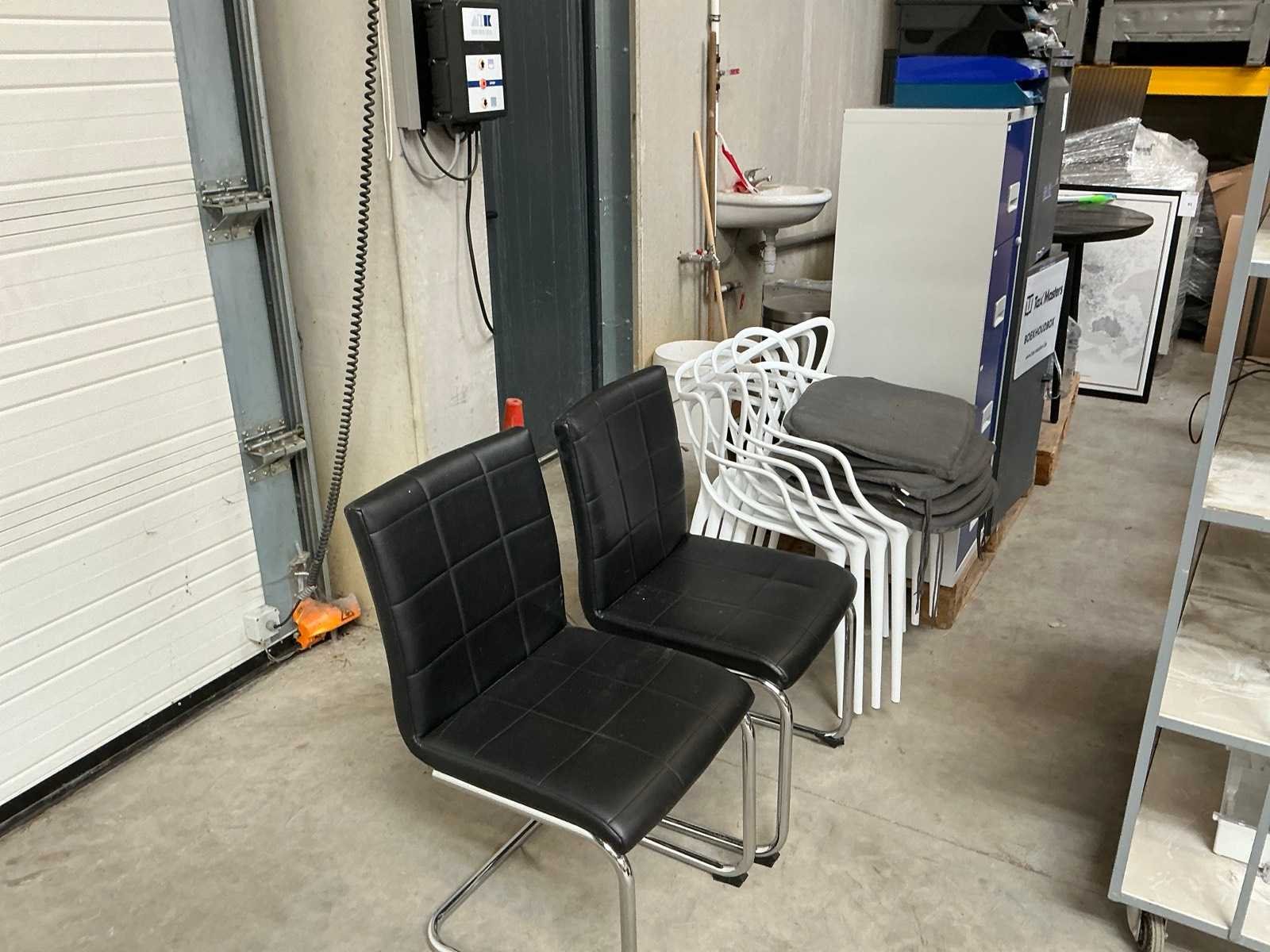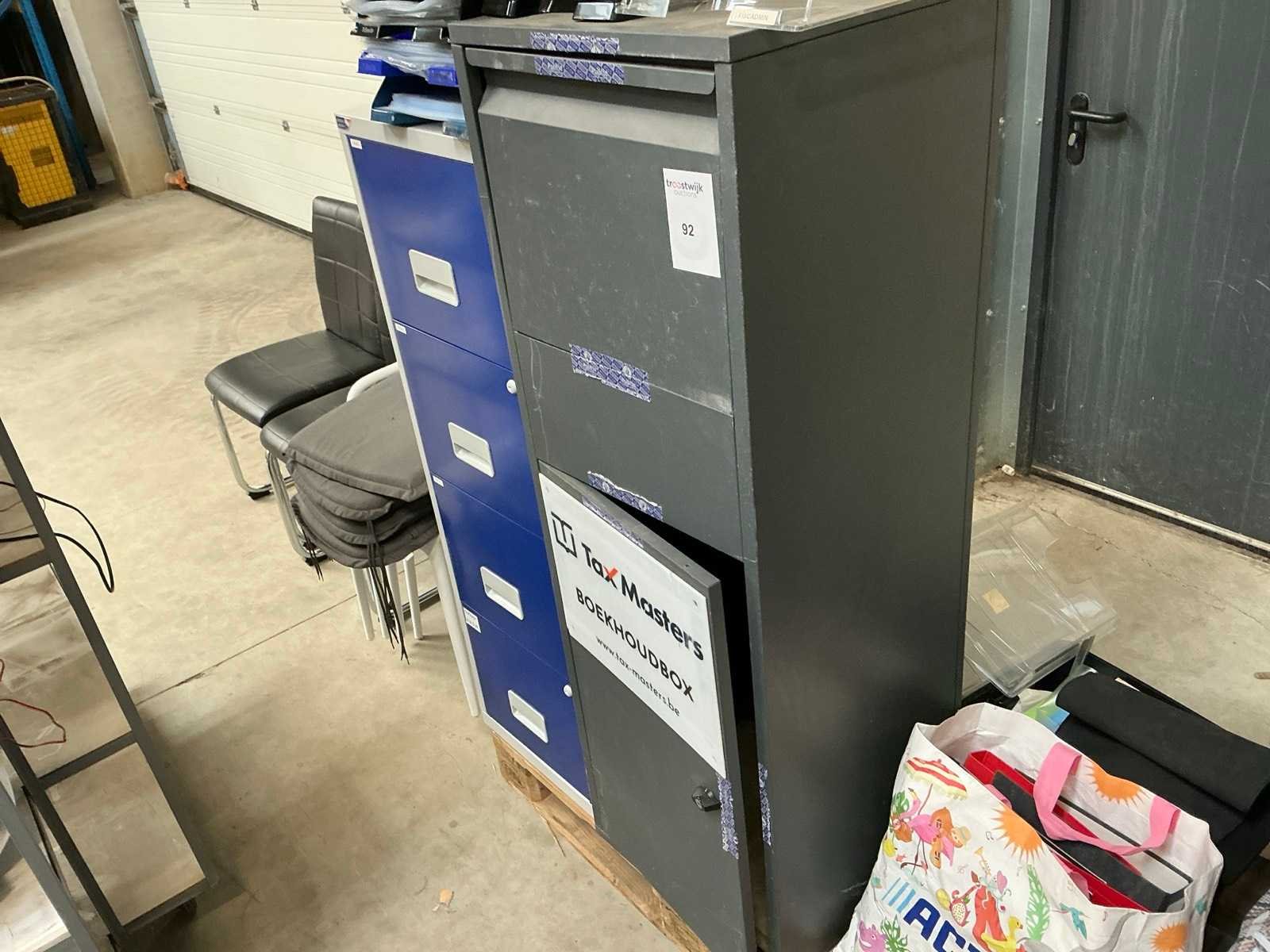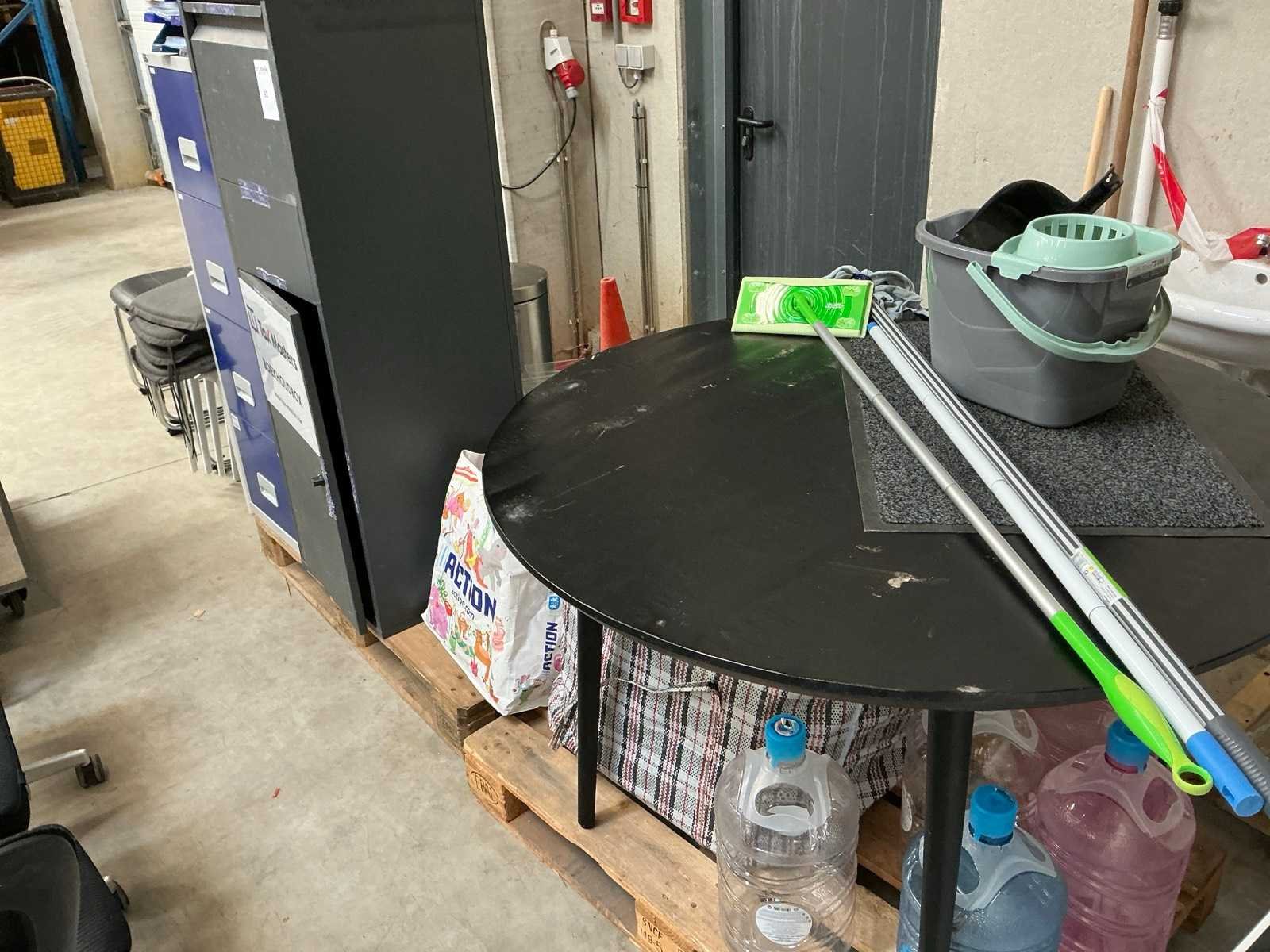 Waaronder 1x pakketbrievenbus met afmetingen 46 x 45 x H 140 cm (sleutel niet aanwezig), 1x dossierkast met 4 lades met afmetingen 40 x 40 x H 125,5 cm, ronde houten tafel (zwart) met diameter 120 x hoogte 77 cm, 4x kunststof stoel (wit) met kussen, 2x stoel, 1x Brabantia pedaalemmer,…
