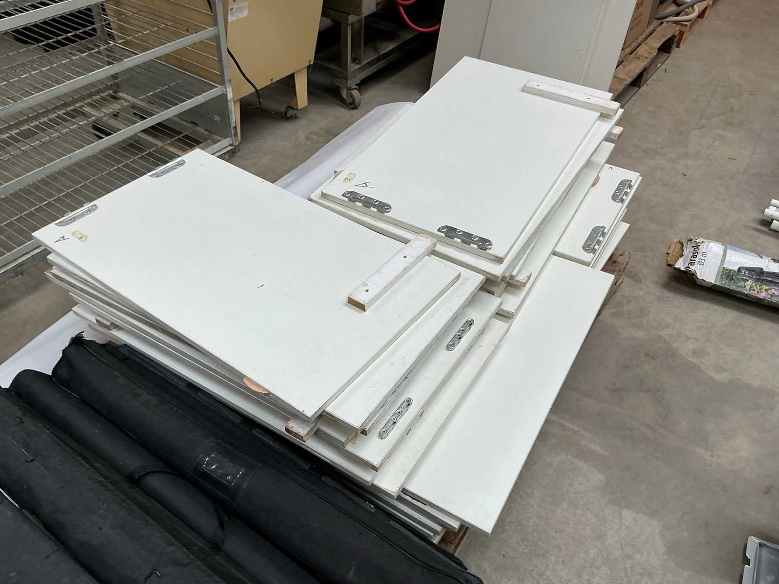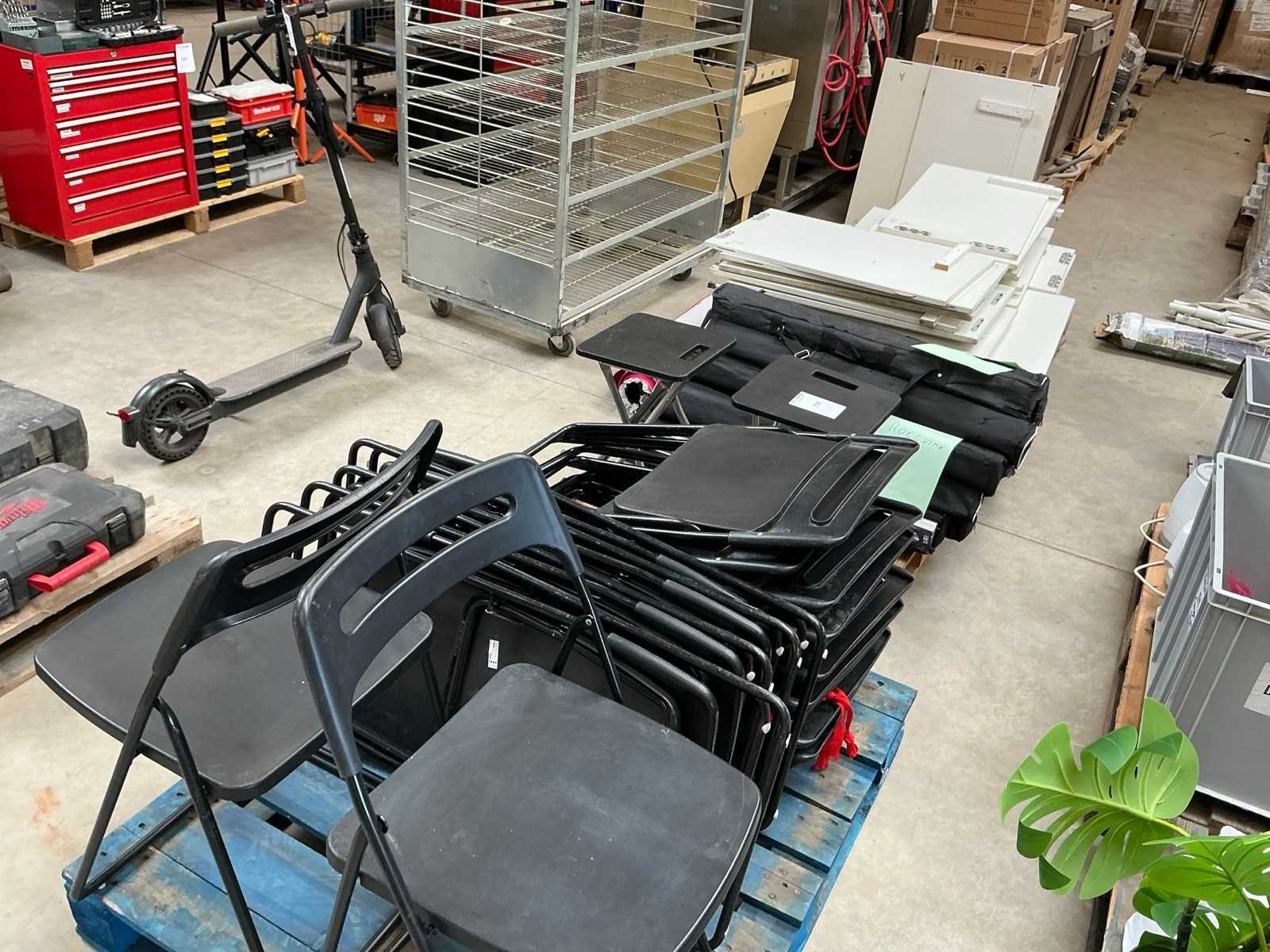 Zijnde 22 klapstoelen, 2 krukjes, 22 roll-up banners, reclamezeil, partij houten planken