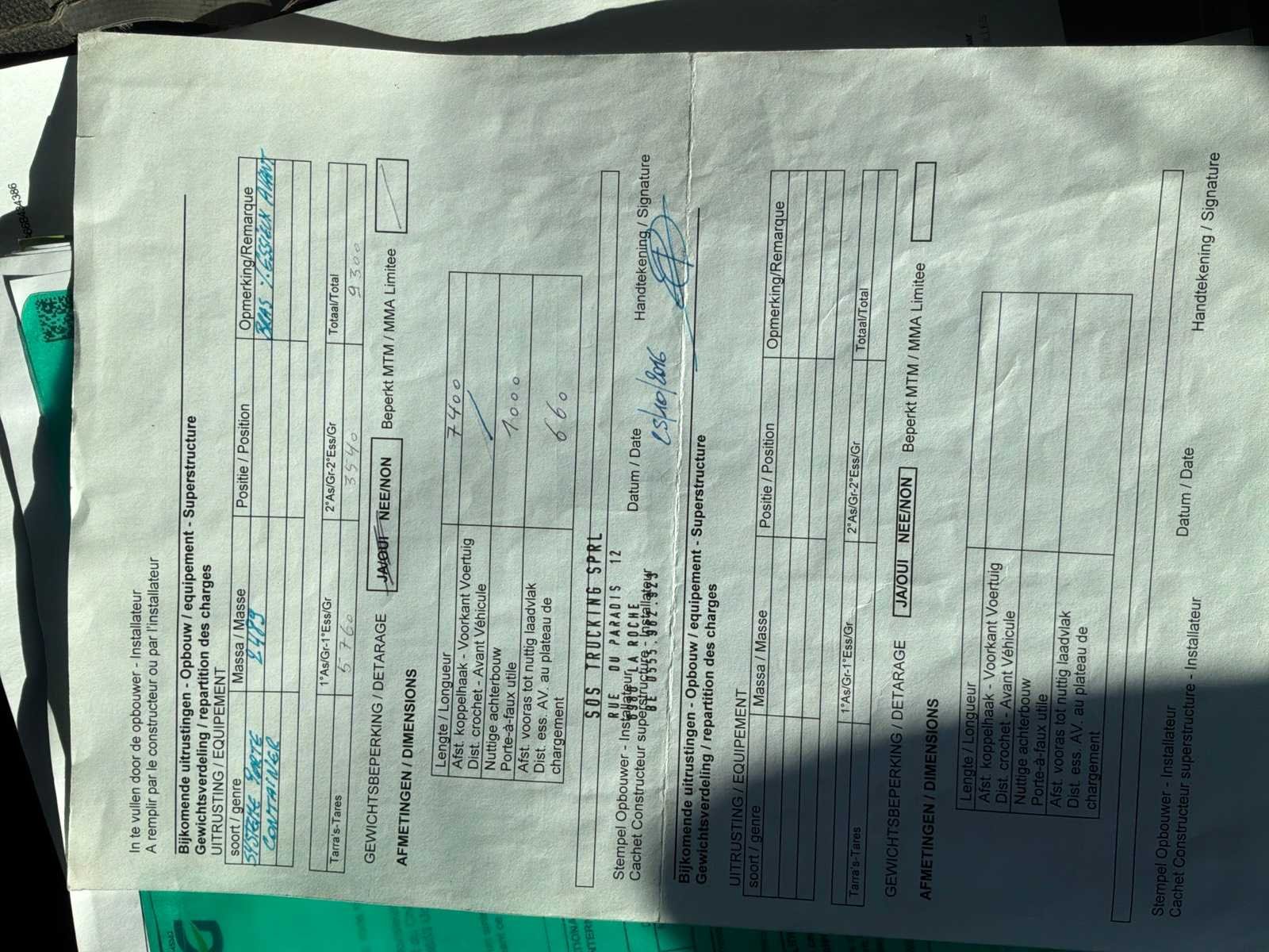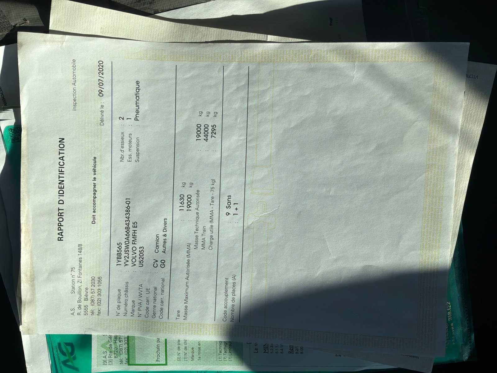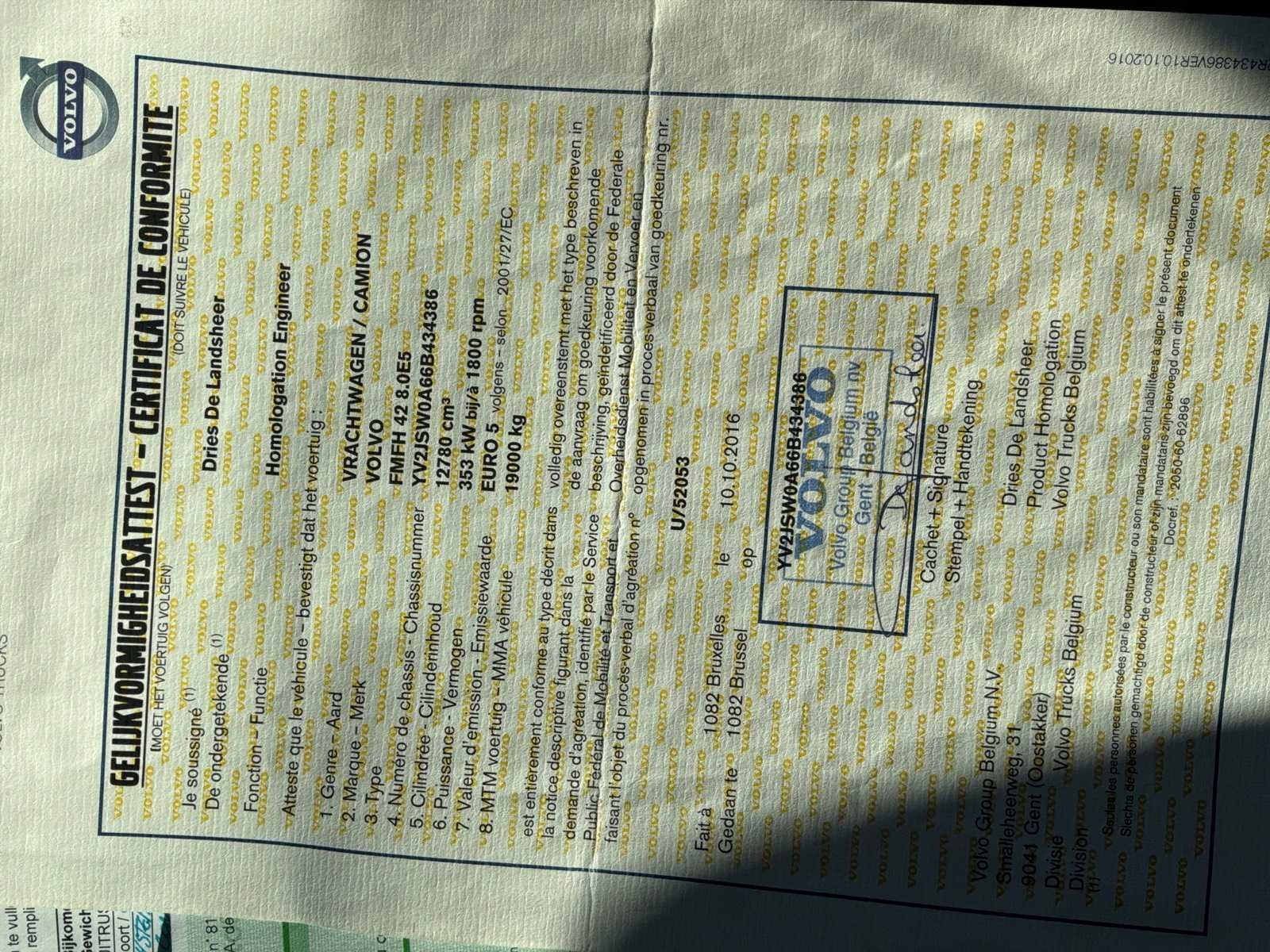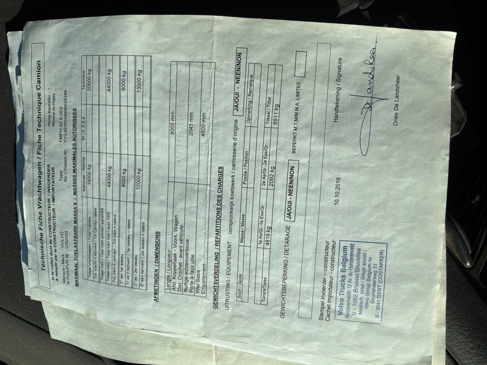 Startend en rijdend Onlangs nieuwe afstandsbediening voor containersysteem geïnstalleerd Verschillende onderdelen vervangen Documenten inbegrepen : inschrijving deel 1 en 2 Identificatieverslag, gelijkvormigheidsattest, keuringsbewijs geldig tot 9/7/26, technische fiche, Merk: Volvo Type: FMFH E5 Bouwjaar: 2006 Chassisnummer VIN: YV2JSWOA66B434836 Cilinderinhoud: 12780cc Kilometerstand bij opname: 619647km Datum eerste toelating: 03/10/06 Type transmissie: Automatisch Fuel Type: Diesel Laadvermogen: 19000kg Aantal sleutels: 1 Eigen gewicht: 11630kg Totale afmeting L: 8005mm Totale afmeting Breedte: 2550mm Totale afmeting Hoogte: 2750mm Startinformatie: Startend Nationaliteit documenten: Belgisch Kentekenpapieren compleet?: true Aantal zitplaatsen: 2 Automaat: true Diesel: true