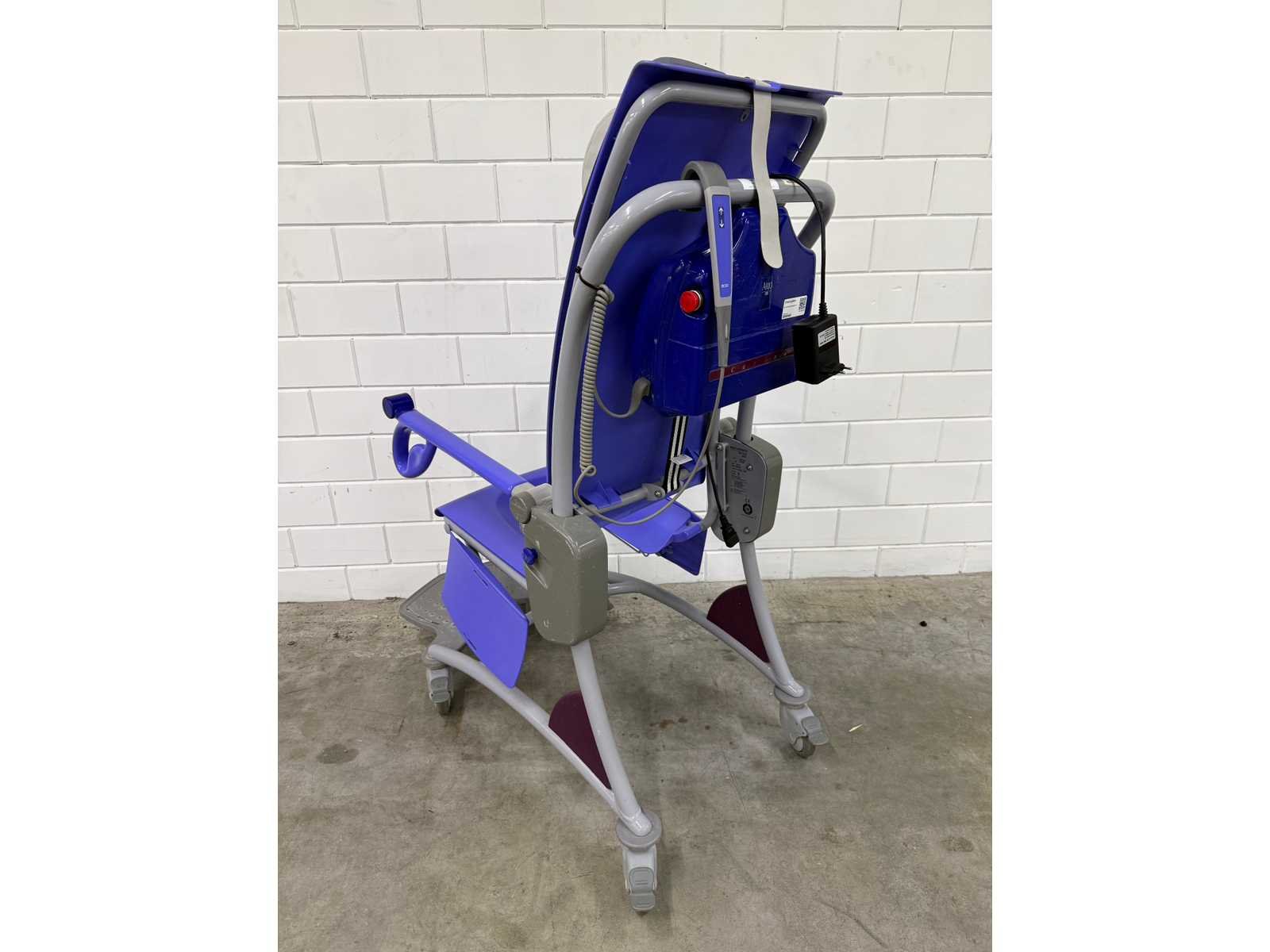 In hoogte verstelbare douchestoel toiletstoel, waarmee één zorgverlener op een ergonomische werkhoogte dagelijkse verzorgingstaken, zoals douchen, toiletgang en pedicure, kan uitvoeren, veilige belasting: 140 kg, gewicht: 42 kg, tilbereik (stoel): 60 cm, hoogte zitting, laagste stand: 88 cm, maximale algehele lengte: 131 cm, maximale algehele breedte: 63 cm Totale hoogte, rechtopstaande stand: 123 cm, totale lengte, rechtopstaande stand: 86 cm, onderstel, max. breedte: 63 cm Merk: Arjo Model: Carino