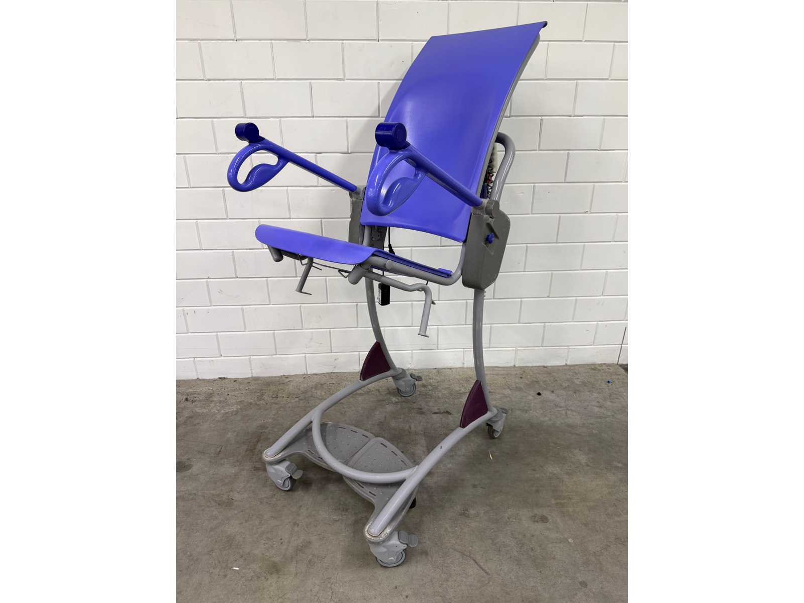 In hoogte verstelbare douchestoel toiletstoel, waarmee één zorgverlener op een ergonomische werkhoogte dagelijkse verzorgingstaken, zoals douchen, toiletgang en pedicure, kan uitvoeren, veilige belasting: 140 kg, gewicht: 42 kg, tilbereik (stoel): 60 cm, hoogte zitting, laagste stand: 88 cm, maximale algehele lengte: 131 cm, maximale algehele breedte: 63 cm Totale hoogte, rechtopstaande stand: 123 cm, totale lengte, rechtopstaande stand: 86 cm, onderstel, max. breedte: 63 cm Merk: Arjo Model: Carino