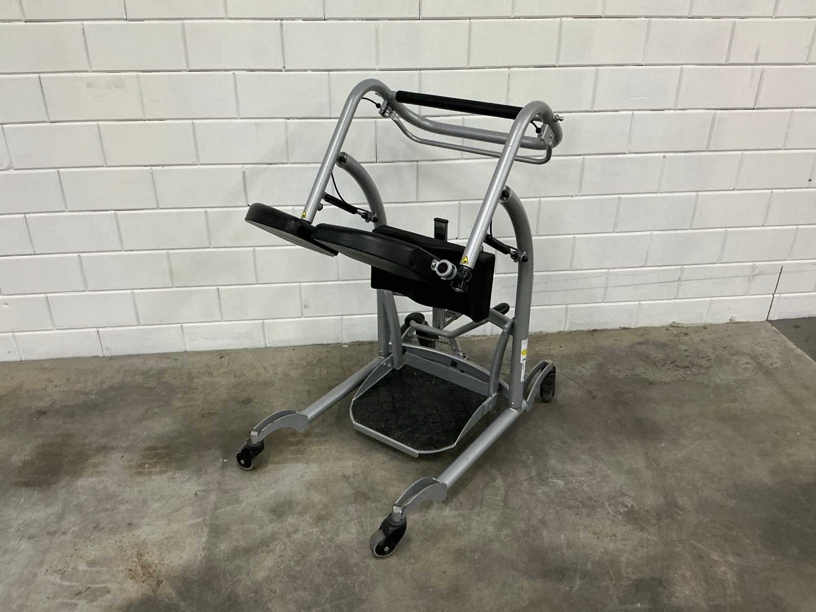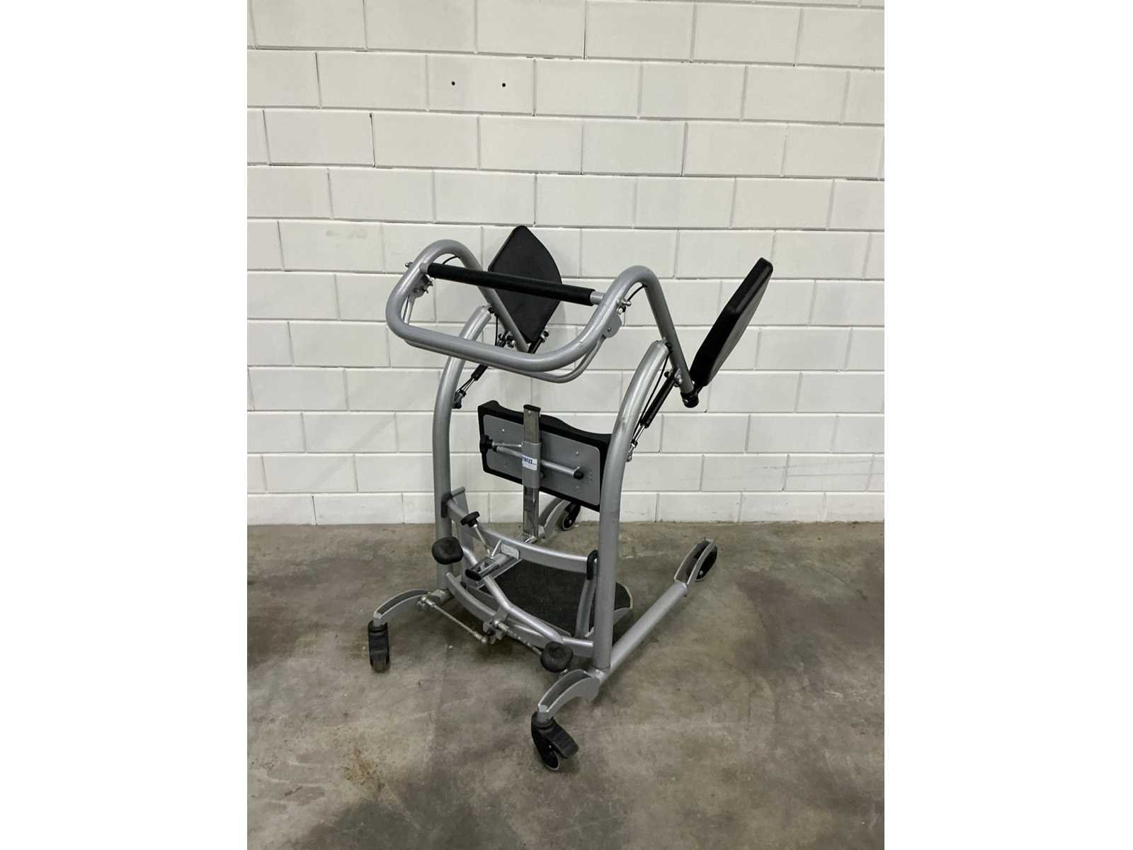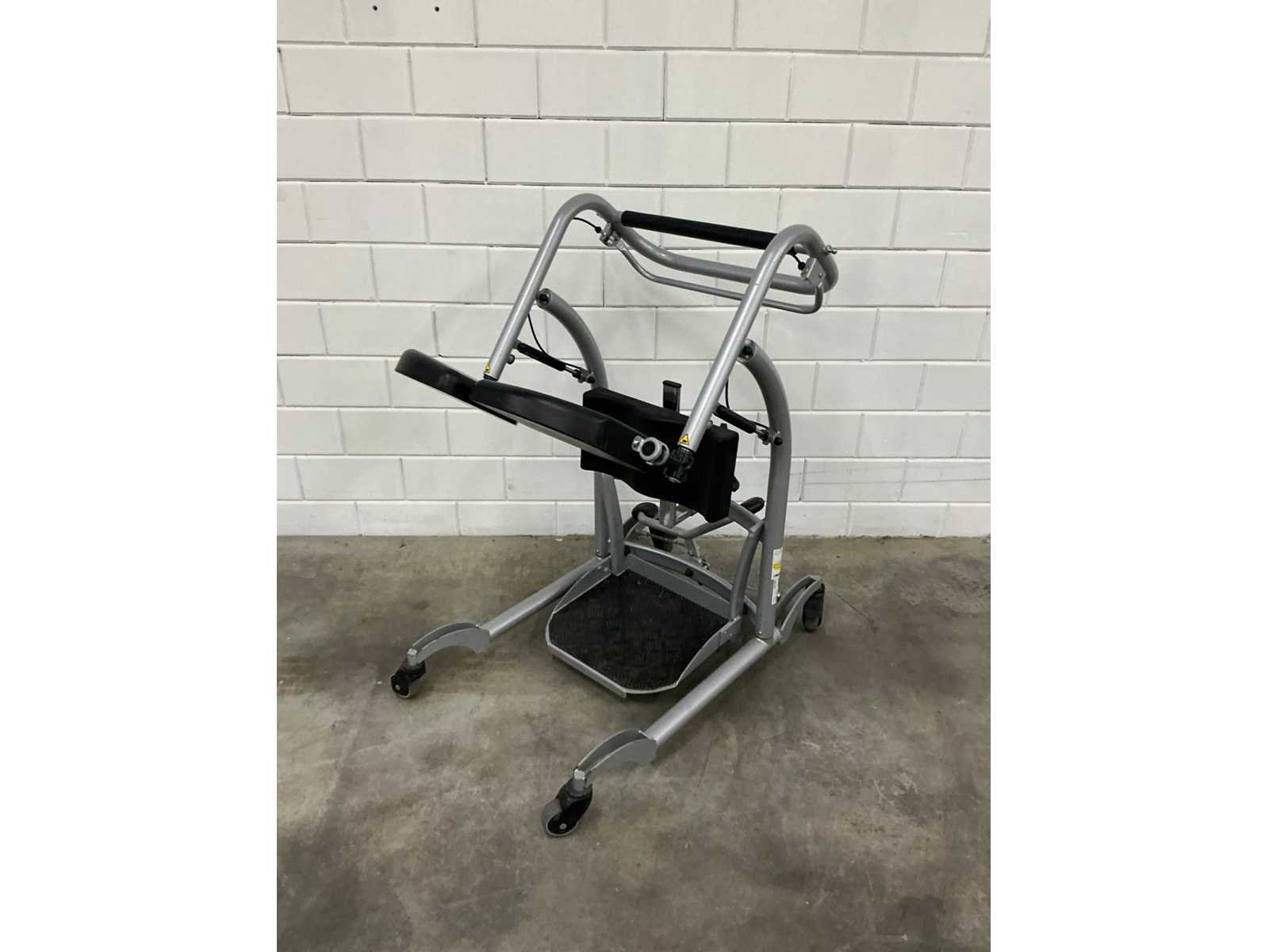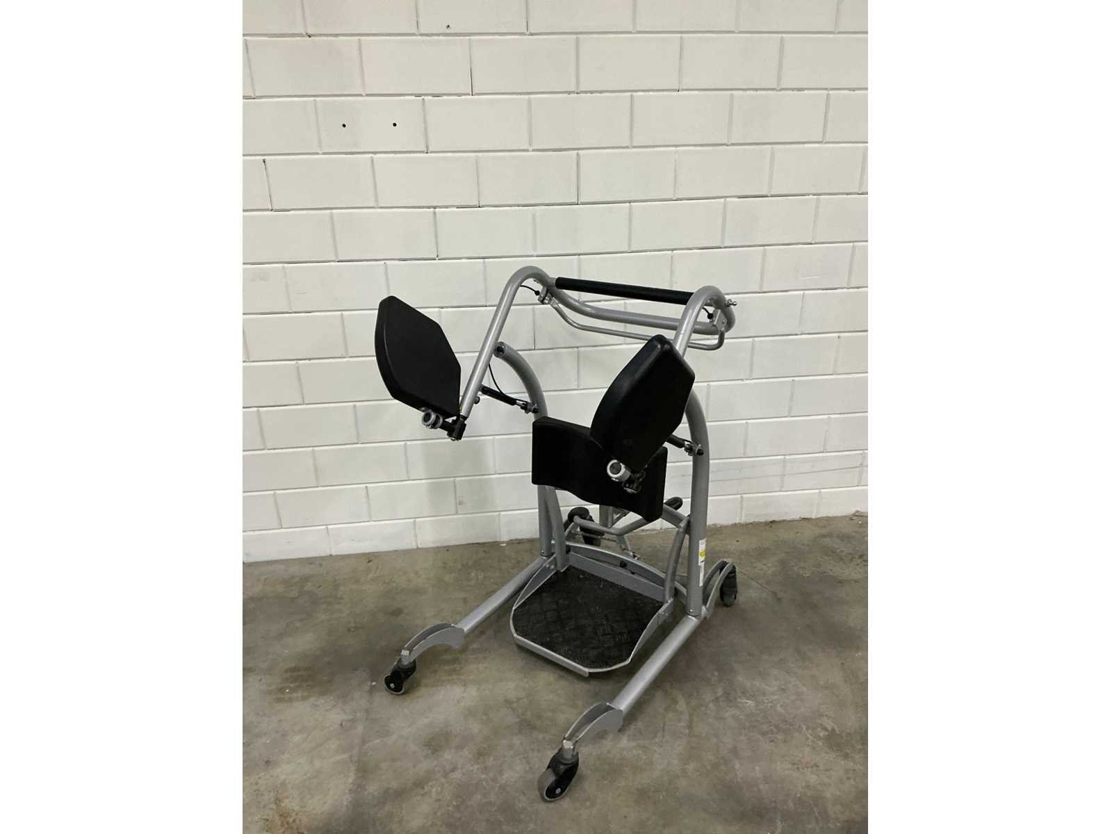 Verrijdbare opstahulp, rvs,maximaal gebruiksgewicht 170 kg., , voorzien van 4 zwenkwielen waarvan 2 geremd Merk: Arjo Huntleigh Model: Quick Move Lengte: 60cm Breedte: 98cm Hoogte: 105cm