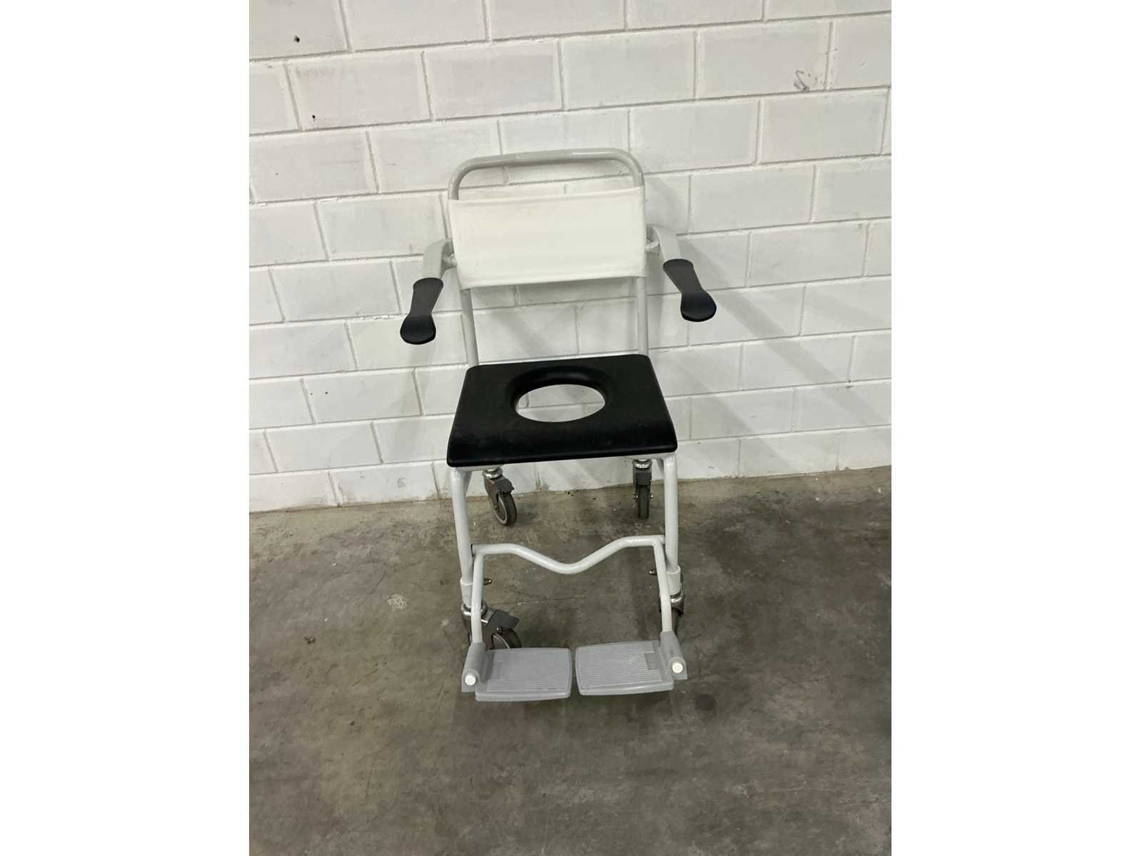 Verrijdbare douchestoel/toiletstoel, zithoogte 53 cm., stalen frame, voorzien van 4 geremde zwenkwielen, inklapbare voet- en armsteunen Merk: Linido Handicare Lengte: 60cm Breedte: 82cm Hoogte: 98cm