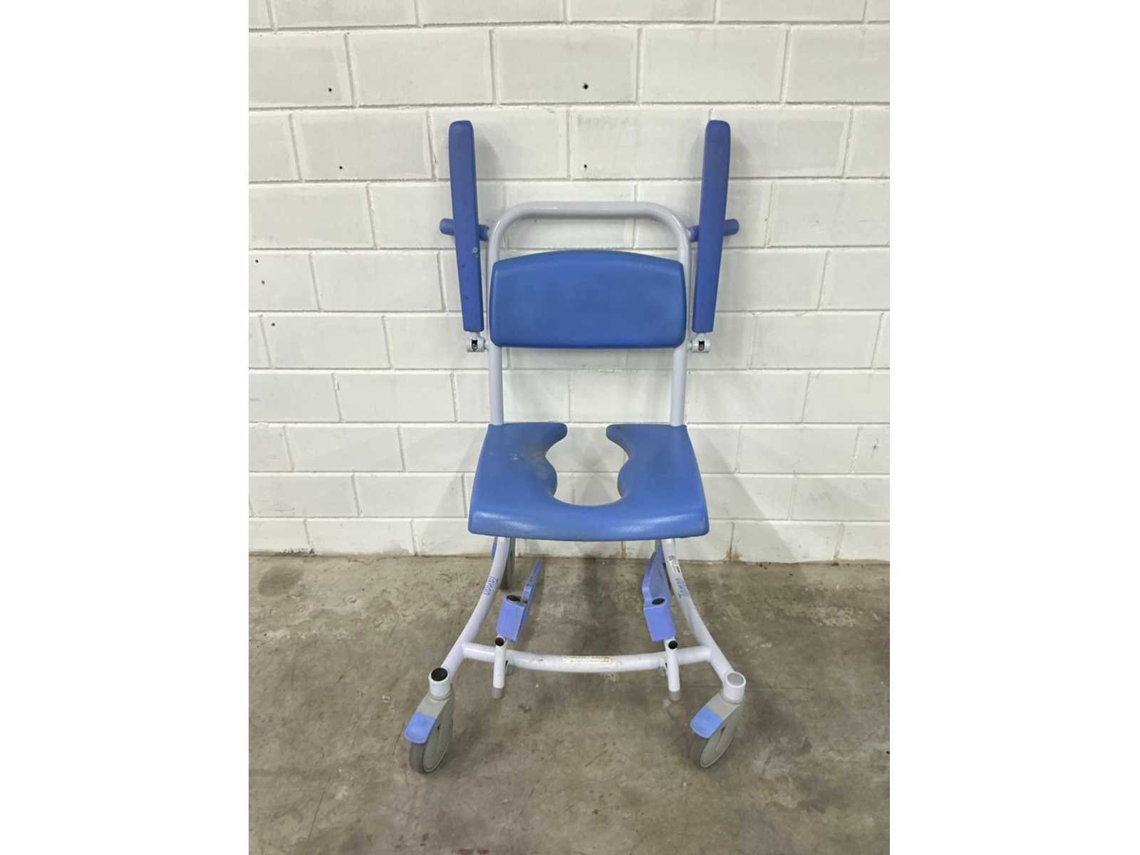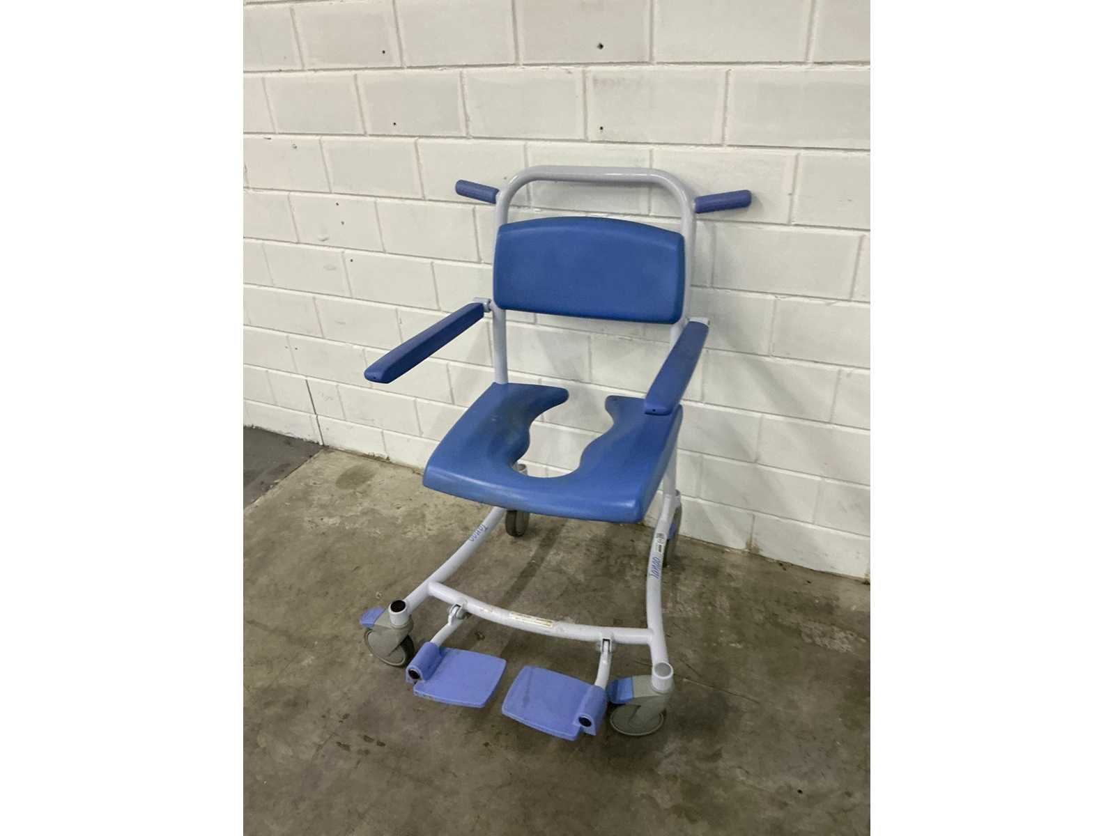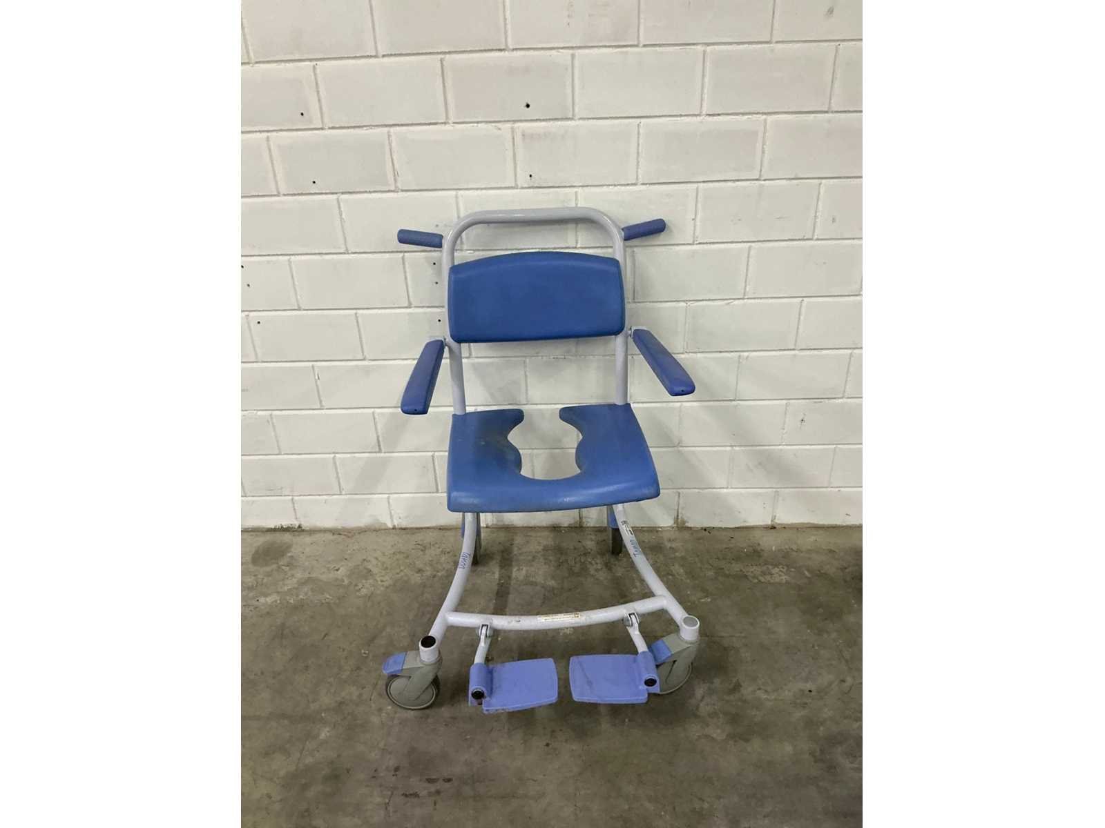 Verrijdbare douchestoel/toiletstoel, zithoogte 53 cm., maximale belasting 180 kg., stalen frame, voorzien van 4 geremde zwenkwielen, inklapbare voet- en armsteunen Merk: Lopital Model: Tango Lengte: 62cm Breedte: 74cm Hoogte: 101cm