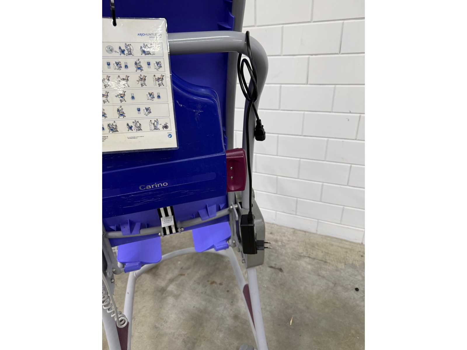In hoogte verstelbare douchestoel toiletstoel, waarmee één zorgverlener op een ergonomische werkhoogte dagelijkse verzorgingstaken, zoals douchen, toiletgang en pedicure, kan uitvoeren, veilige belasting: 140 kg, gewicht: 42 kg, tilbereik (stoel): 60 cm, hoogte zitting, laagste stand: 88 cm, maximale algehele lengte: 131 cm, maximale algehele breedte: 63 cm Totale hoogte, rechtopstaande stand: 123 cm, totale lengte, rechtopstaande stand: 86 cm, onderstel, max. breedte: 63 cm Merk: Arjo Model: Carino