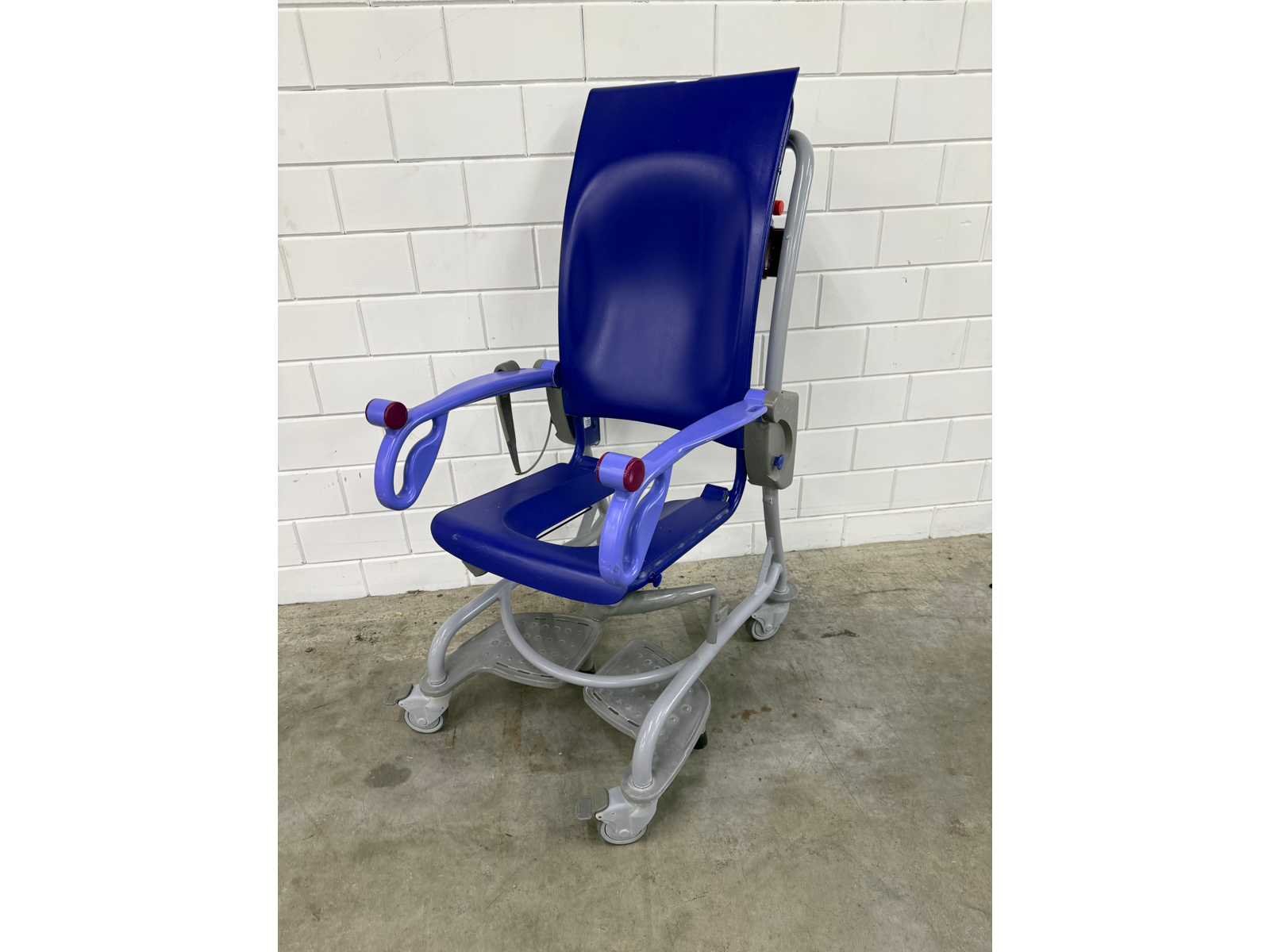 In hoogte verstelbare douchestoel toiletstoel, waarmee één zorgverlener op een ergonomische werkhoogte dagelijkse verzorgingstaken, zoals douchen, toiletgang en pedicure, kan uitvoeren, veilige belasting: 140 kg, gewicht: 42 kg, tilbereik (stoel): 60 cm, hoogte zitting, laagste stand: 88 cm, maximale algehele lengte: 131 cm, maximale algehele breedte: 63 cm Totale hoogte, rechtopstaande stand: 123 cm, totale lengte, rechtopstaande stand: 86 cm, onderstel, max. breedte: 63 cm, adapter ontbreekt Merk: Arjo Model: Carino