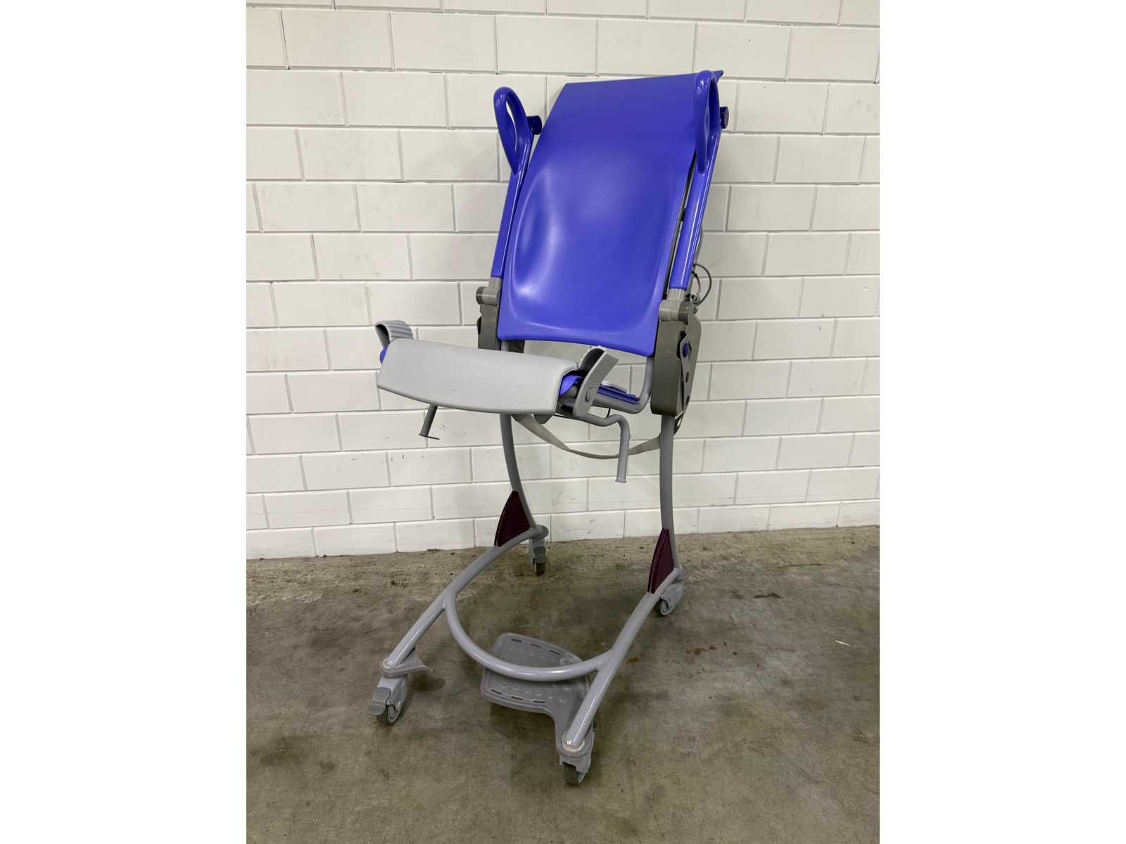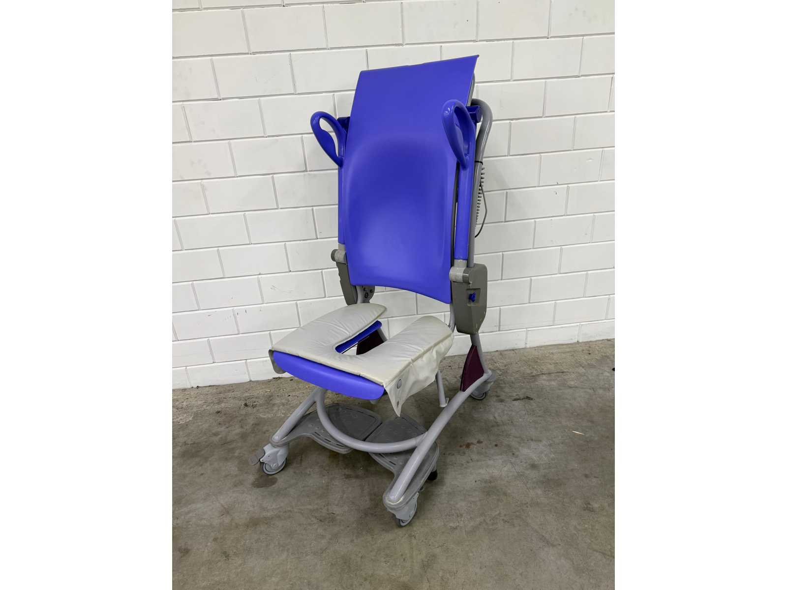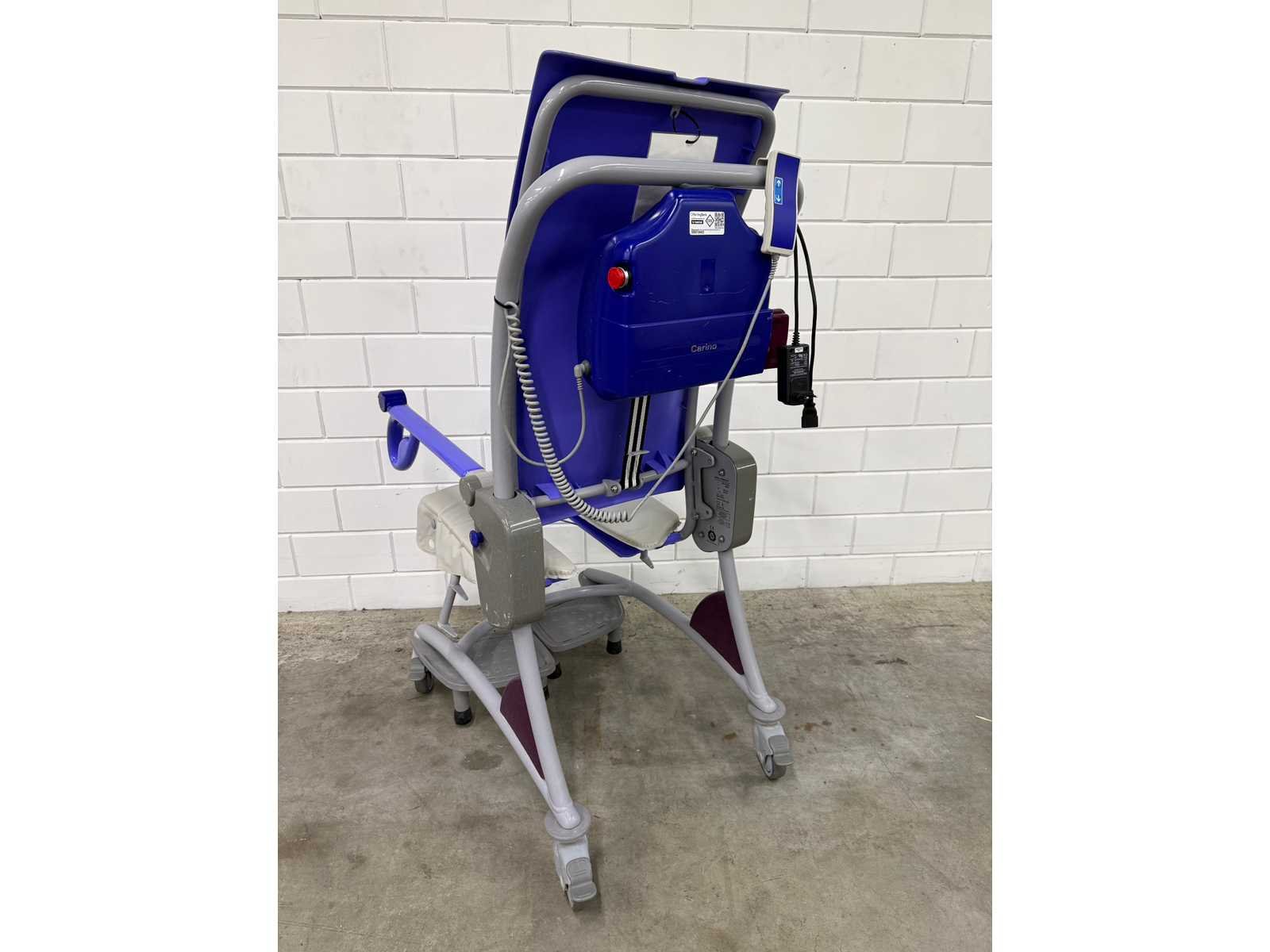 In hoogte verstelbare douchestoel toiletstoel, waarmee één zorgverlener op een ergonomische werkhoogte dagelijkse verzorgingstaken, zoals douchen, toiletgang en pedicure, kan uitvoeren, veilige belasting: 140 kg, gewicht: 42 kg, tilbereik (stoel): 60 cm, hoogte zitting, laagste stand: 88 cm, maximale algehele lengte: 131 cm, maximale algehele breedte: 63 cm Totale hoogte, rechtopstaande stand: 123 cm, totale lengte, rechtopstaande stand: 86 cm, onderstel, max. breedte: 63 cm Merk: Arjo Model: Carino
