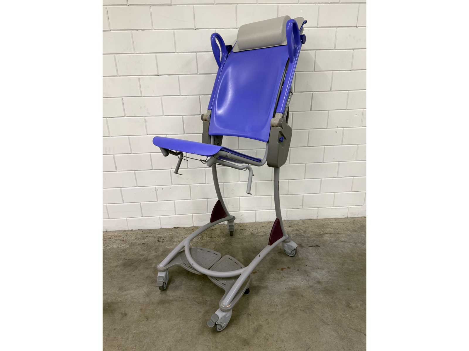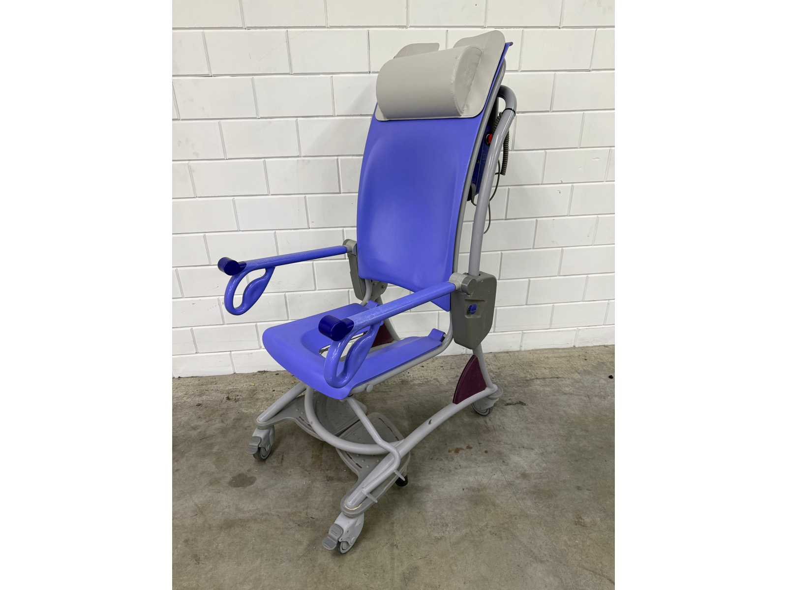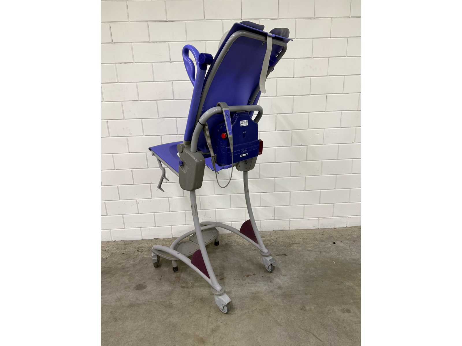 In hoogte verstelbare douchestoel toiletstoel, waarmee één zorgverlener op een ergonomische werkhoogte dagelijkse verzorgingstaken, zoals douchen, toiletgang en pedicure, kan uitvoeren, veilige belasting: 140 kg, gewicht: 42 kg, tilbereik (stoel): 60 cm, hoogte zitting, laagste stand: 88 cm, maximale algehele lengte: 131 cm, maximale algehele breedte: 63 cm Totale hoogte, rechtopstaande stand: 123 cm, totale lengte, rechtopstaande stand: 86 cm, onderstel, max. breedte: 63 cm Merk: Arjo Model: Carino