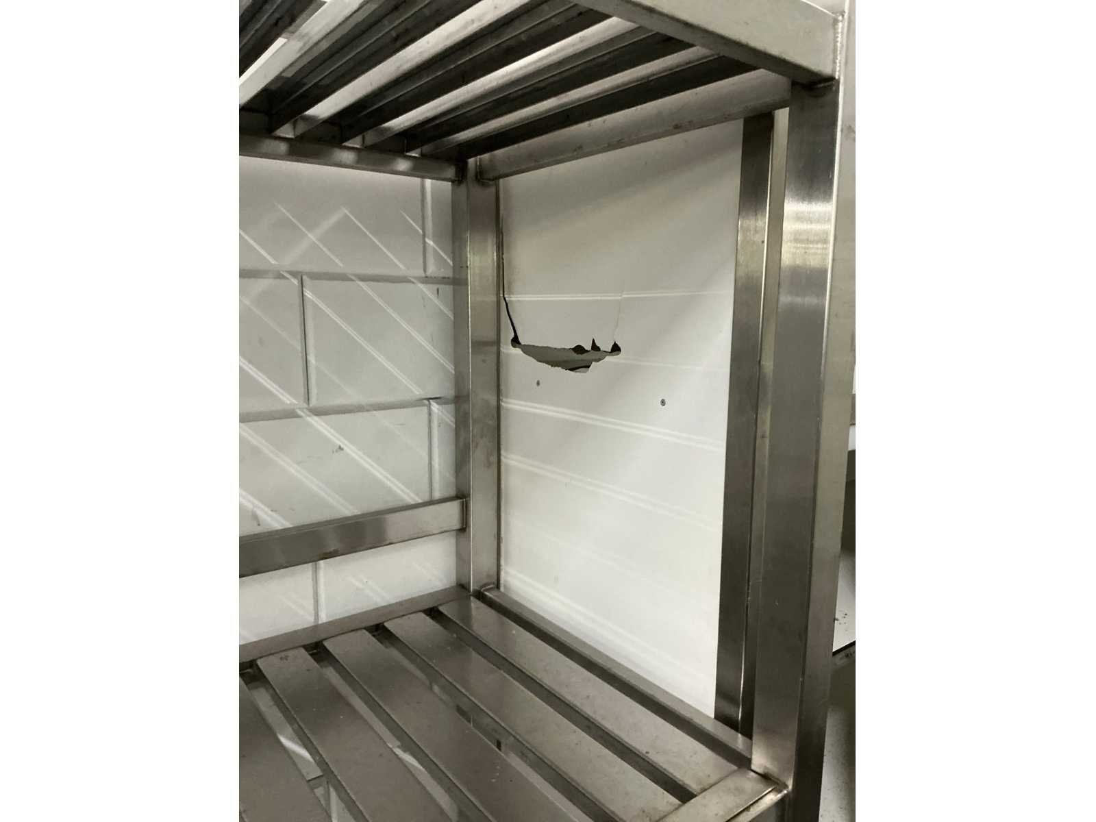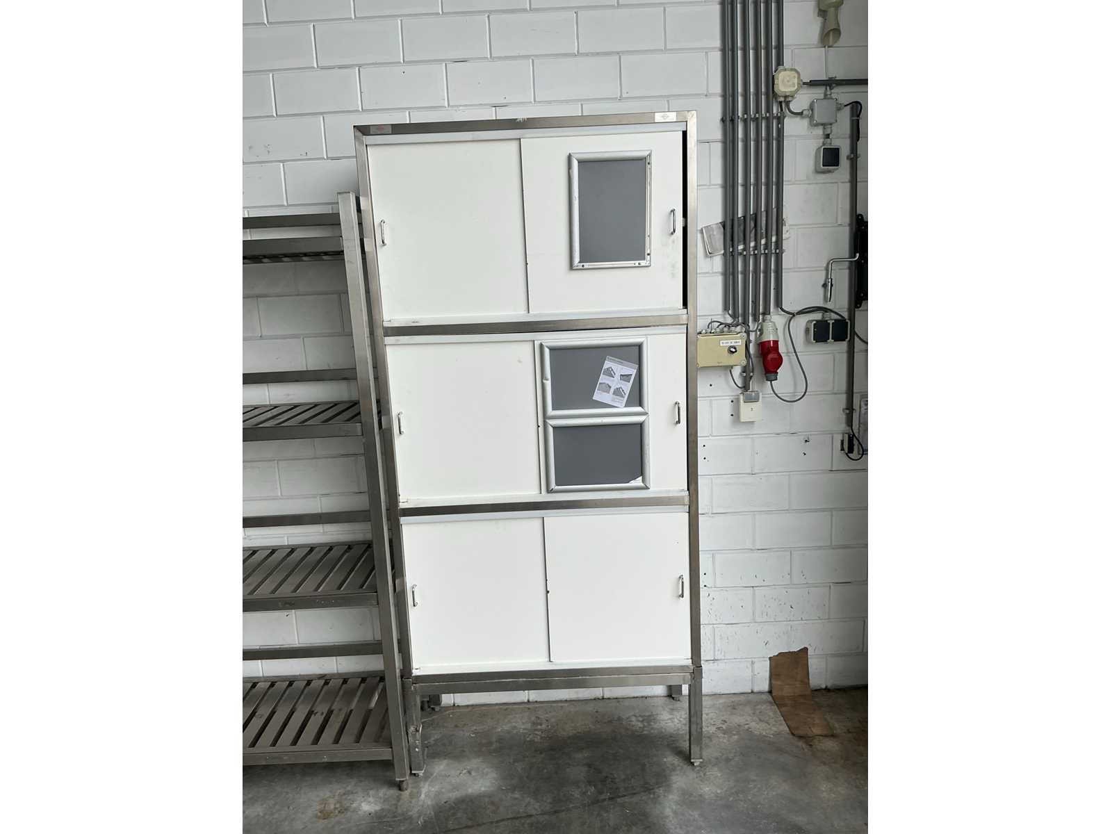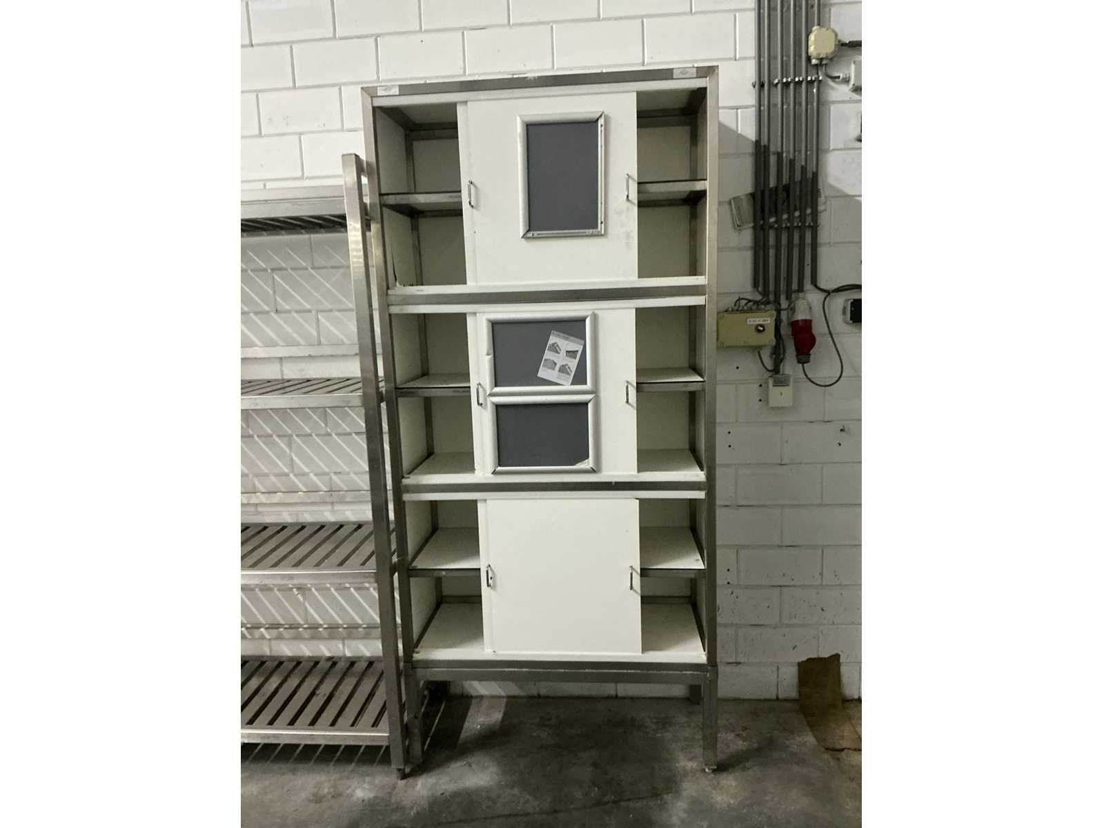 Voorraadkast met 6 schuifdeuren 6 niveaus, rvs frame, trespa Lengte: 99cm Breedte: 42cm Hoogte: 210cm