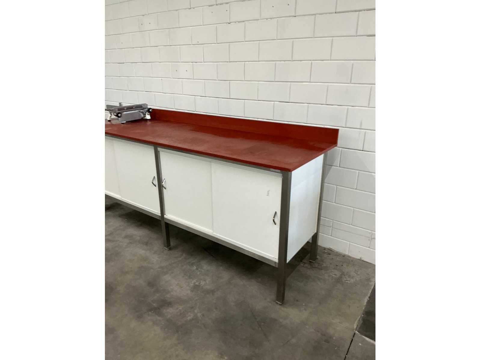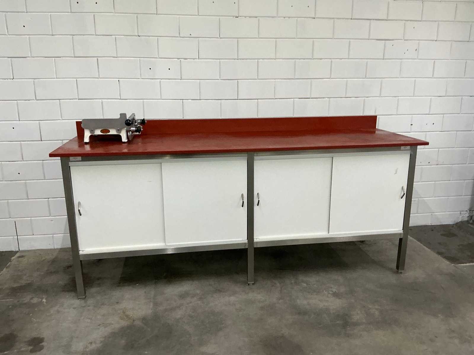 Snijtafel voorzien van kunststof blad, opstaande rand, 4 schuifdeuren en 2 niveaus Merk: Blokvlak Totale afmeting L: 2250mm Totale afmeting Breedte: 700mm Totale afmeting Hoogte: 940mm