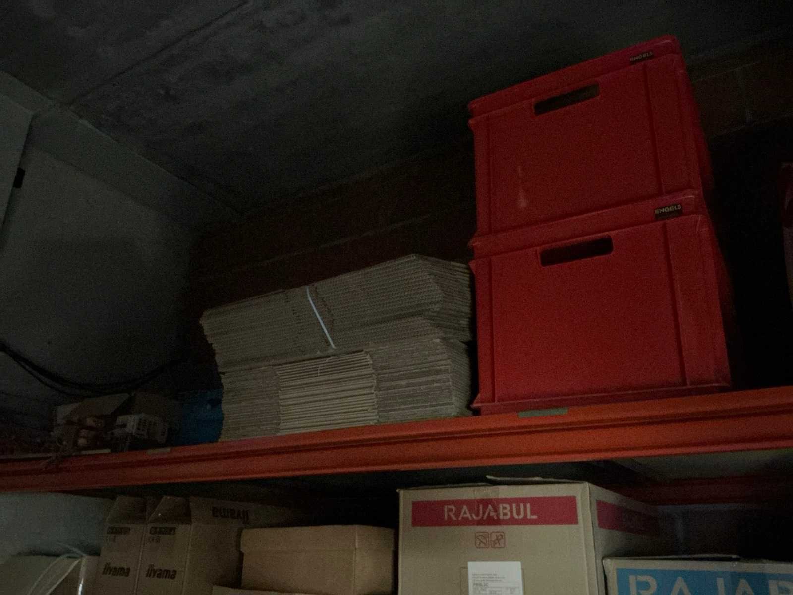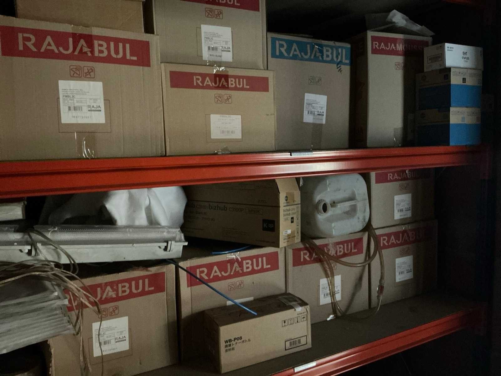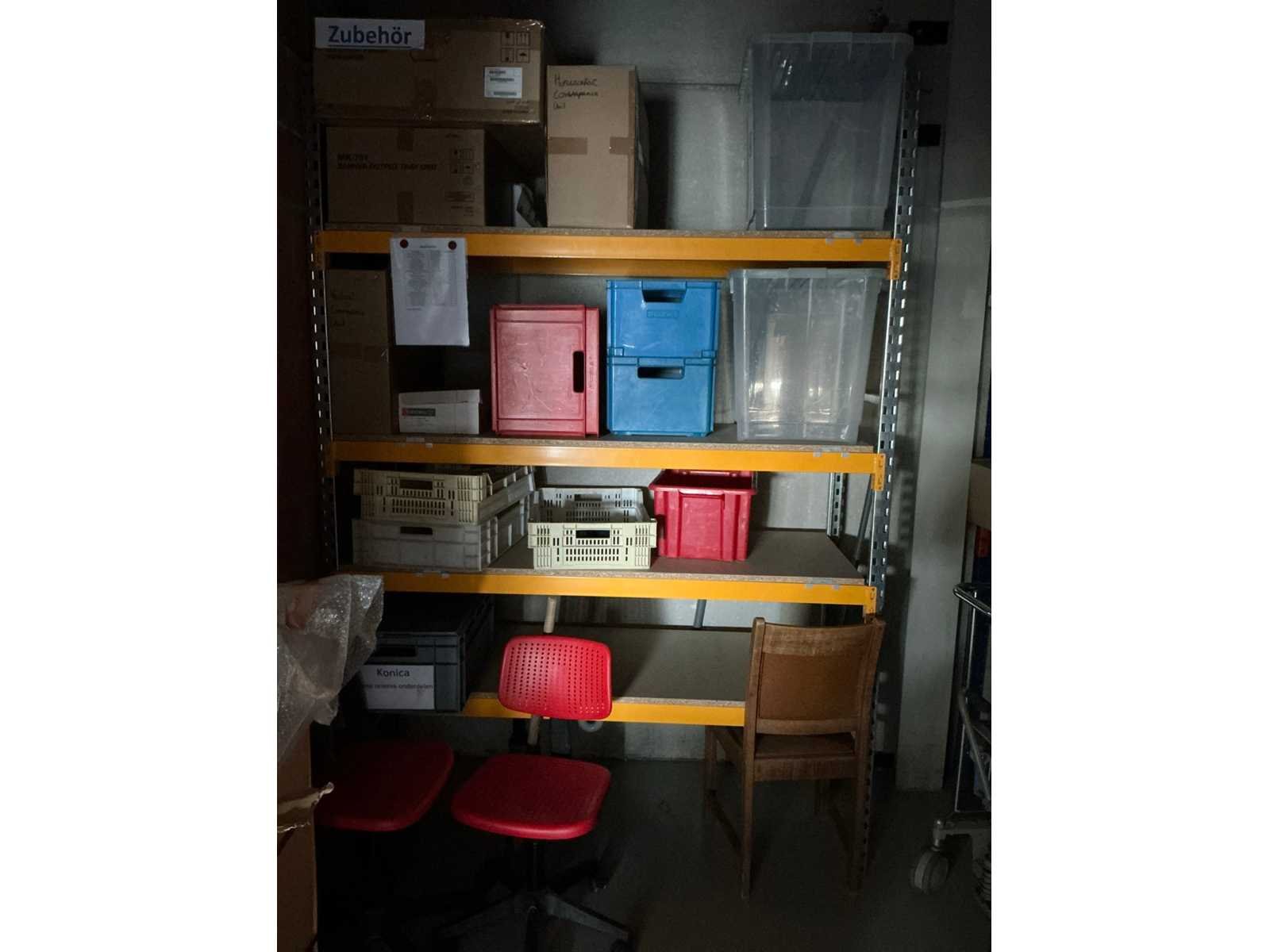 Waaronder bestaande uit: 1 magazijnstelling Provost 1.5 voorzien van 8 leggers en 4 legborden, tot afmeting ca 160 x 60 x 240cm, Inhoudende diverse lege kunststof opbergbakken, 1 magazijnstelling AR voorzien van 6 leggers en 3 legborden, tot afmeting ca 270 x 80 x 250cm, Inhoudende voorraad tape, verpakkingsmateriaal, bubbelenveloppen, nietjes en pouches, Compleet met 2 pvc typistestoelen, 1 alu plooiladder Altrex voorzien van 5 treden, 2 diverse transportplateaus, 1 drankdispenser Jägermeister en 1 drukmachineonderdeel (vermoedelijk defect), Uitgezonderd genummerde kavels en eigendomsvoorbehoud, Afgifte volgens aanwijzing