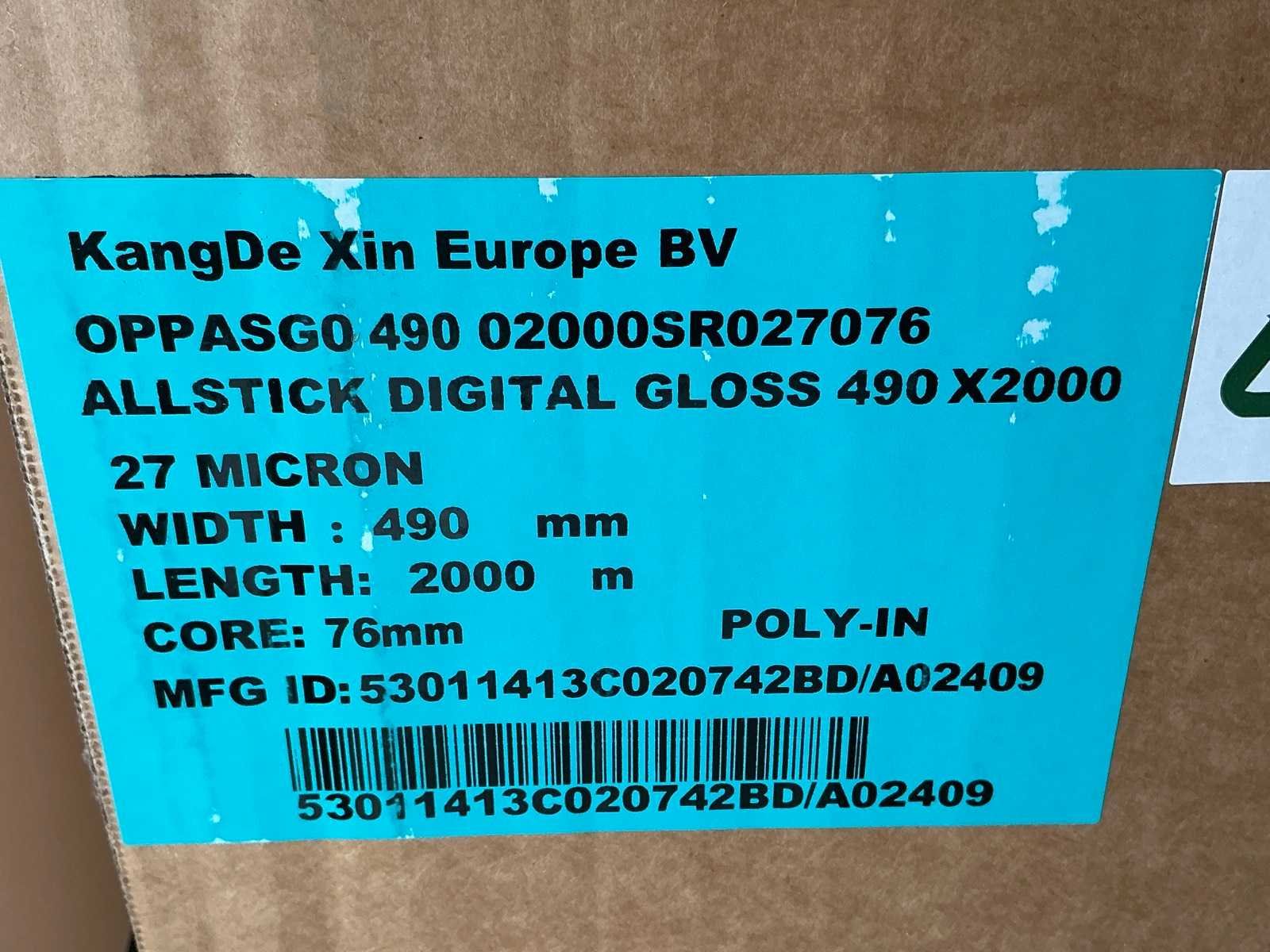 Liggende in gesloten originele verpakking in 6 dozen, Compleet met 7 diverse reeds aangesproken rollen Merk: KDX film Type: Allstick digital gloss Totale afmeting L: 2000000mm Totale afmeting Breedte: 490mm