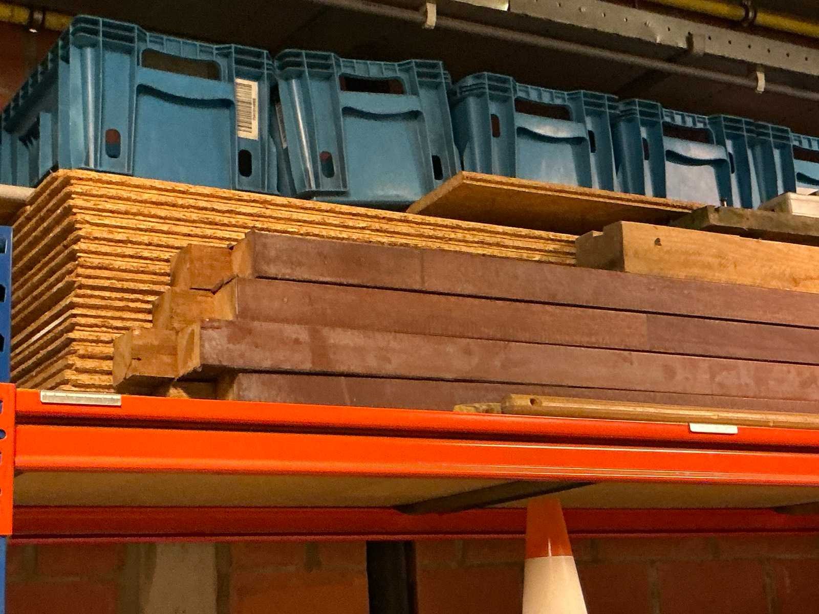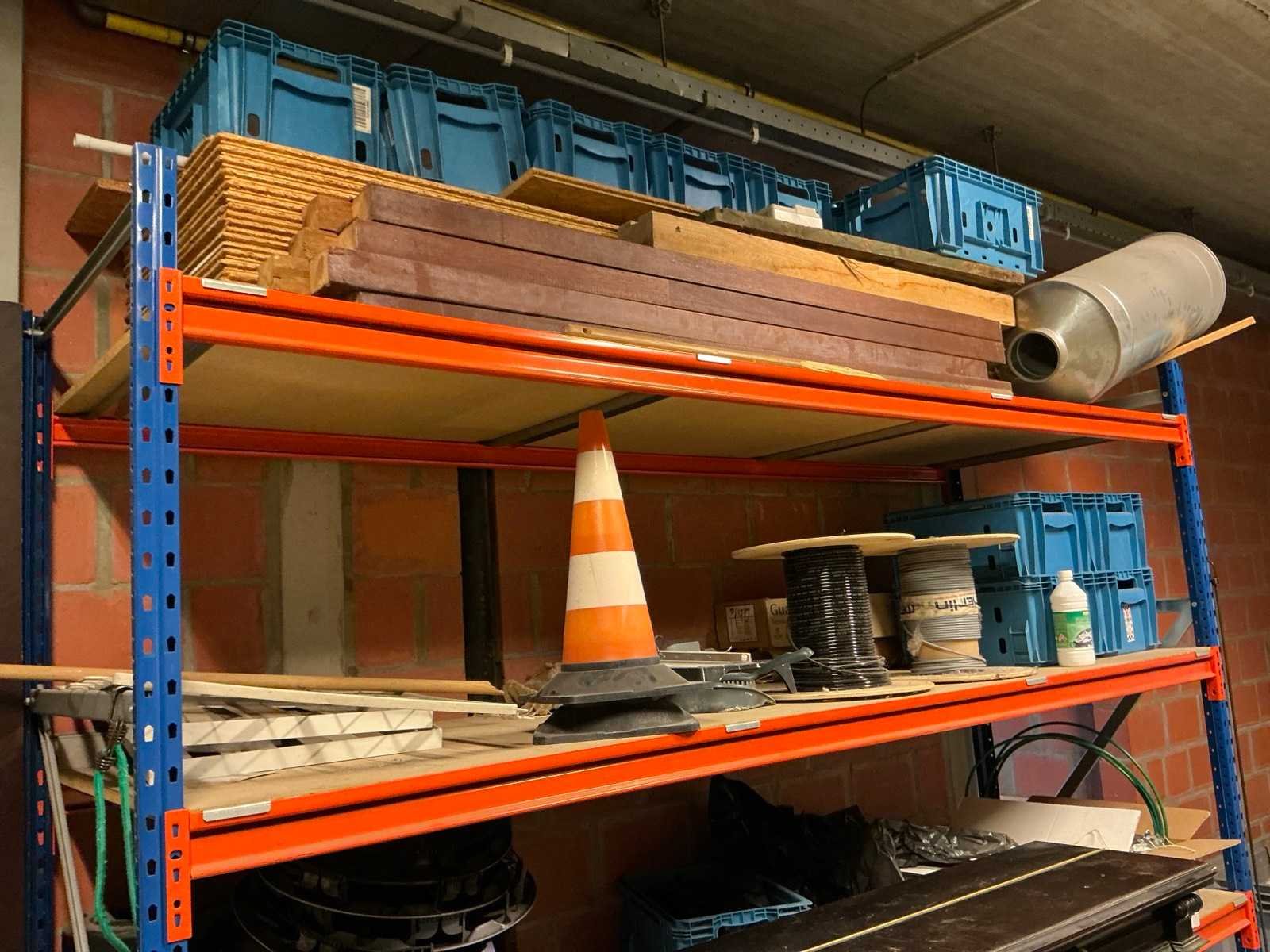 Compleet met inhoud waaronder bestaande uit: 2 verkeersregels, partij OSB platen voorzien van tand en groef, 8 hardhouten balken, 10 pvc stapelbakken, 2 diverse reeds aangesproken bobijnen elektrokabel, enig drukpapier enn3 diverse kunststof mortelkuipen. Uitgezonderd genummerde kavels en eigendomsvoorbehoud, Afgifte volgens aanwijzing Merk: AR Aantal secties: 1 Sectie afm. b: 2700mm Sectie diepte: 800mm Sectie afm. h: 2500mm Aantal staanders: 2 Aantal liggers: 6 Aantal legborden: 3 Demontabel: true Geconstrueerd: true Materiaal: Metaal