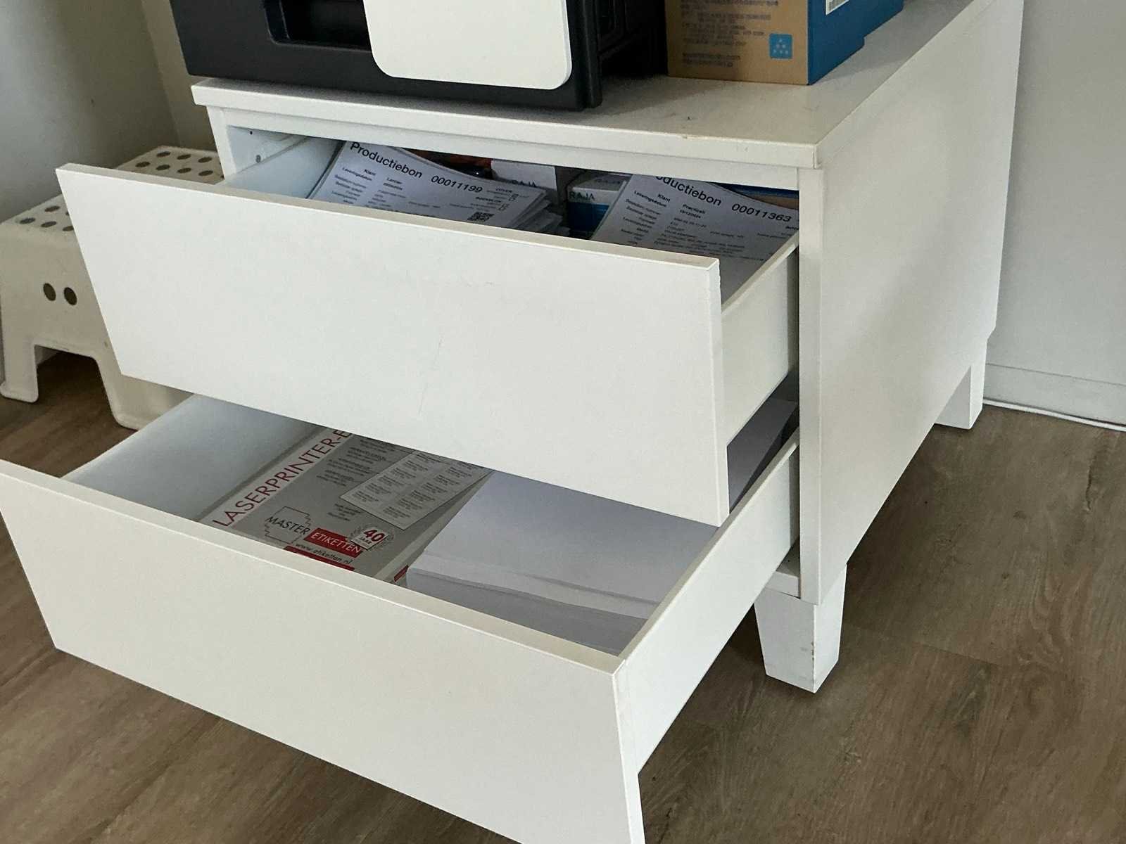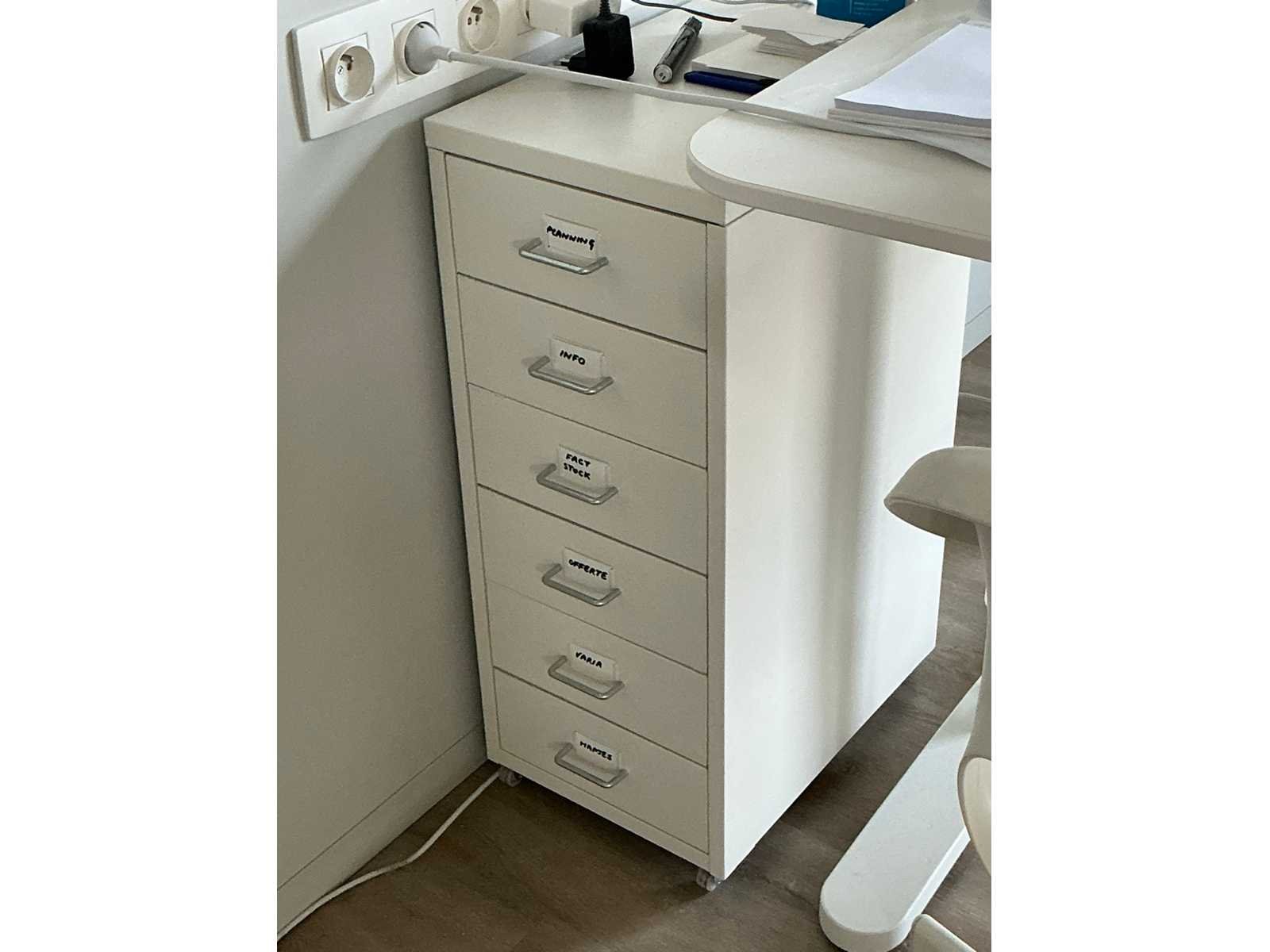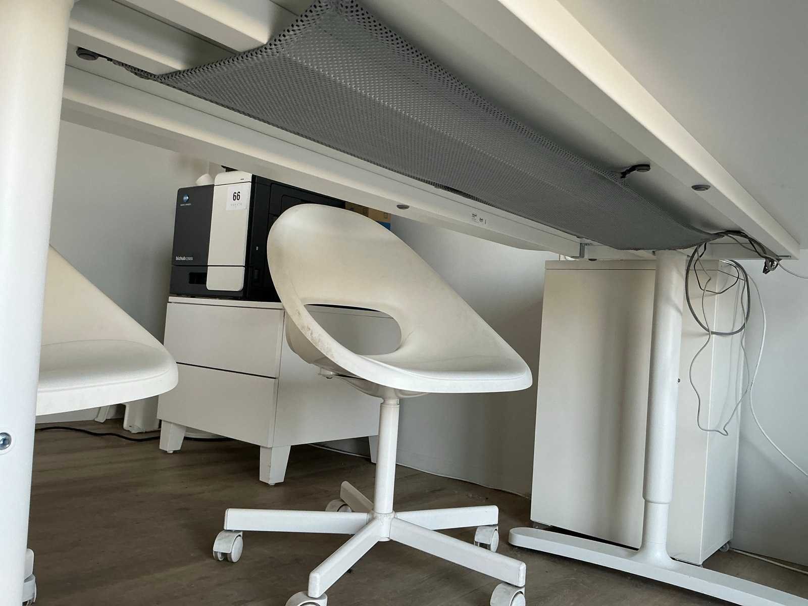 Voorzien van melaminehouten bovenblad en metalen ladekast voorzien van 6 laden, Compleet met stoffen typistestoel, 2 kunststof typistestoelen, 1 bureaulampje, 2 vloerlampen voorzien van 3 lichtpunten, 4 diverse metalen opbergkastjes en 1 fineerhouten ladekast voorzien van 2 laden, Locatie: 1e verdiep Lengte: 160cm Breedte: 80cm Hoogte: 76cm Materiaal: Metaal