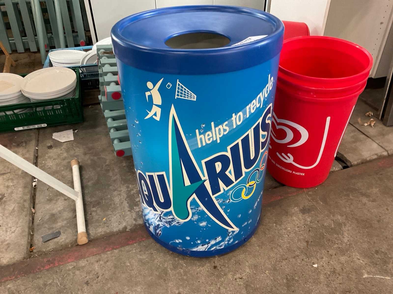Ton voor drank en 3 vuilbakken met klapdeksel Merk: Aquarius en Ola