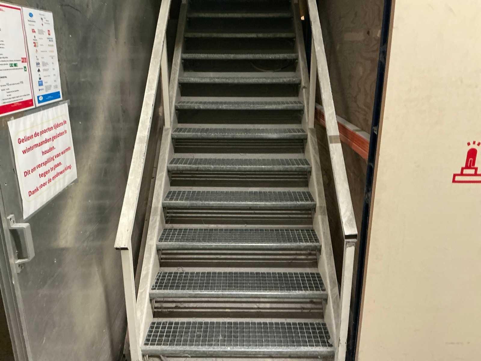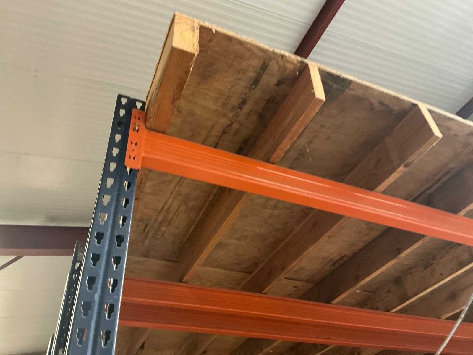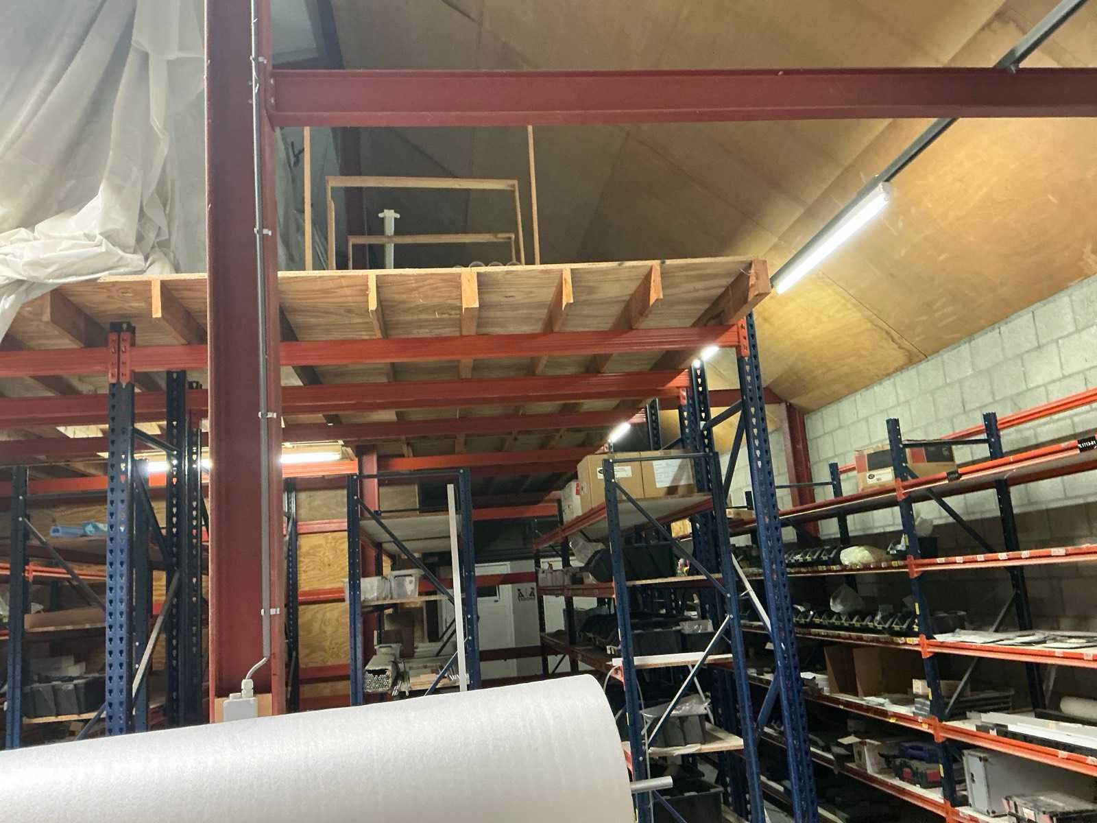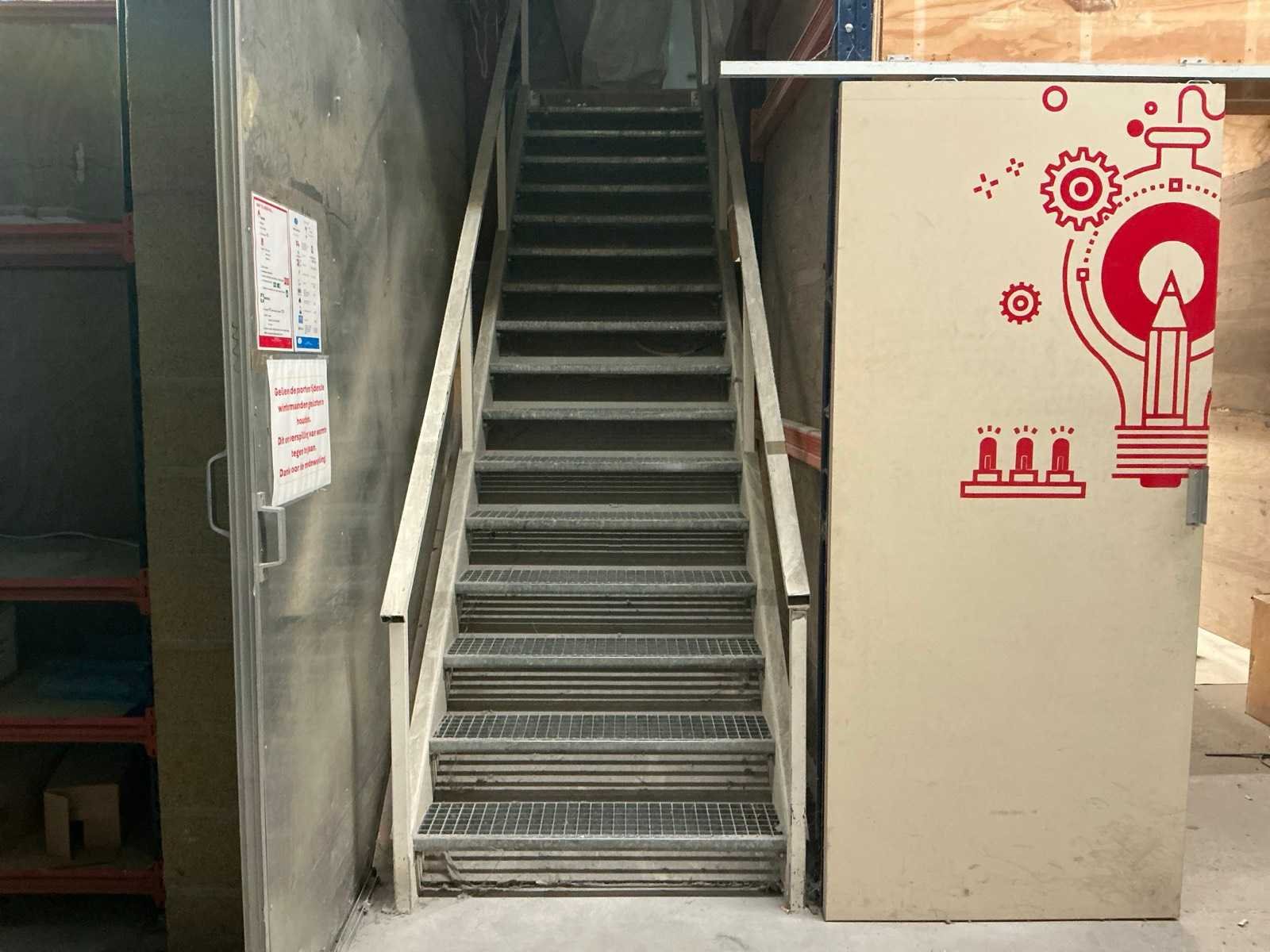 Opgebouwd uit palletstellingen en houten bordesvloer/ bestaande uit: 18 staanders ( 90x300cm); 54 liggers met lengte 270cm/ inclusief: mobiele Profielstalen constructietafel; archiefkast met verfresten; 1 koelkast Zanker/ te demonteren door koper/ opgepast: magazijnstellingen onder bordes NIET INBEGREPEN. Totale afmeting L: 11500mm Totale afmeting Breedte: 9000mm Totale afmeting Hoogte: 3000mm Vloerhoogte: 3000mm Houten vloer: true Met trap: true