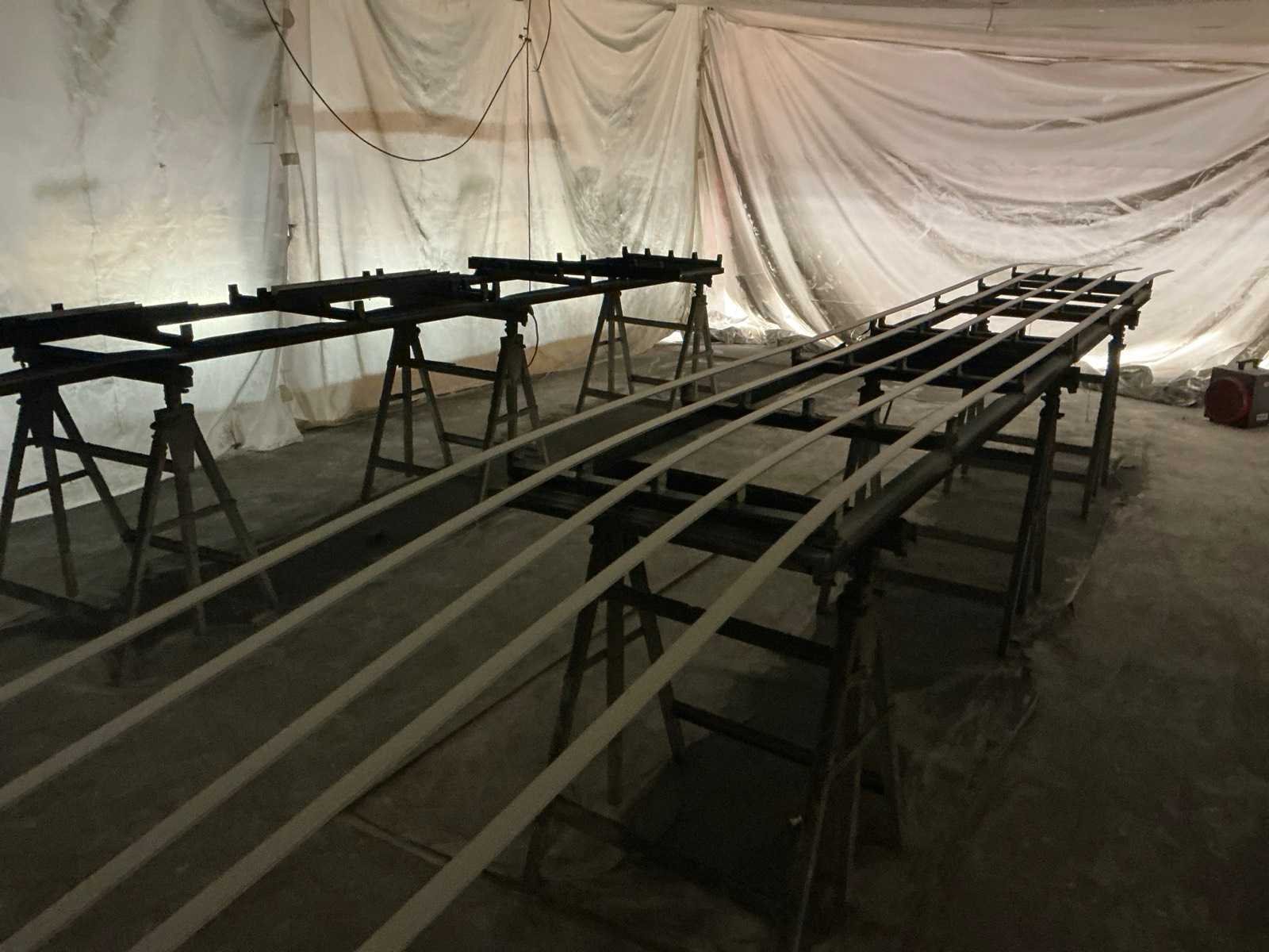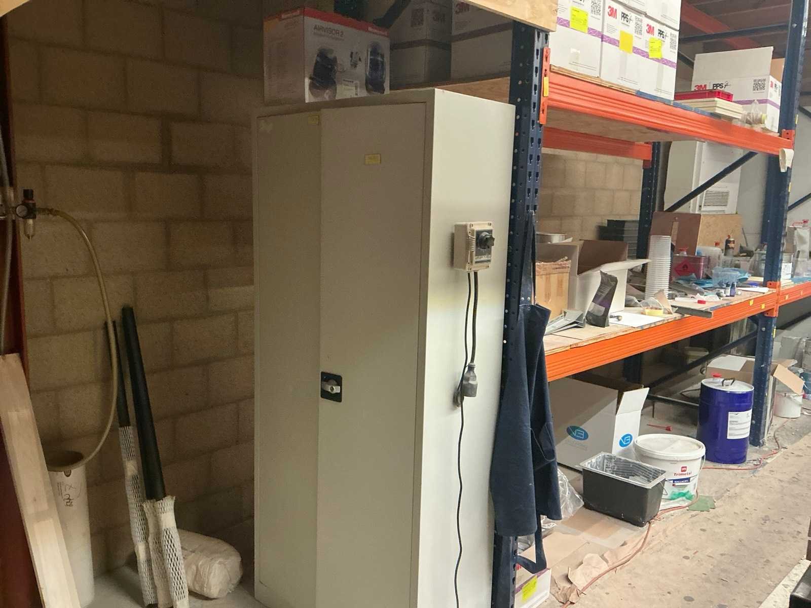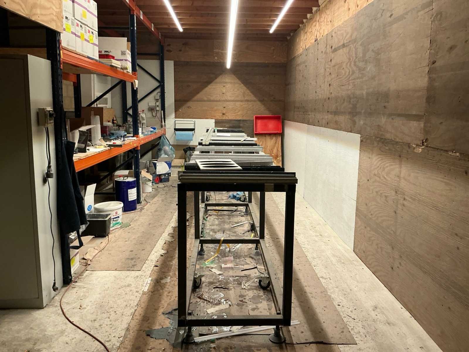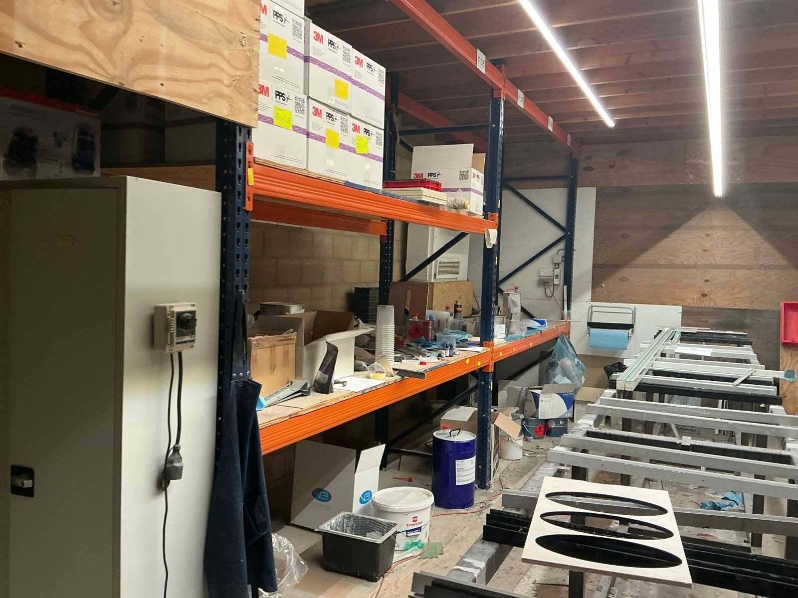 Opgebouwd uit palletstellingen en houten bordesvloer/ bestaande uit: 18 staanders ( 90x300cm); 54 liggers met lengte 270cm/ inclusief: mobiele Profielstalen constructietafel; archiefkast met verfresten; 1 koelkast Zanker/ te demonteren door koper/ opgepast: magazijnstellingen onder bordes NIET INBEGREPEN. Totale afmeting L: 11500mm Totale afmeting Breedte: 9000mm Totale afmeting Hoogte: 3000mm Vloerhoogte: 3000mm Houten vloer: true Met trap: true