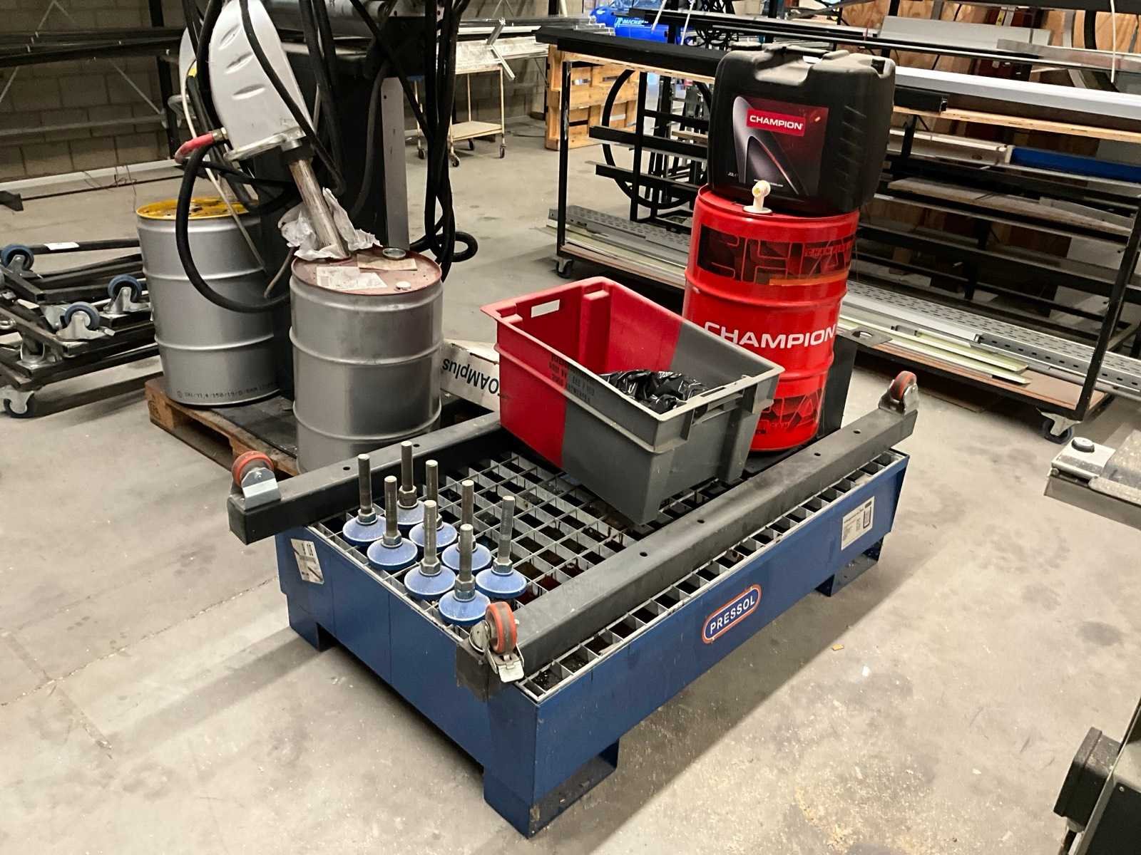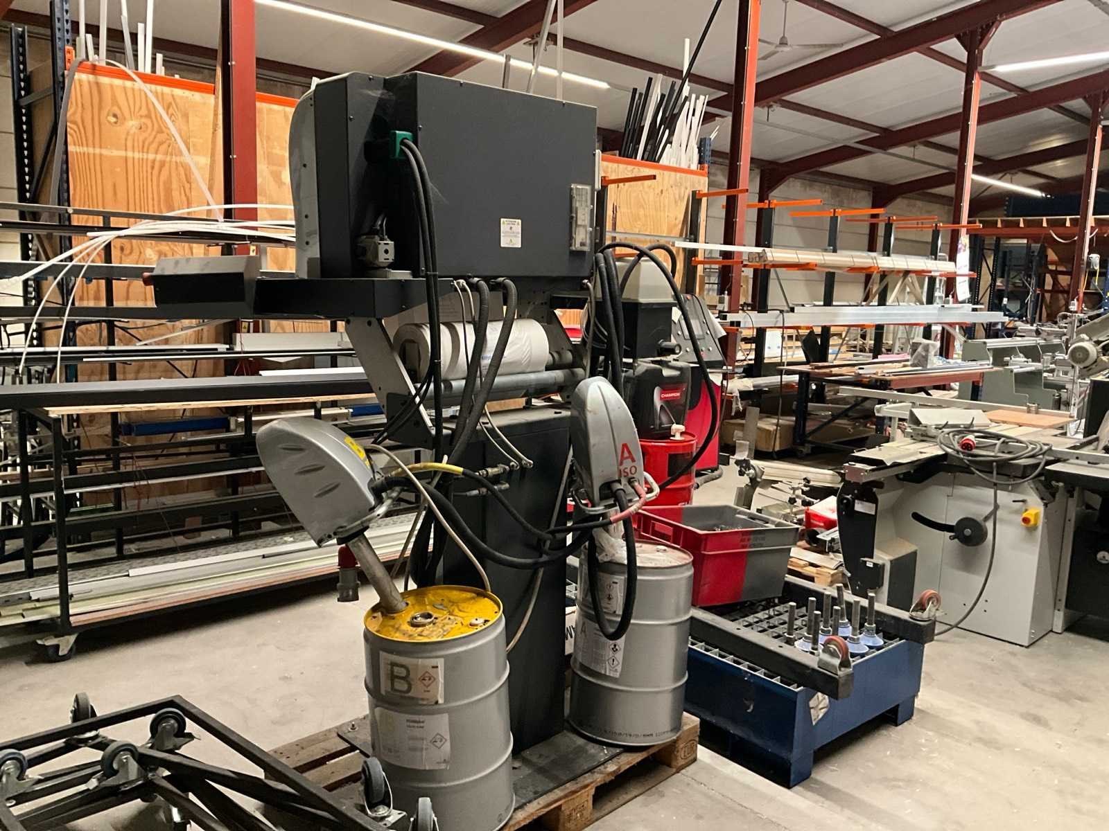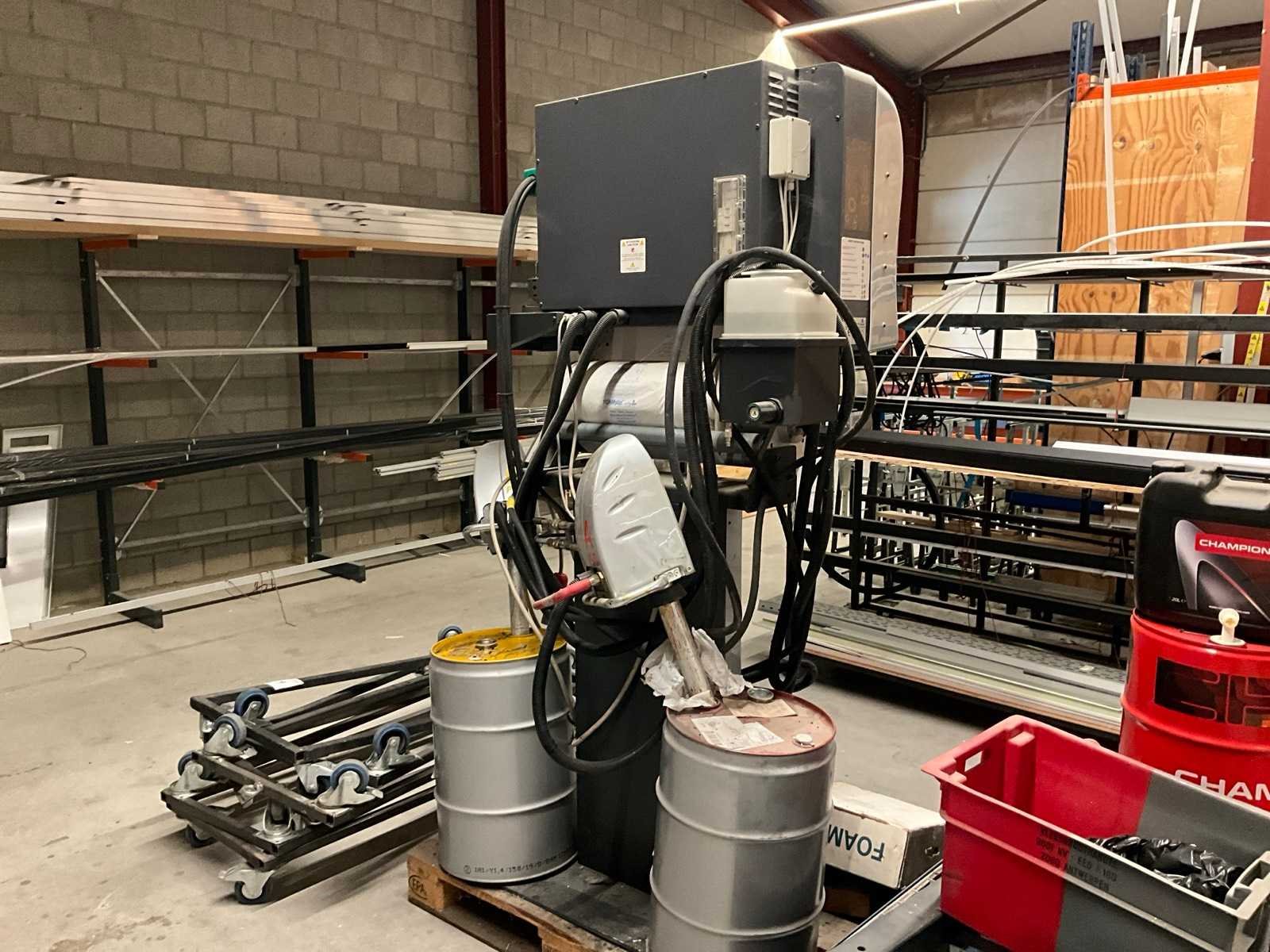 Voorzien van bedieningspaneel, 2x doseerpomp met 2x vat 60 liter producten, rol folie, +lekbak 1000x1300 mm met 2x ketel + mobiel onderstel, Merk: Storopack Type: MD50 Foamplus Bouwjaar: 2006 Serienummer: 0050 Aansluiting: 400V Totale afmeting L: 1000mm Totale afmeting Breedte: 1400mm Totale afmeting Hoogte: 2000mm