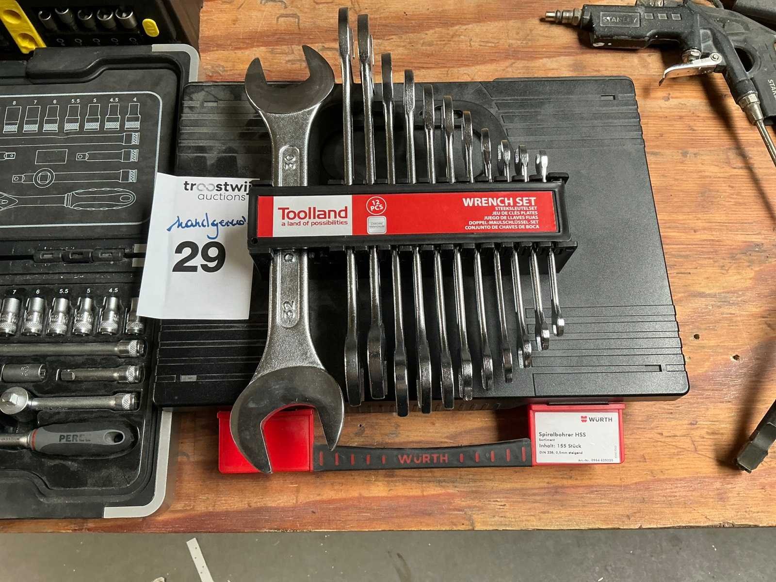 Bestaande uit diverse schroevendraaiers en steeksleutels waaronder TOOLLAND, tang, 3 diverse spuitpistolen, enzovoort