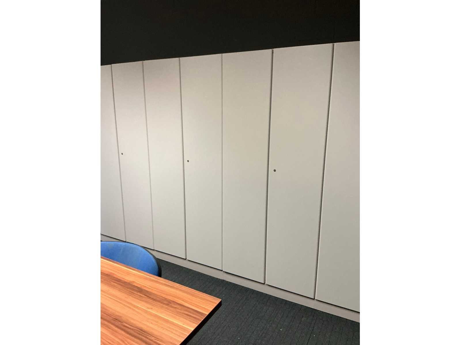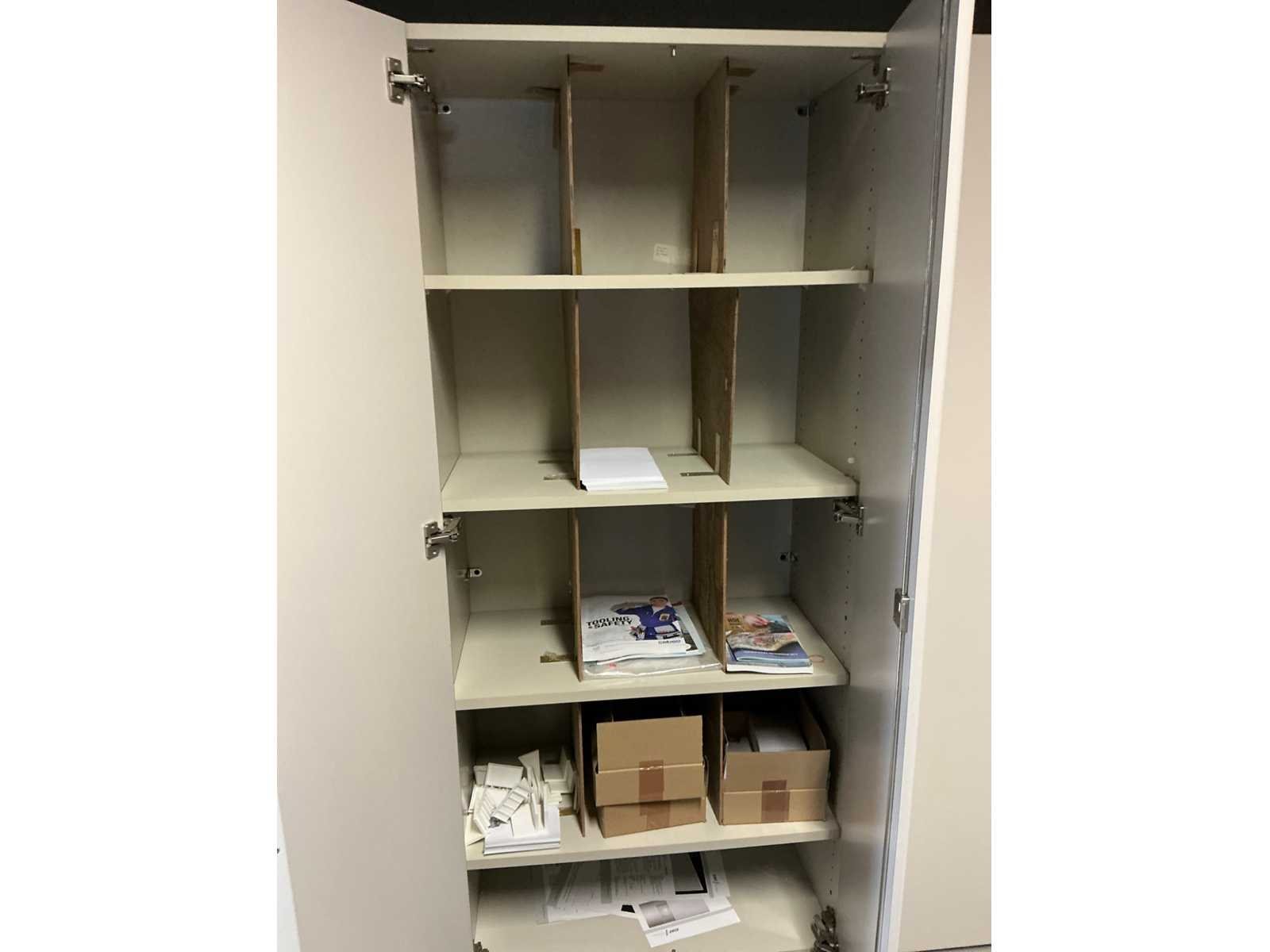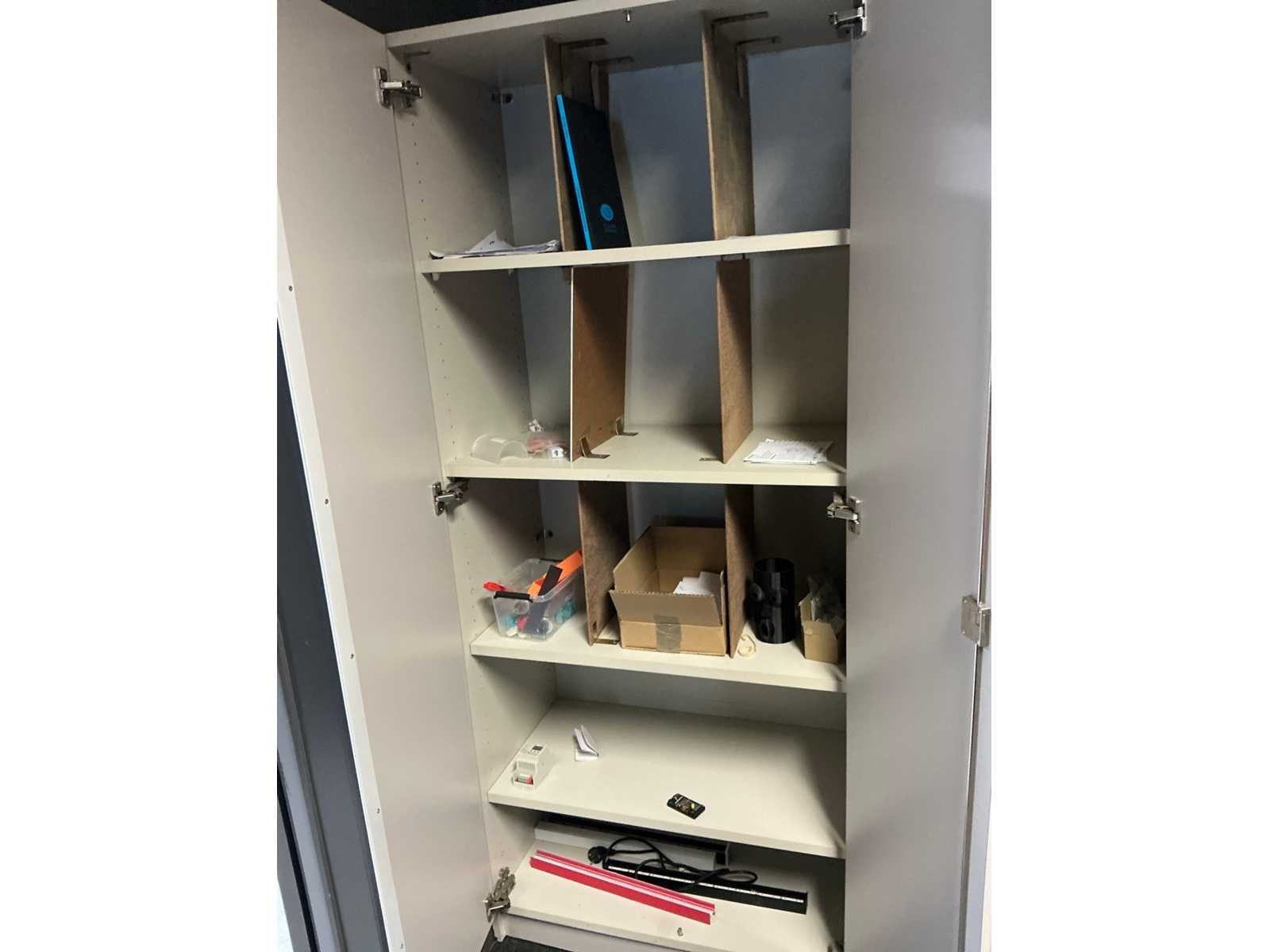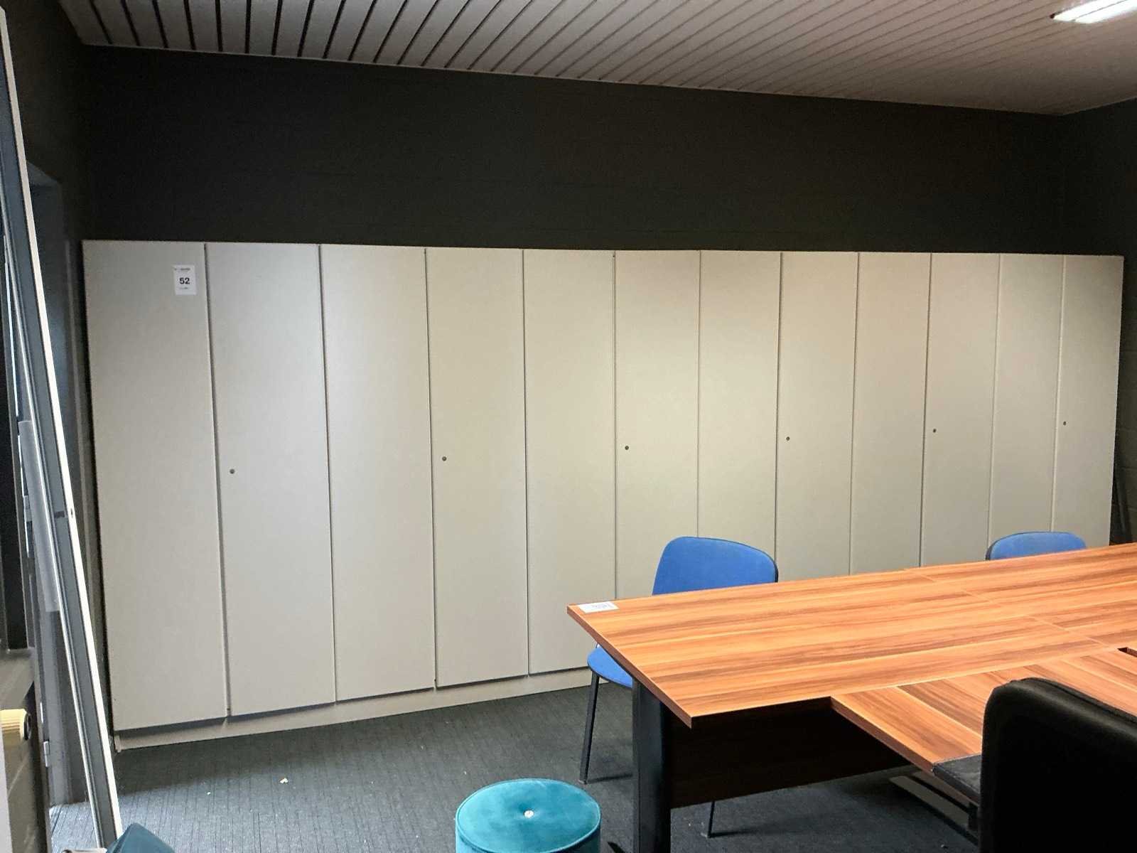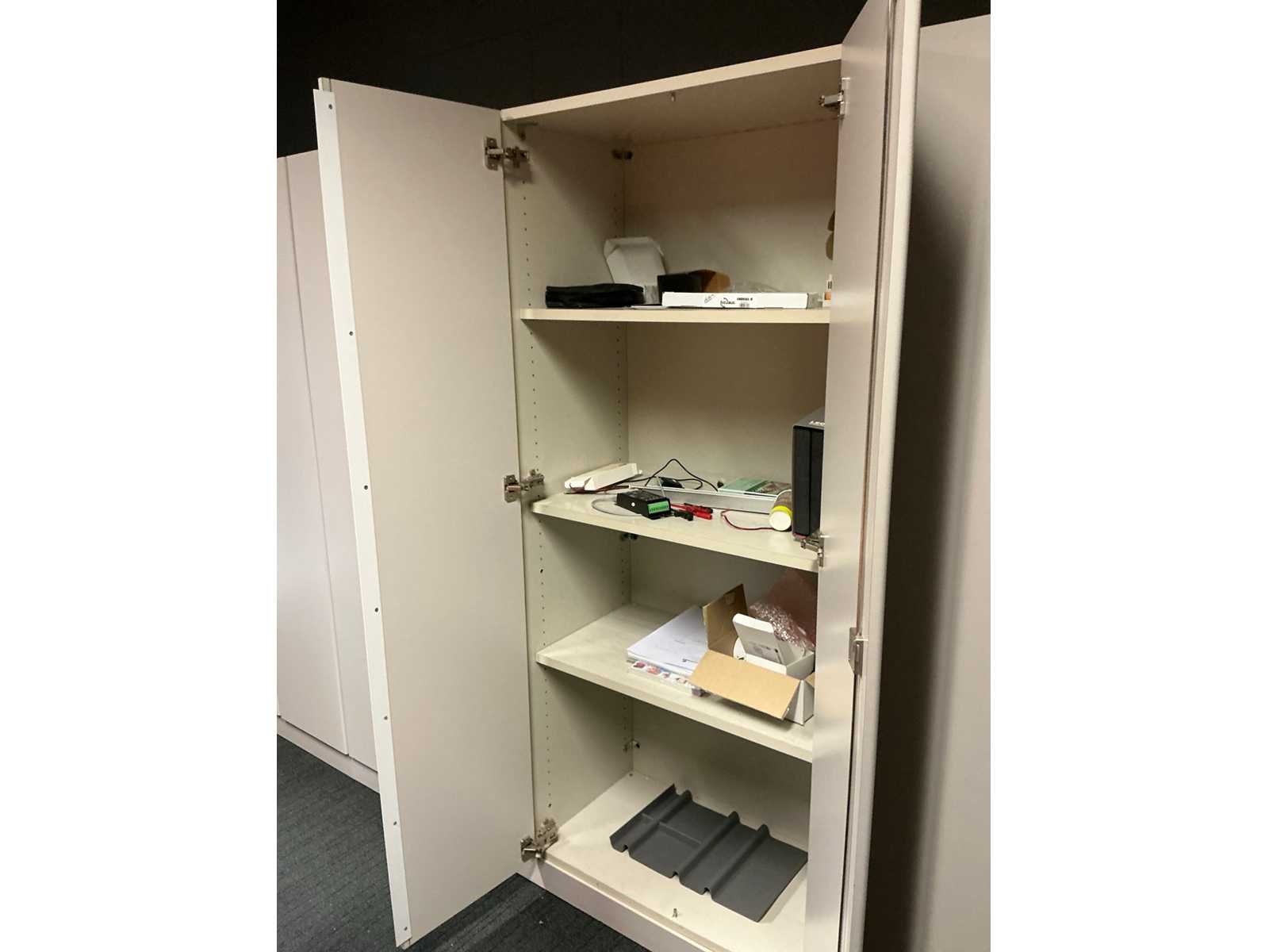 Voorzien van 12x kastdeur en elk voorzien van 4x legplank. Door koper te demonteren/verplaatsen van omgeving. Met inhoud. Lengte: 480cm Breedte: 40cm Hoogte: 187cm