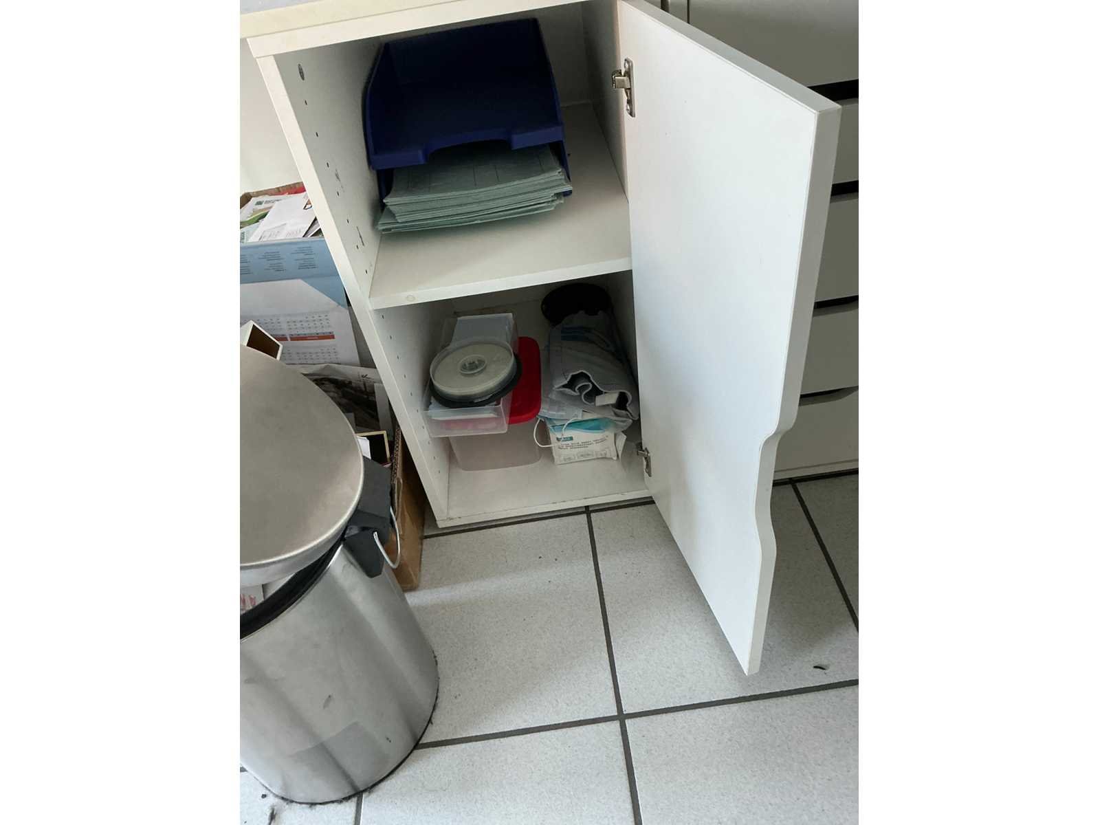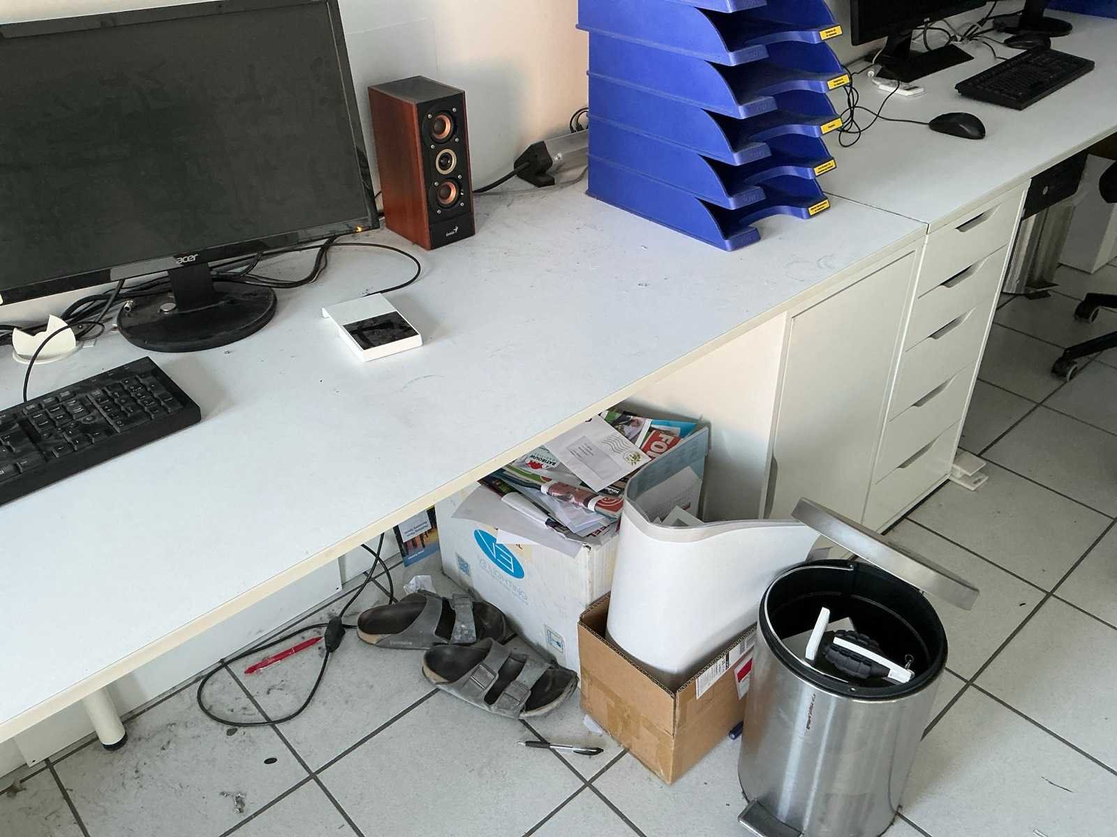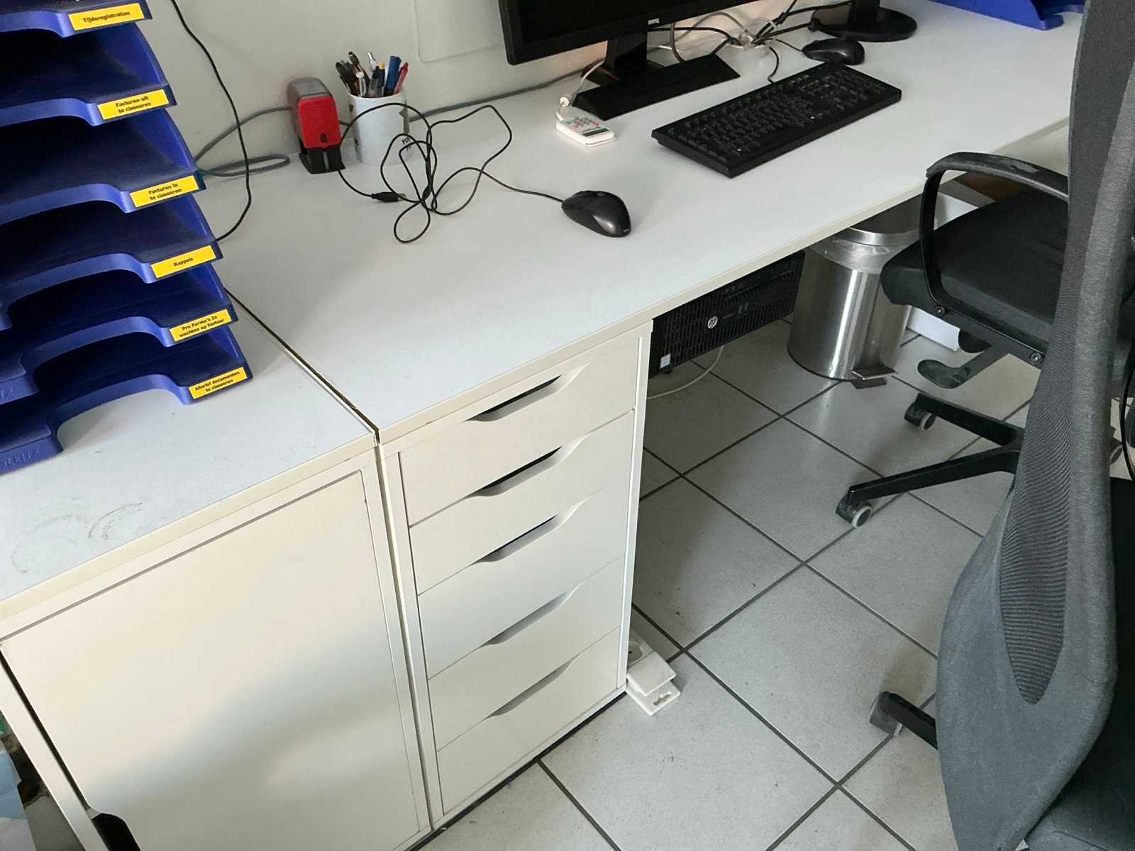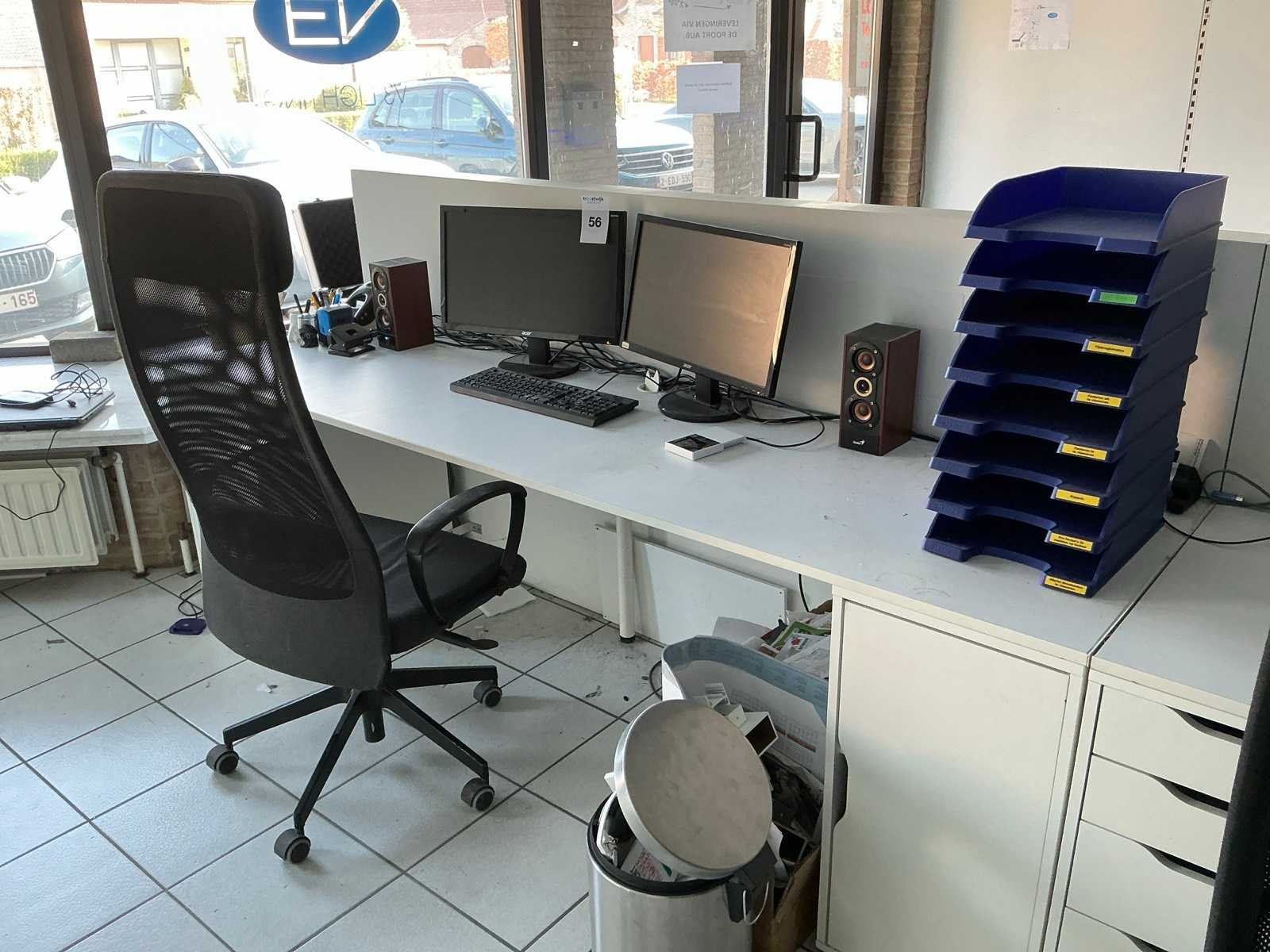 Compleet met 3x bureaustoel en inhoud. Uitgezonderd genummerde loten. Door koper te demonteren/verplaatsen van omgeving. Lengte: 467cm Breedte: 75cm Hoogte: 116cm