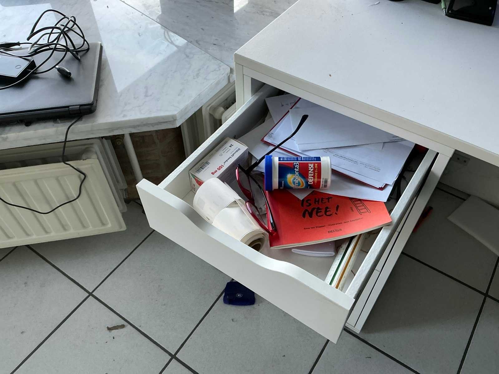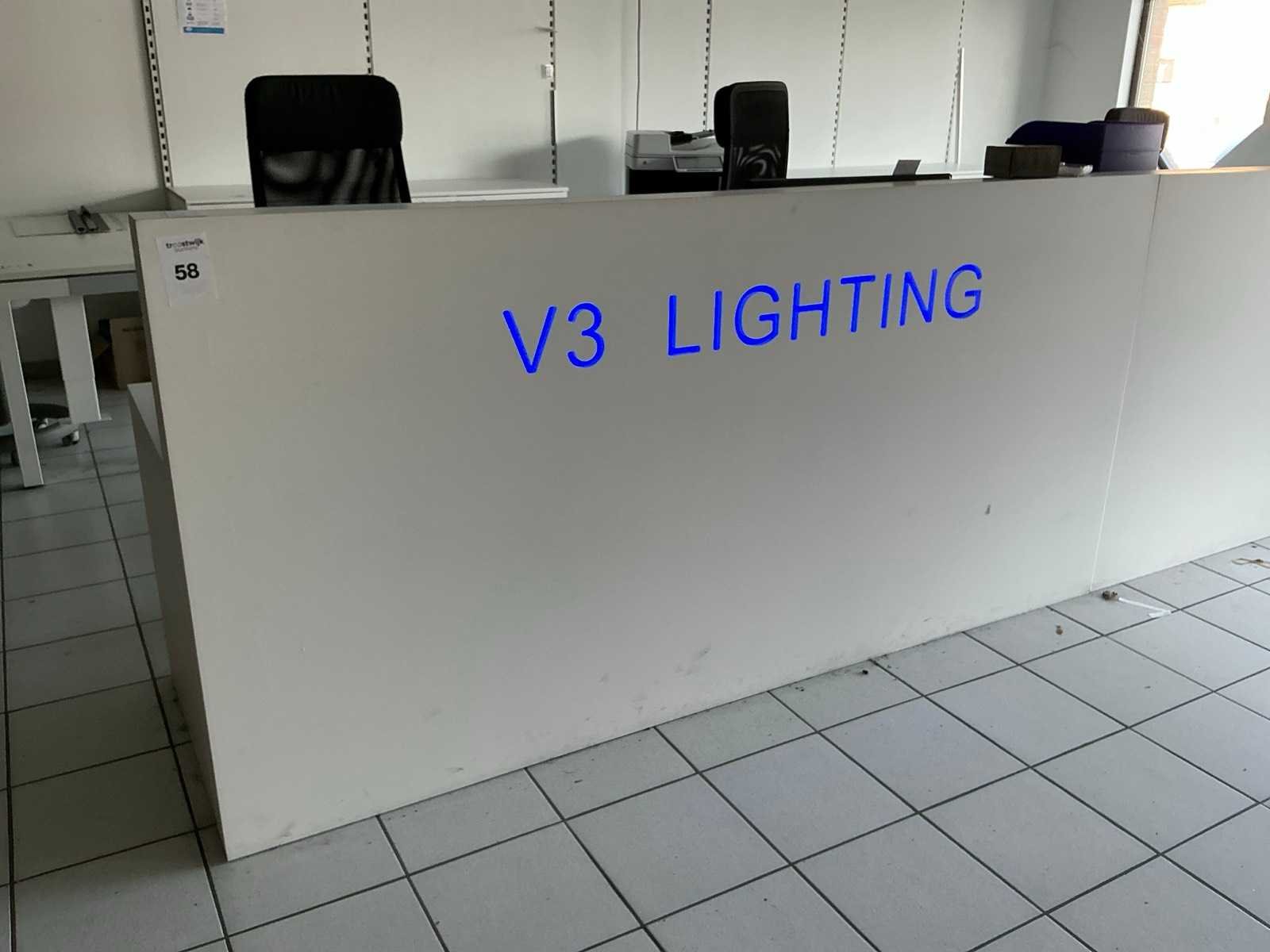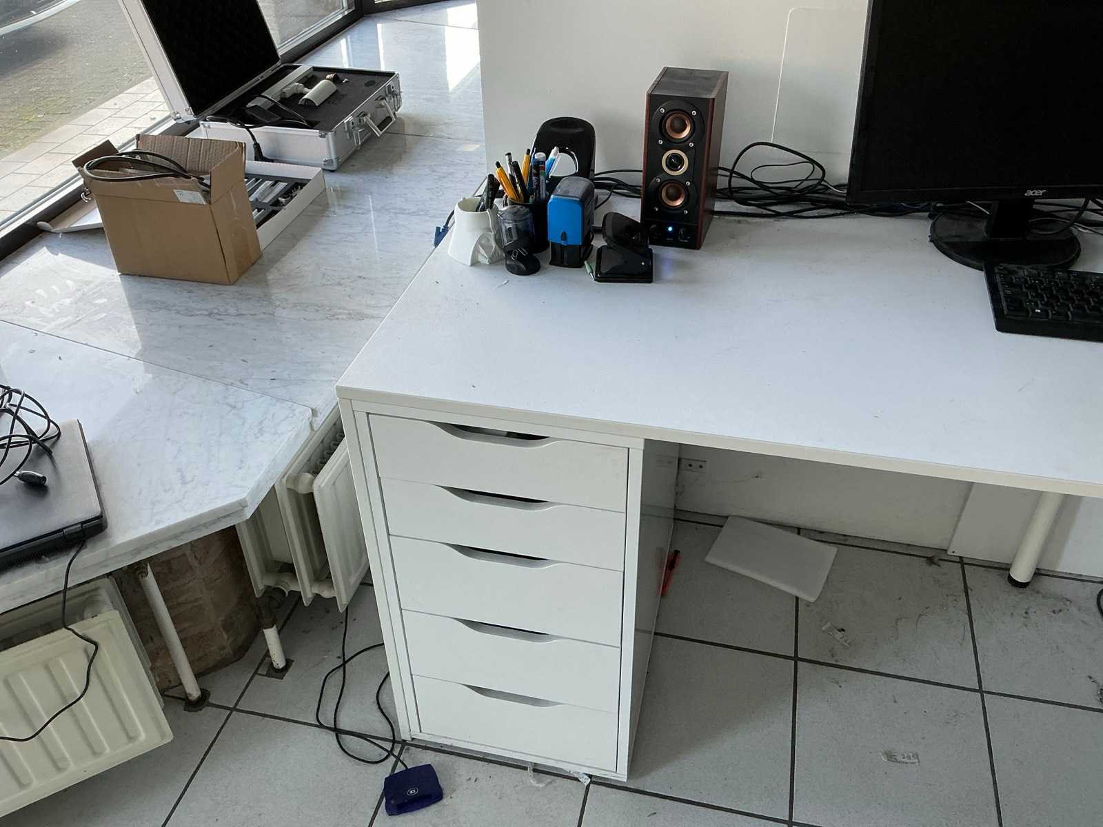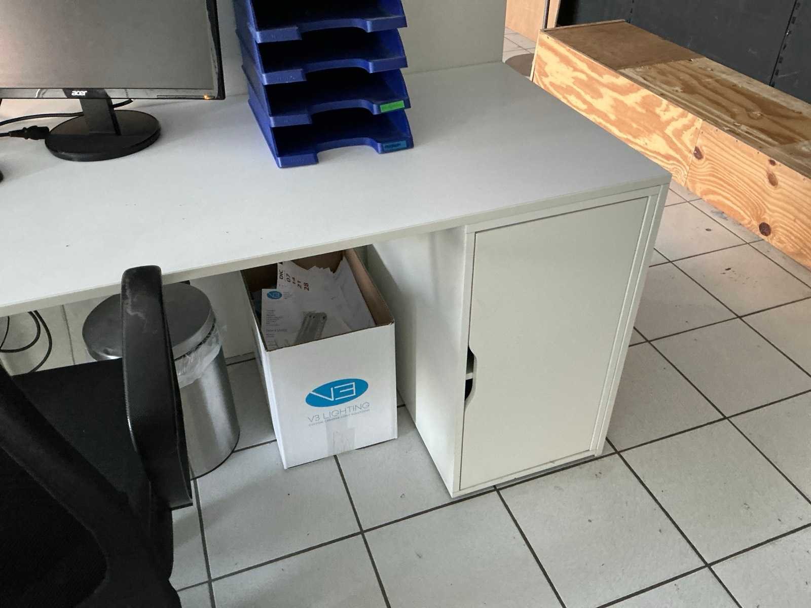 Compleet met 3x bureaustoel en inhoud. Uitgezonderd genummerde loten. Door koper te demonteren/verplaatsen van omgeving. Lengte: 467cm Breedte: 75cm Hoogte: 116cm