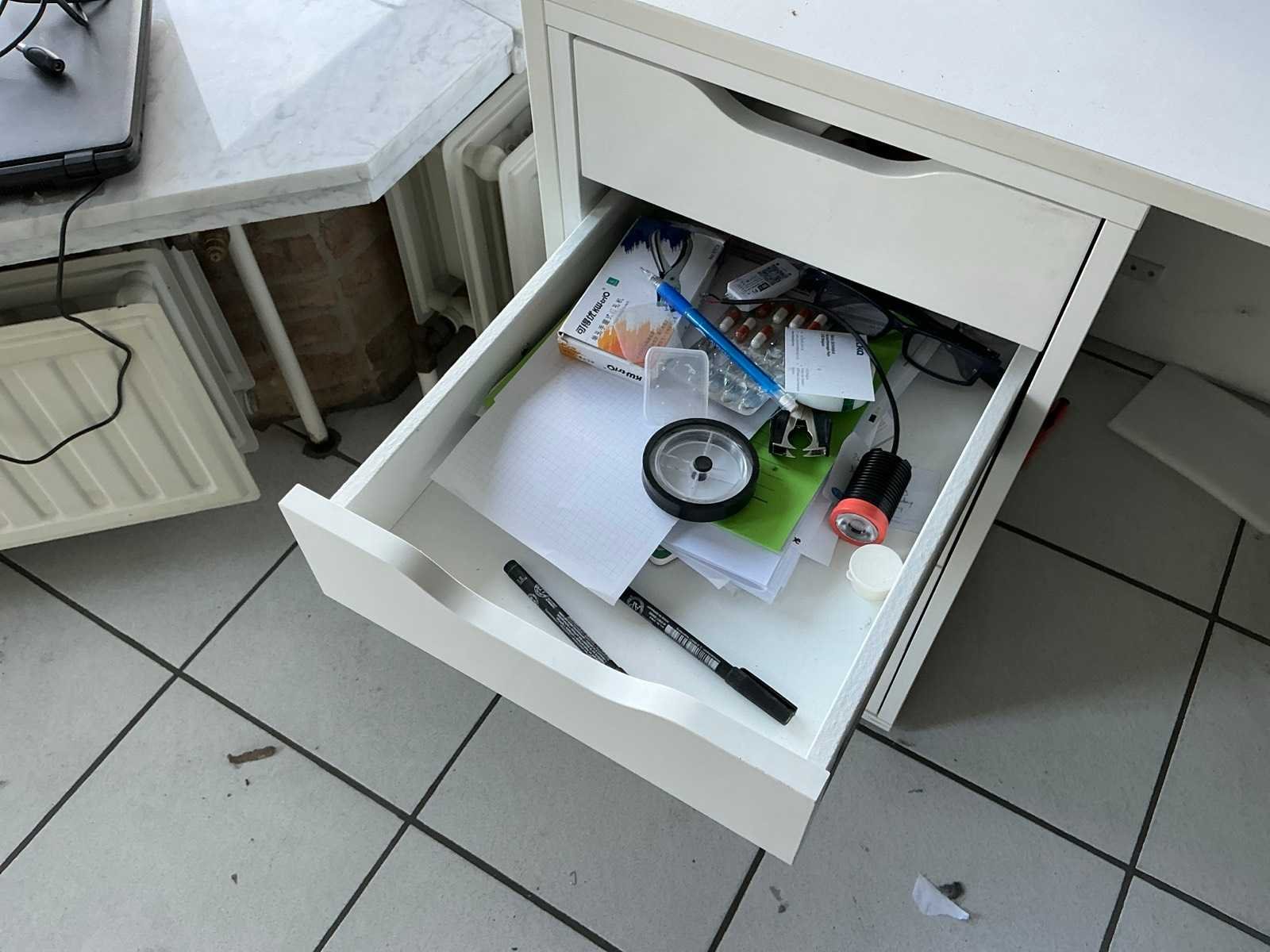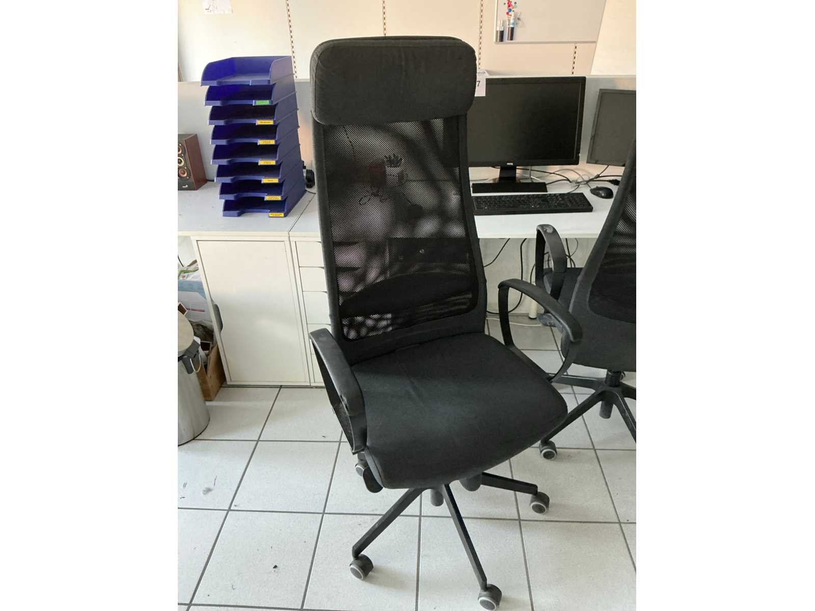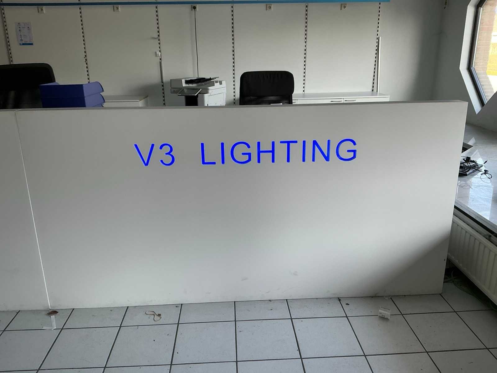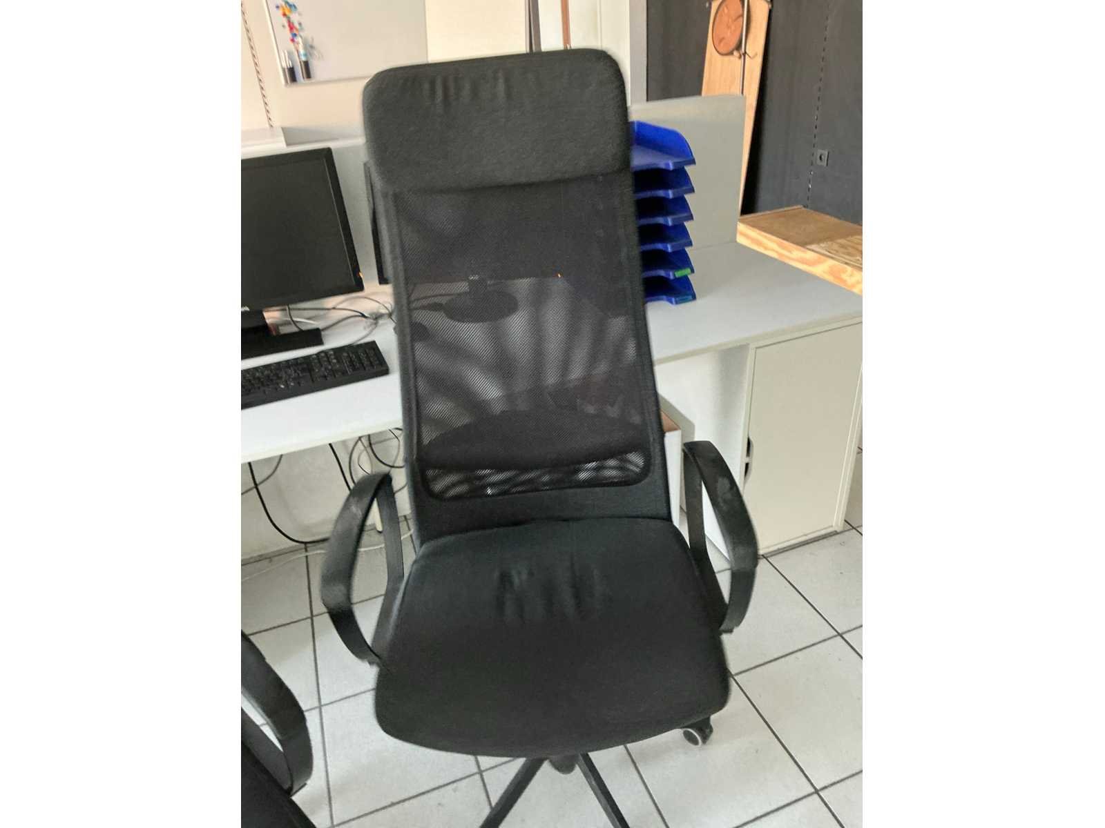 Compleet met 3x bureaustoel en inhoud. Uitgezonderd genummerde loten. Door koper te demonteren/verplaatsen van omgeving. Lengte: 467cm Breedte: 75cm Hoogte: 116cm