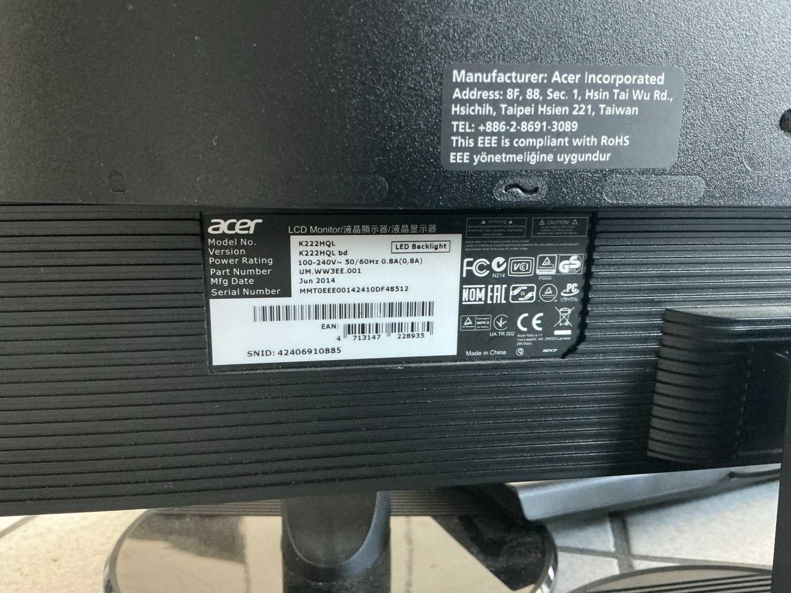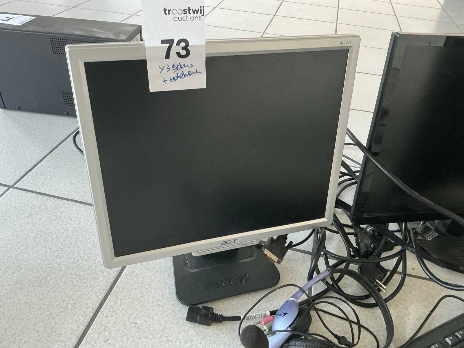 3 diverse computerschermen, acer compleet met toetsenbord en headset