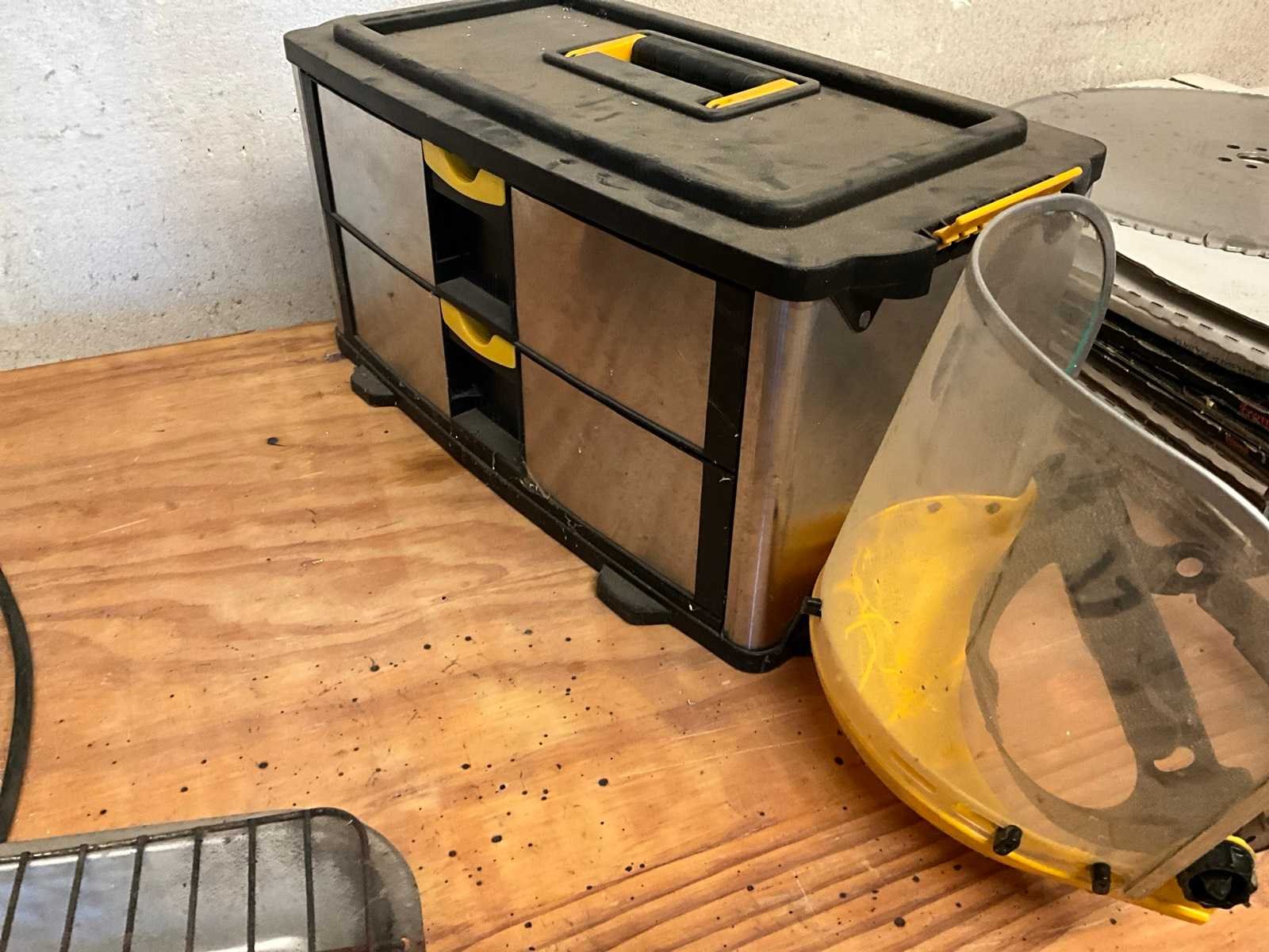 Met inhoud waaronder Stanley materiaalkoffer, dompelpomp, straptoestel met straplint en slotjes, +1x stofzuiger Stanley, constructie gemaakt met palletstelling profiel, demonteerbaar Lengte: 110cm Breedte: 240cm Hoogte: 90cm