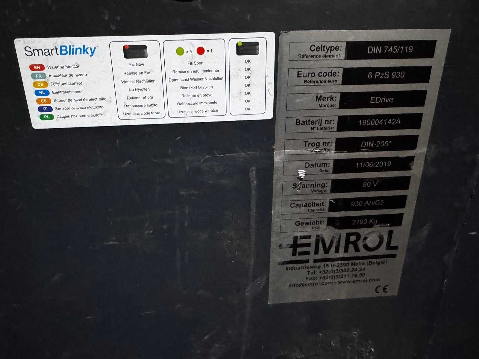 Bestaande uit: Batterij 1e: Edrove 2e: 6 pzs930 3e: 80 v 4e: 930 AH 7e: 2190 kg 8e: L102,5 x W99,5 x H78,5