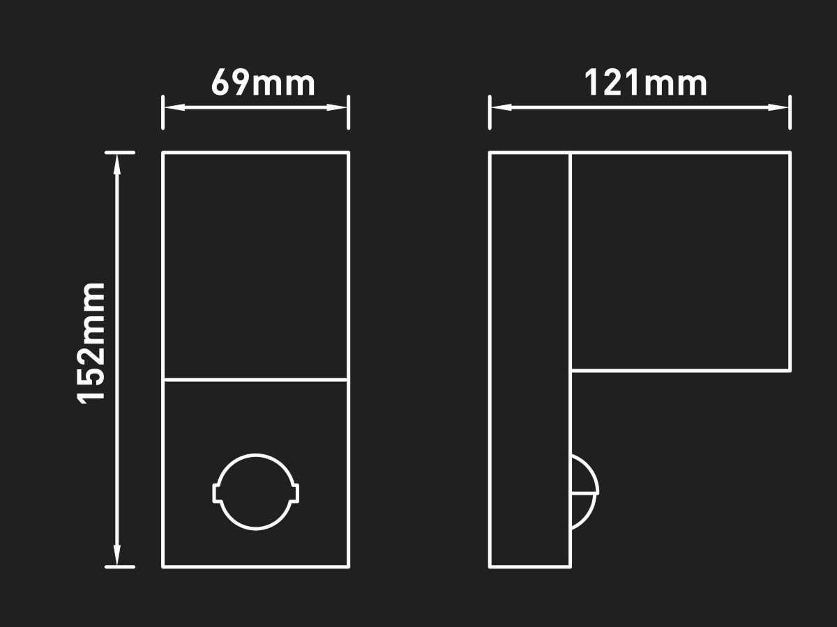 IP44 waterdicht, afm. 121 x 69 x 152 mm, materiaal aluminum en PC, met beweging sensor, verstelbare sensor gevoeligheid afstand 2m tot 8m, verstelbare verlichtingstijd 10 sec tot 4 min, verstelbare dag en nachtsensor, bevestiging inclusief, GU10 fitting, bulb niet inbegrepen, geschikt voor binnen en buiten, een bulb invoer, voltage 220-240V, max 35 watt, SKU 00885 Merk: LAMPINNO Product type: Buiten en Binnen Fitting: GU10 Kleur: Zand Zwart Lengte: 15.2cm Breedte: 6.9cm Hoogte: 12.1cm Materiaal: Aluminium en PC