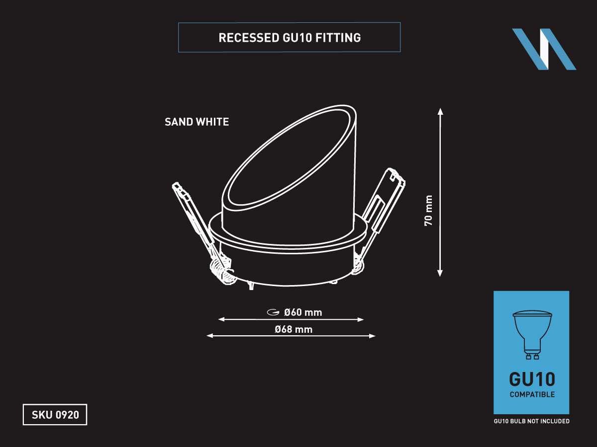 Afdichting IP20, product kleur zand wit, afm. Ø 68 x 70mm, inbouwdiameter ø 60mm, materiaal aluminium, fitting GU10, inclusief keramiek lamphouder, lichtbron bulb niet inclusief, geschikt voor binnen, een bulb invoer, voltage 220-240V, SKU 00920 SKU353 Merk: LAMPINNO Product type: Binnen Fitting: GU10 Kleur: Wit Lengte: 7.0cm Breedte: 6.8cm Materiaal: Aluminium