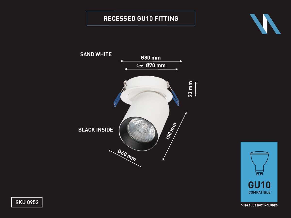 Afdichting IP20, product kleur zand wit en zwart ring, afm. Ø 60 x 100mm, inbouwdiameter ø 70mm, draaibaar 350° en kantelbaar 50°, materiaal aluminum, bevestiging inclusief, fitting GU10, bulb niet inbegrepen, geschikt voor binnen, een bulb invoer, voltage 220-240V, max 40 watt, SKU 00952 Merk: LAMPINNO Product type: Binnen Verstelbaar: true Fitting: GU10 Kleur: zwart en wit Lengte: 10.0cm Breedte: 6.0cm Materiaal: Aluminium