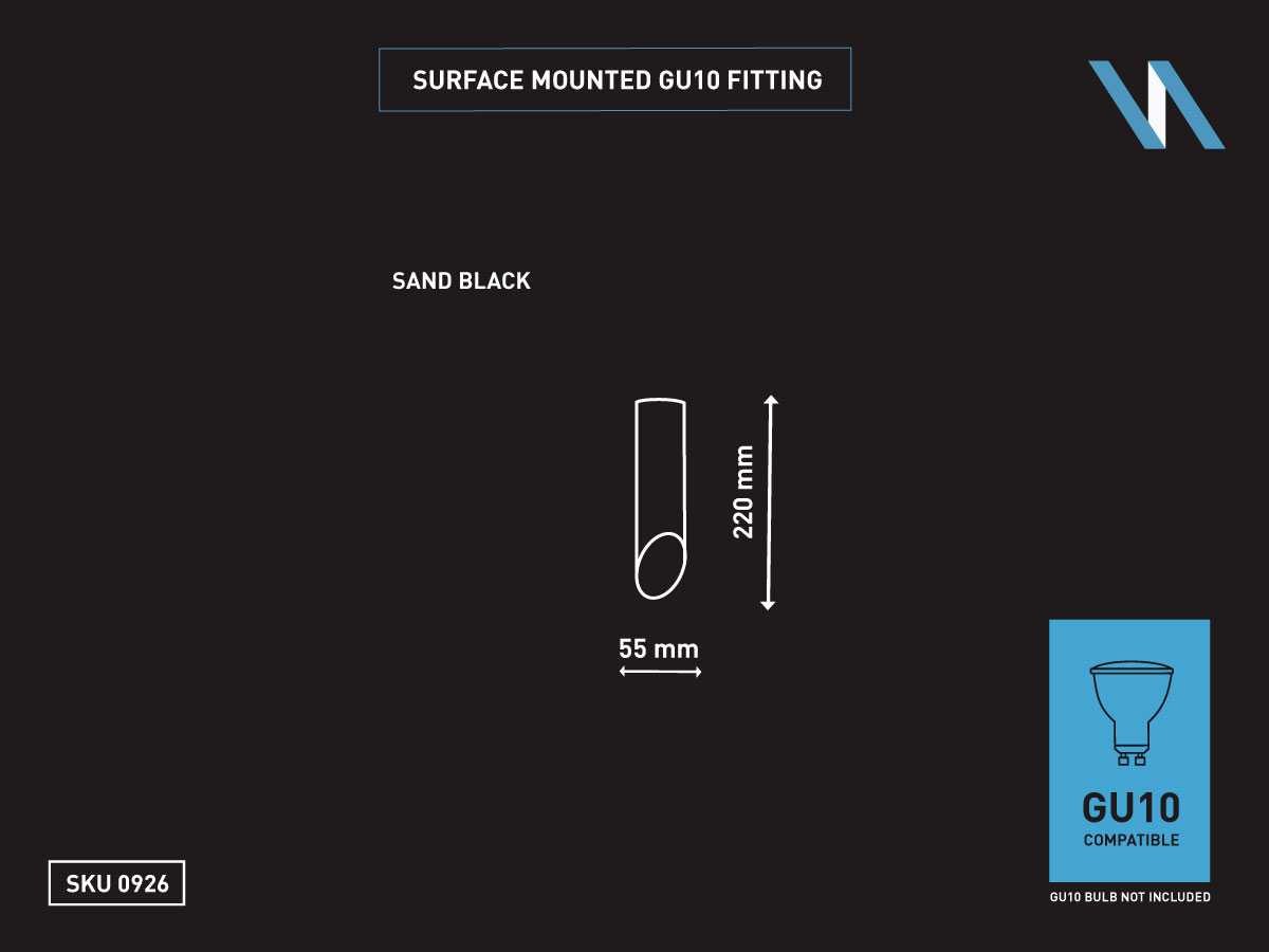 Afdichting IP20, product kleur zand zwart, afm. Ø 55 x 220mm,bevestiging inclusief, materiaal aluminium, fitting GU10, bulb niet inbegrepen, geschikt voor binnen, een bulb invoer, voltage 220-240V, SKU 0926 Merk: LAMPINNO Product type: Binnen Fitting: GU10 Kleur: Zwart Lengte: 22.0cm Breedte: 5.5cm Materiaal: Aluminium