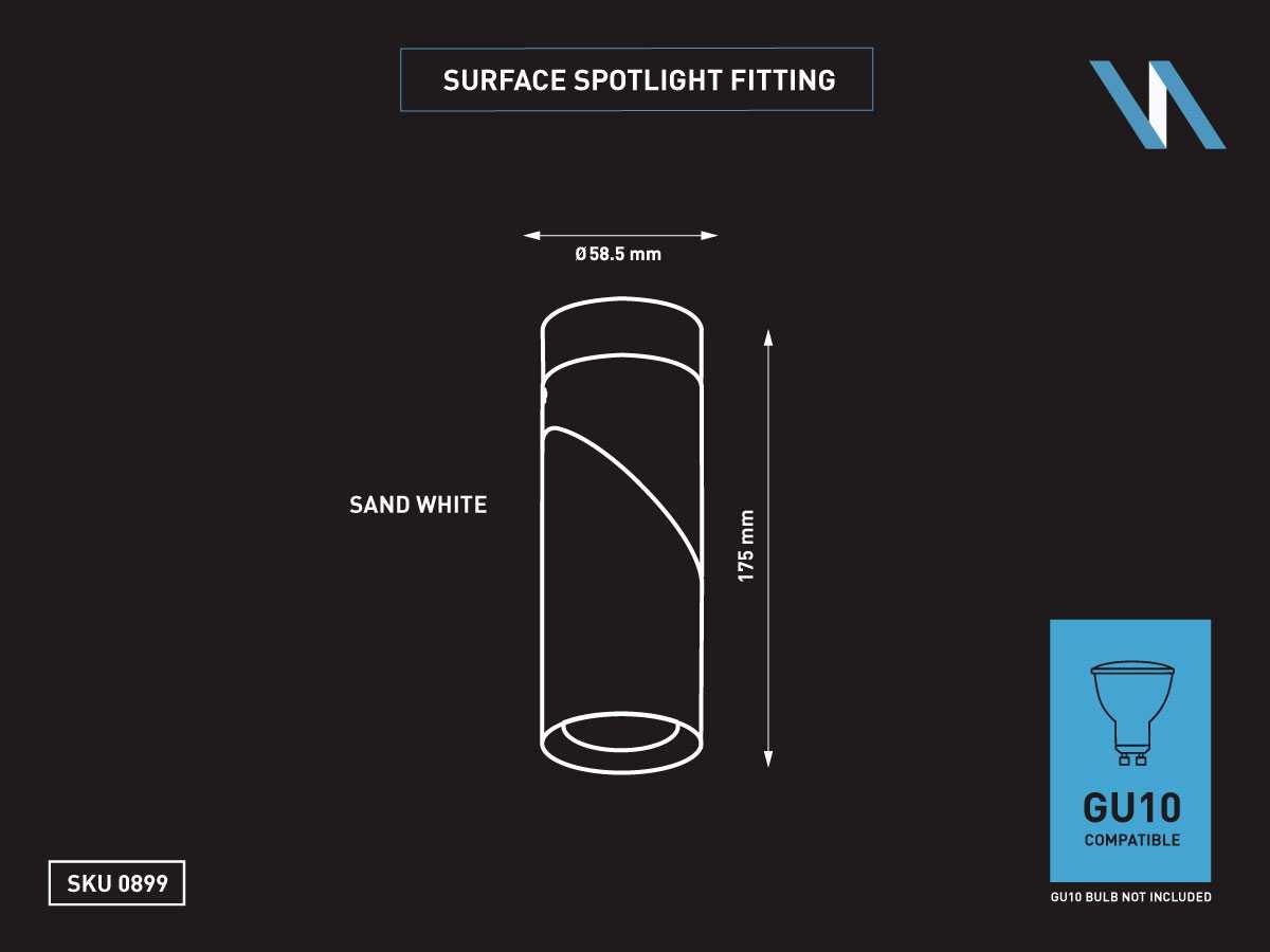 Afdichting IP20, product kleur zand wit, afm. Ø 58.5 x 150mm, kantelbaar 180°, materiaal aluminum, bevestiging inclusief, fitting GU10, bulb niet inbegrepen, geschikt voor binnen, een bulb invoer, voltage 220-240V, max 20 watt, SKU 00899 Merk: LAMPINNO Product type: Binnen Verstelbaar: true Fitting: GU10 Kleur: Wit Lengte: 15.0cm Breedte: 58.5cm Materiaal: Aluminium
