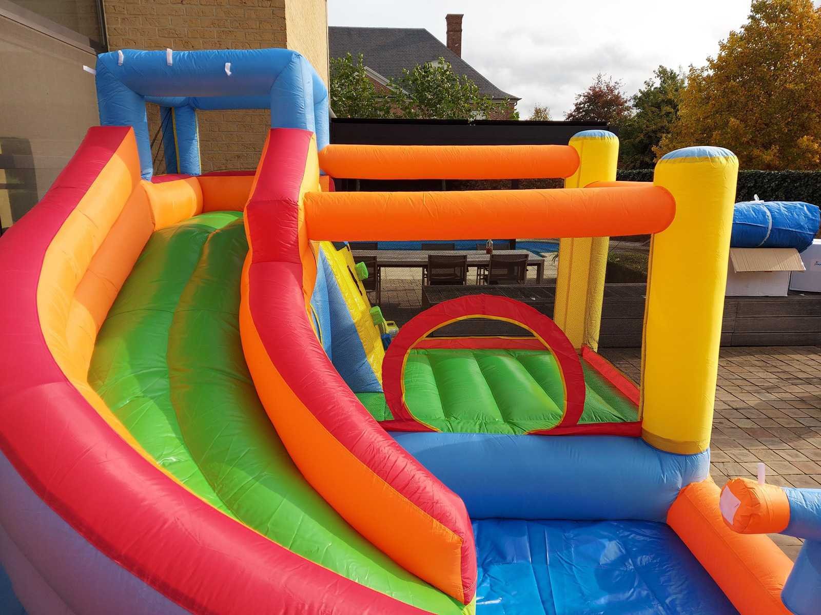Watergame, inclusief blower 480W, afmeting verpakking in cm: 50x50x80, ongebruikt in verpakking. Gewicht: 30kg Lengte: 300cm Breedte: 250cm Hoogte: 250cm Materiaal: nylon/PVC