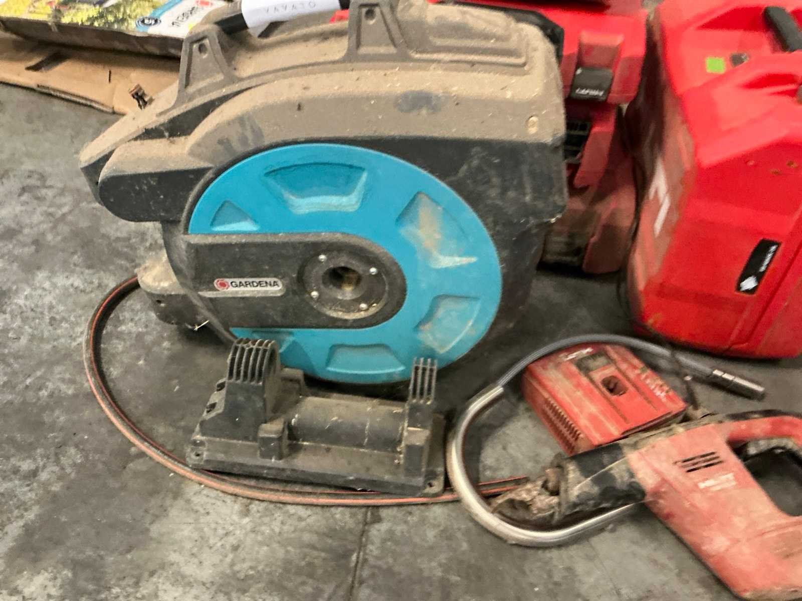 6 diverse lege gereedschapskoffers HILTI compleet met afzuig element HILTI te drs-4/6, luchtdarm op haspel GARDENA, enige defecte gereedschappen waaronder dubbelkopseslijpmolen, zaagmachine MAKITA, enzovoort