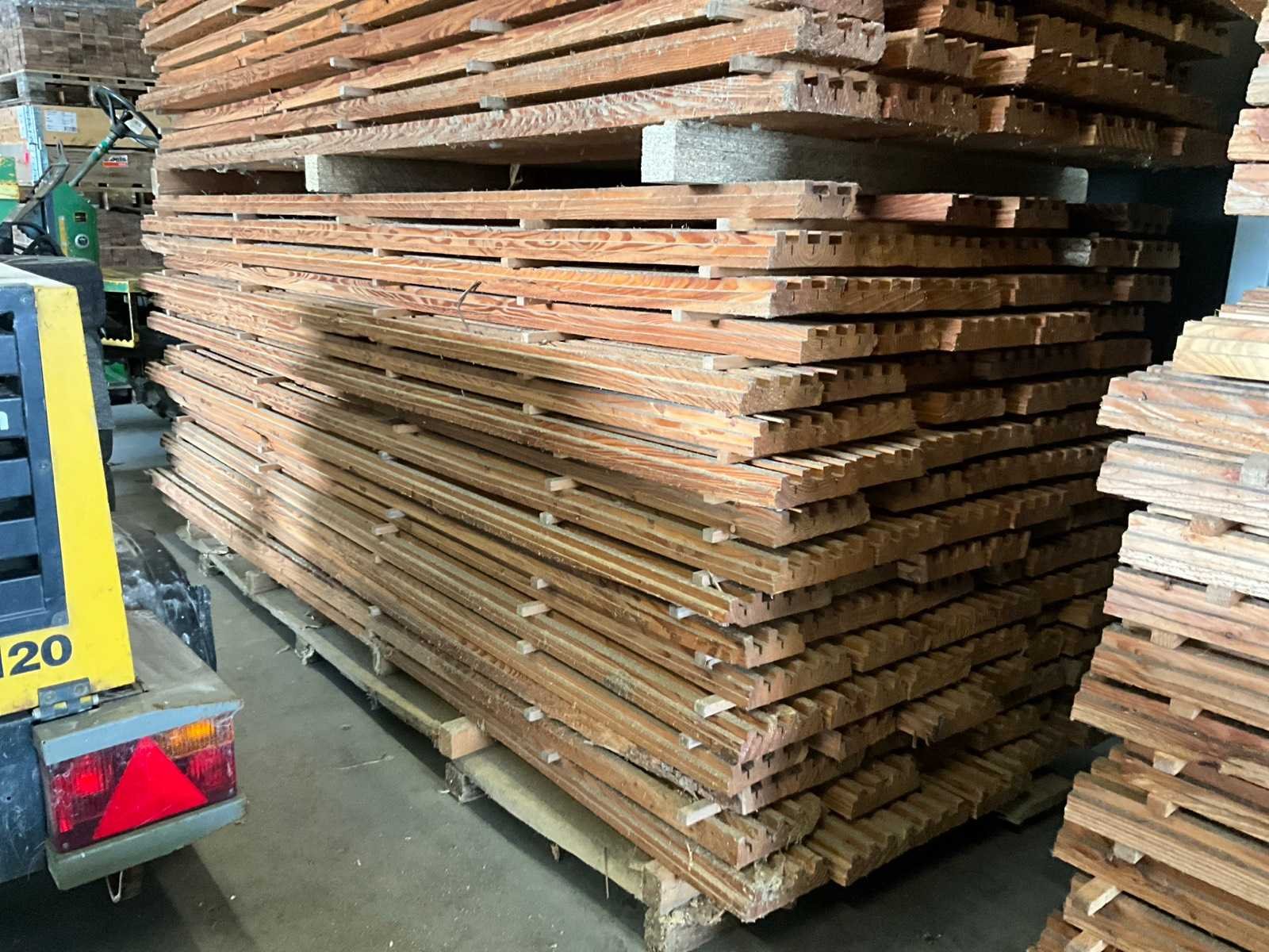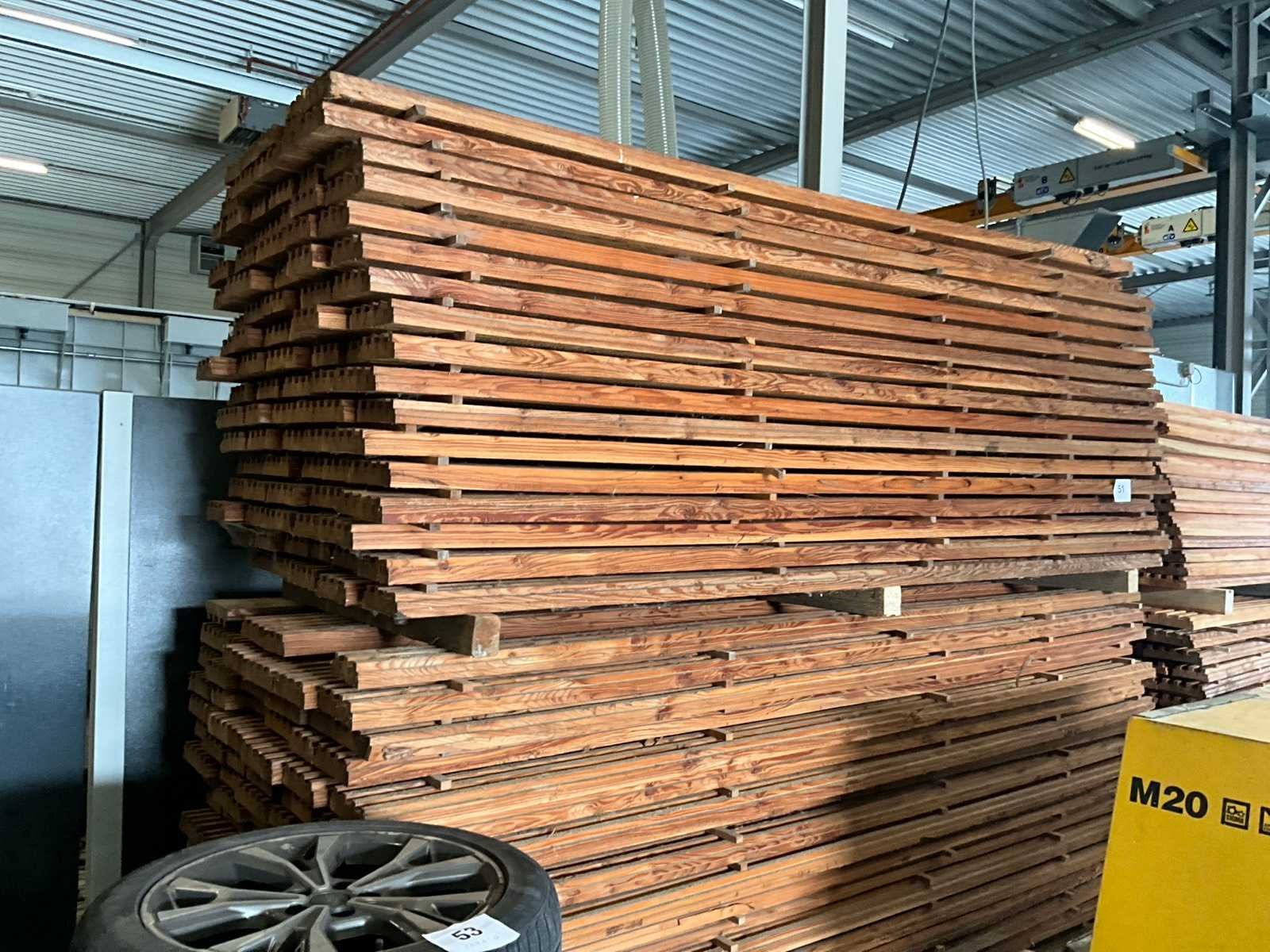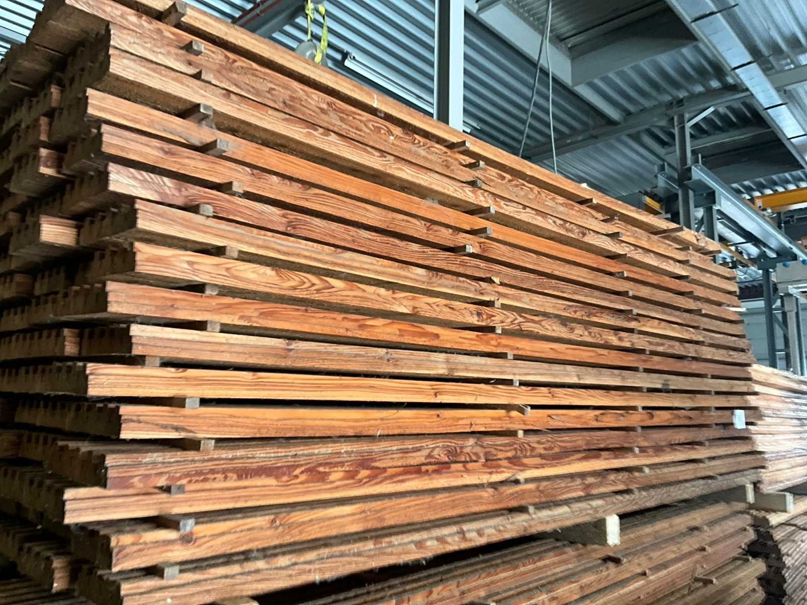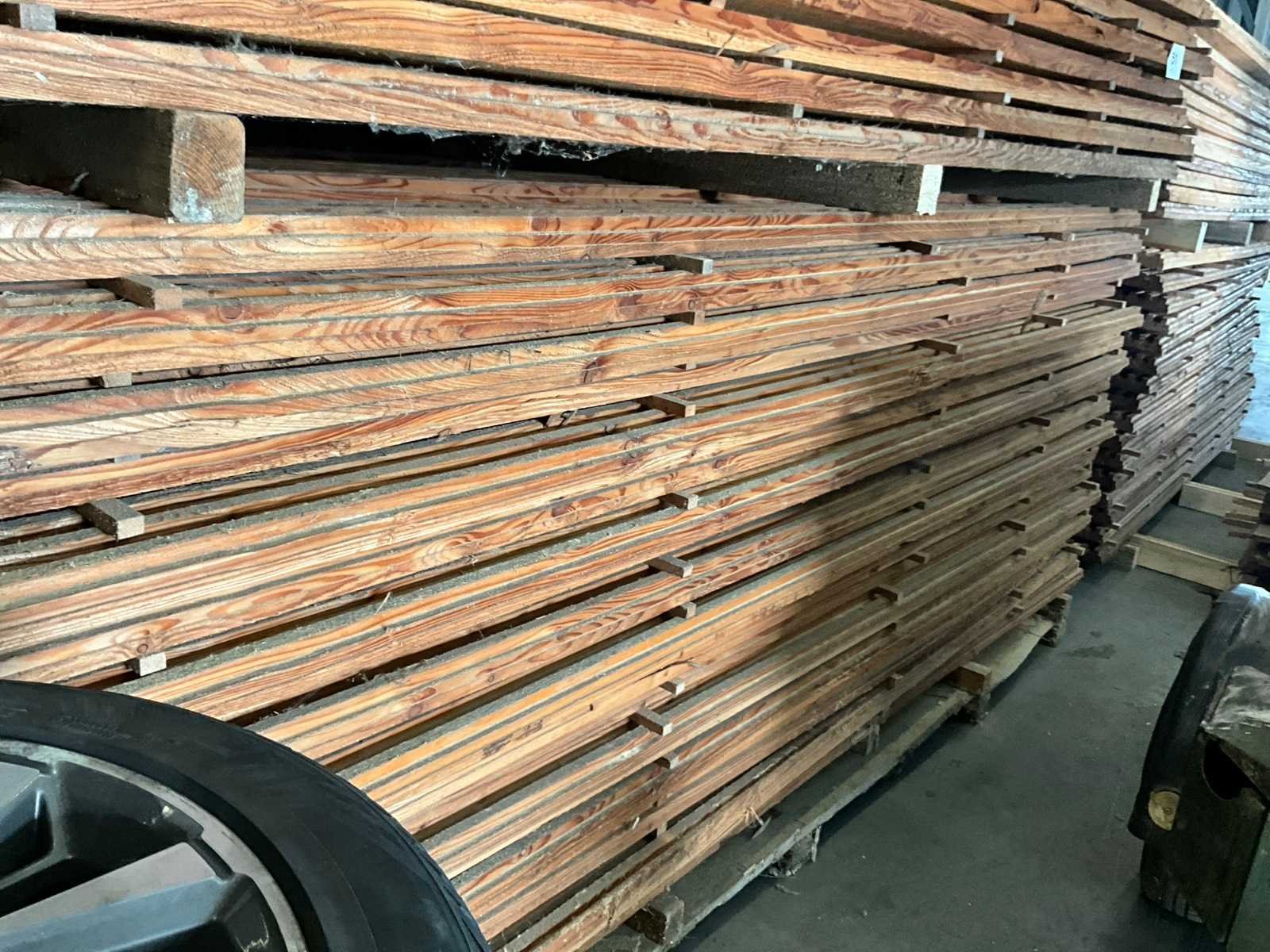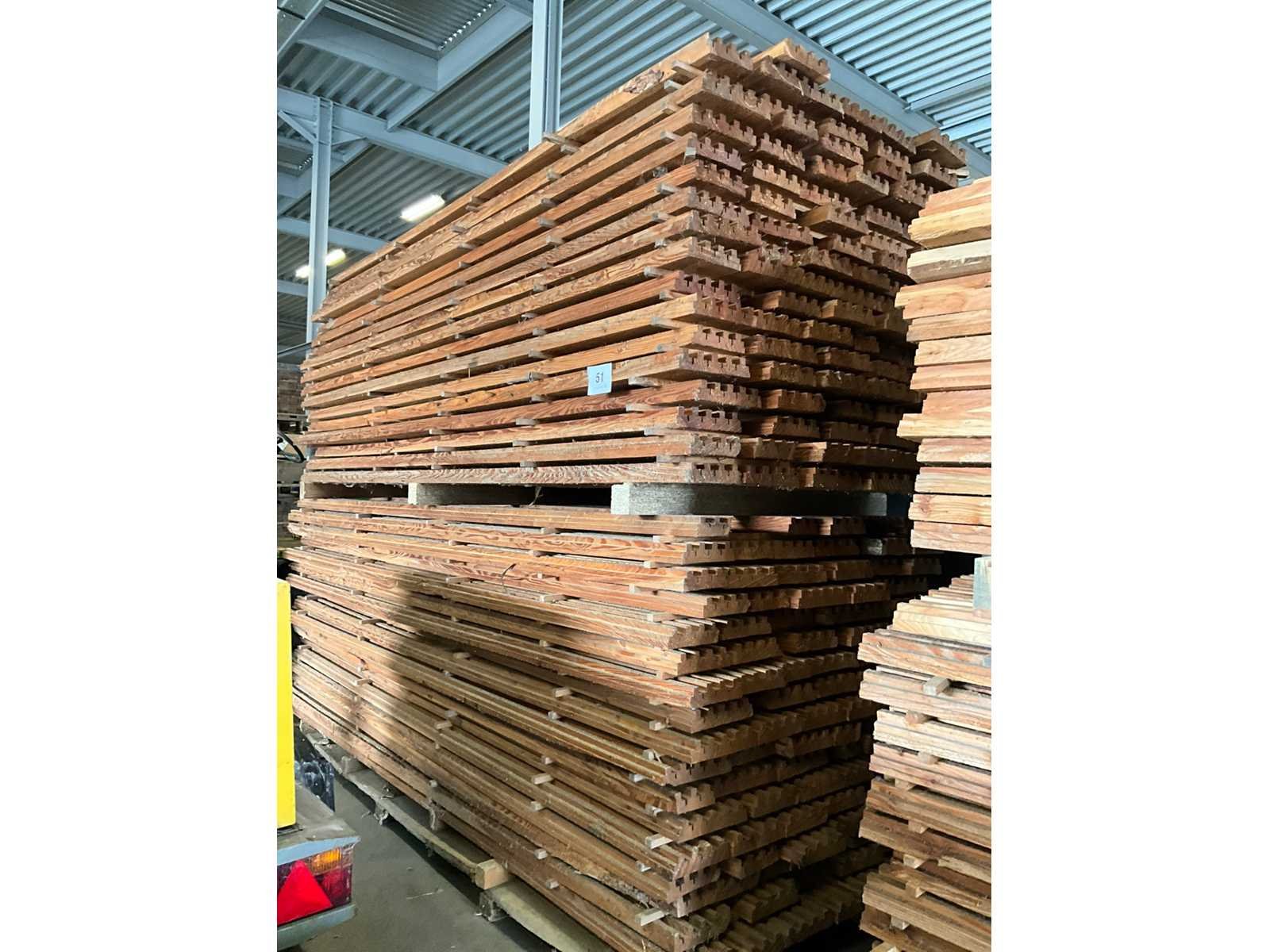Ongeveer 145 planken, elk met een lengte van ongeveer 300 cm en in diverse breedtes waarvan voornamelijk van 13-23 cm. Dikte 5 cm en waarvan 1 zijde voorzien van uitsparingen.