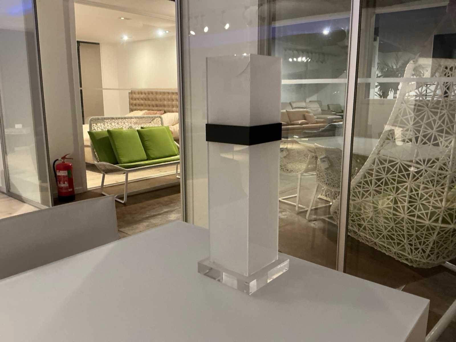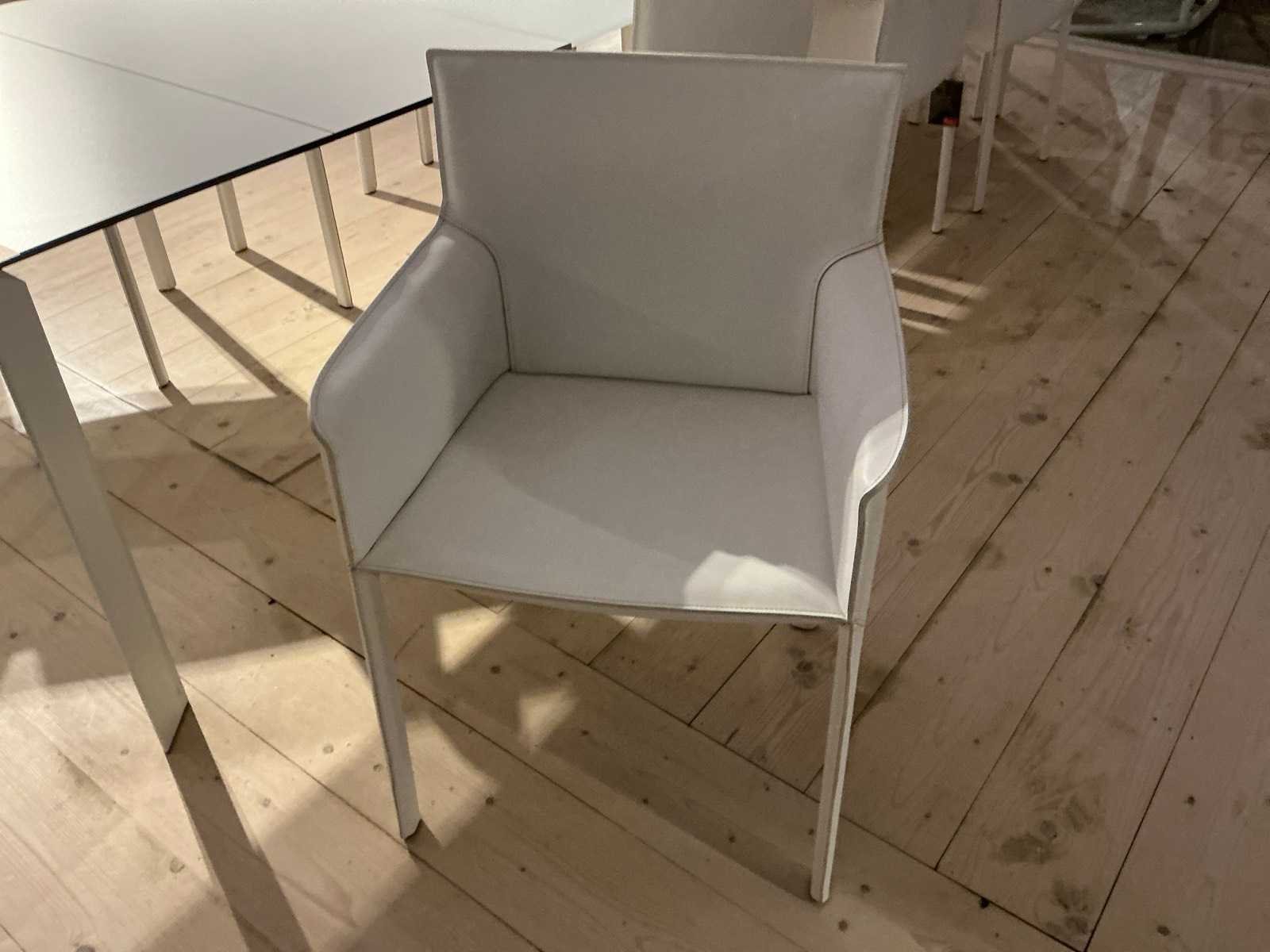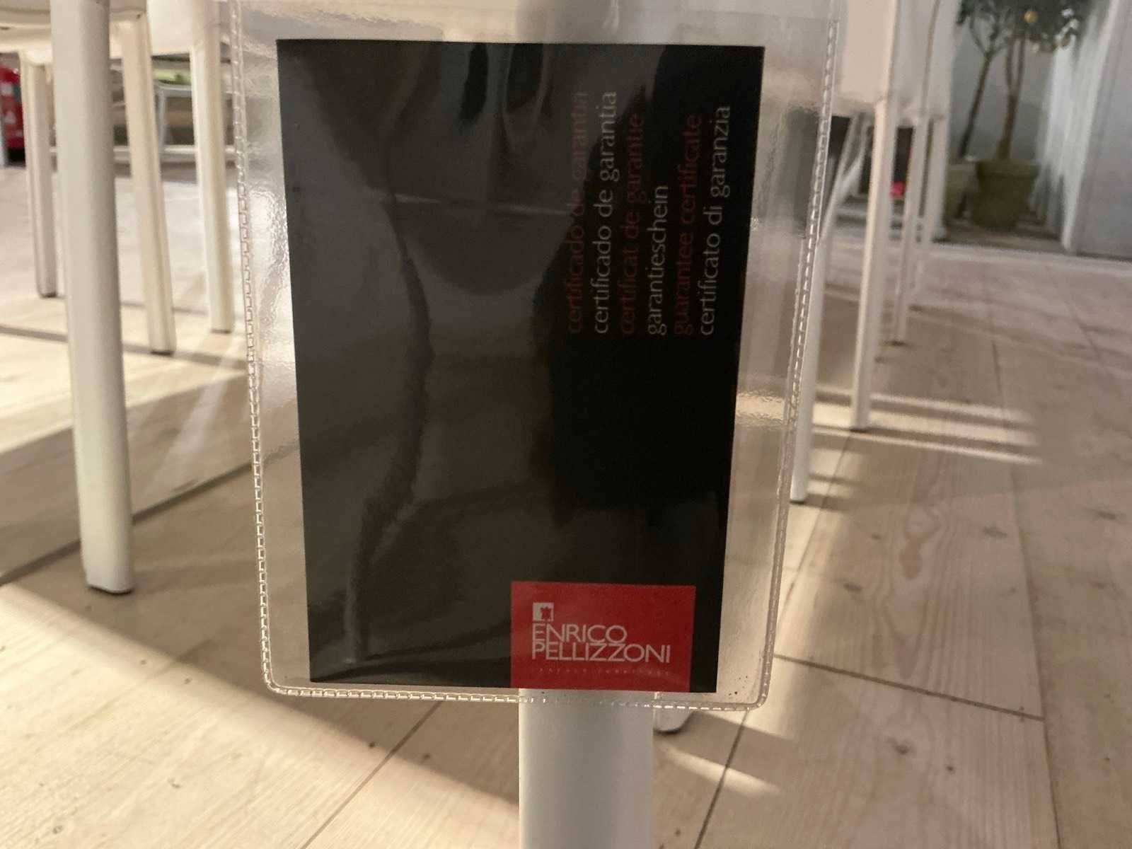Compleet met 8x stoel ENRICO PELLIZZONI wit lederlook en 1x tafellamp Model: Nori Lengte: 303cm Breedte: 100cm Hoogte: 75cm Materiaal: Alu / glas