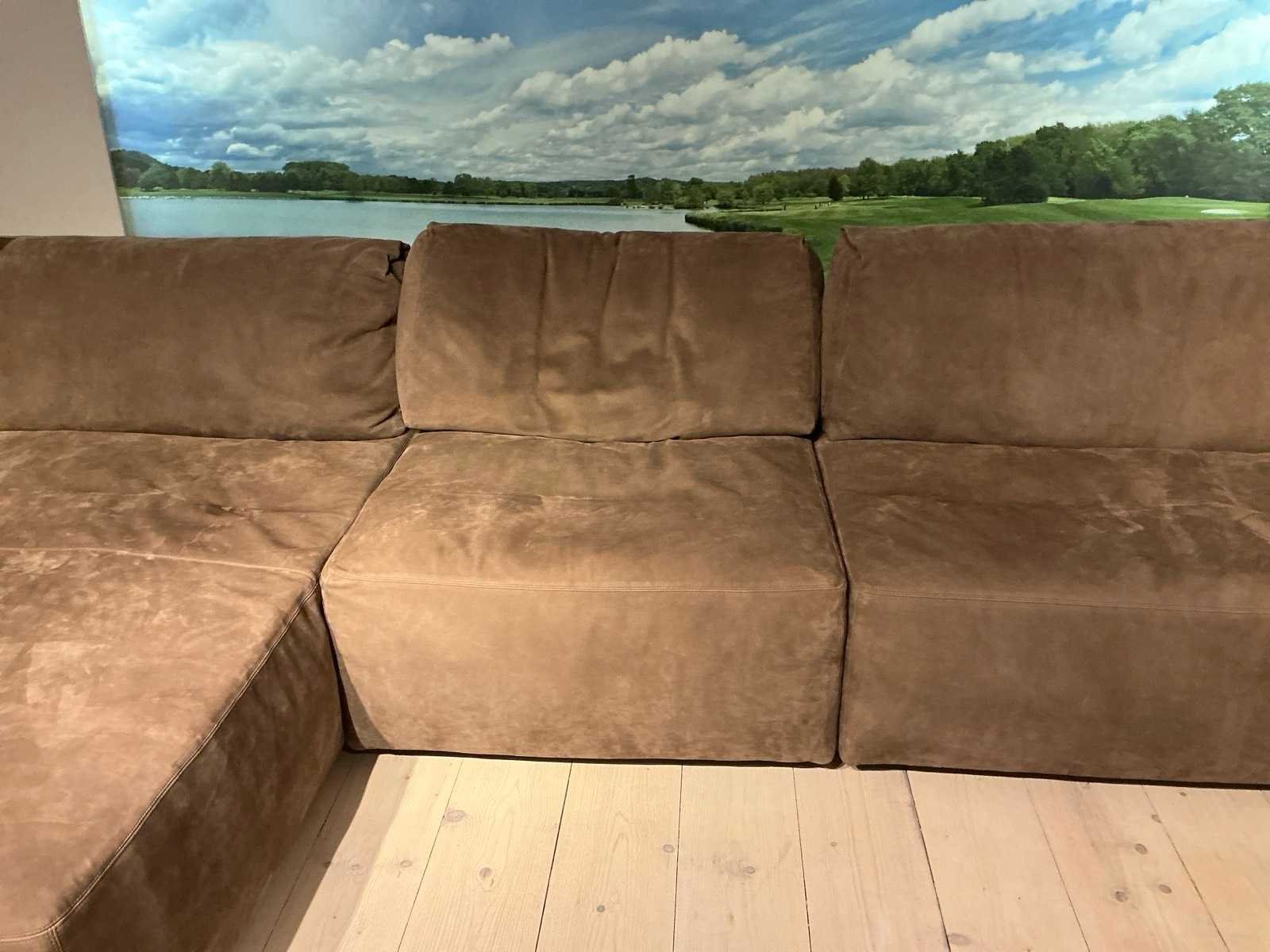 Bestaande uit 2-zit chaise longue + 3-zit Merk: Swan Model: Boxer Lengte: 360cm Breedte: 155cm Hoogte: 75cm Materiaal: Leder PS Nubruck 2104 Brown