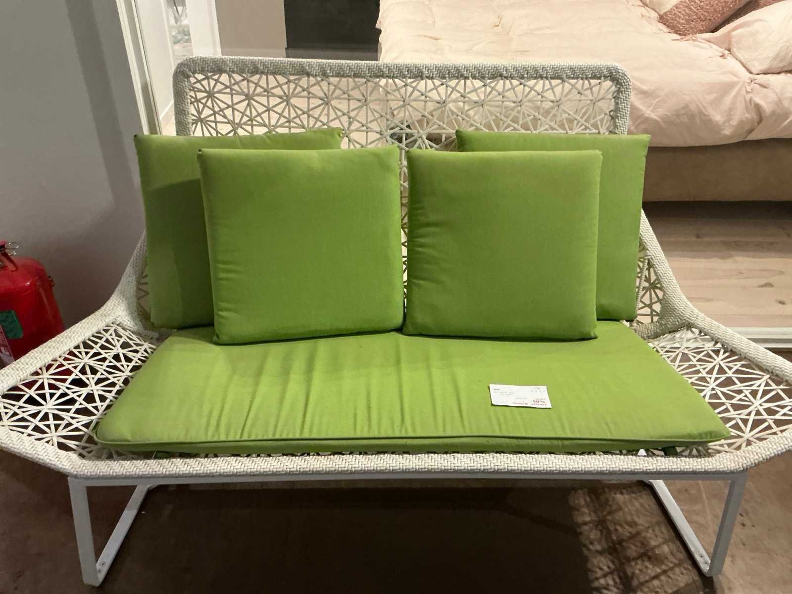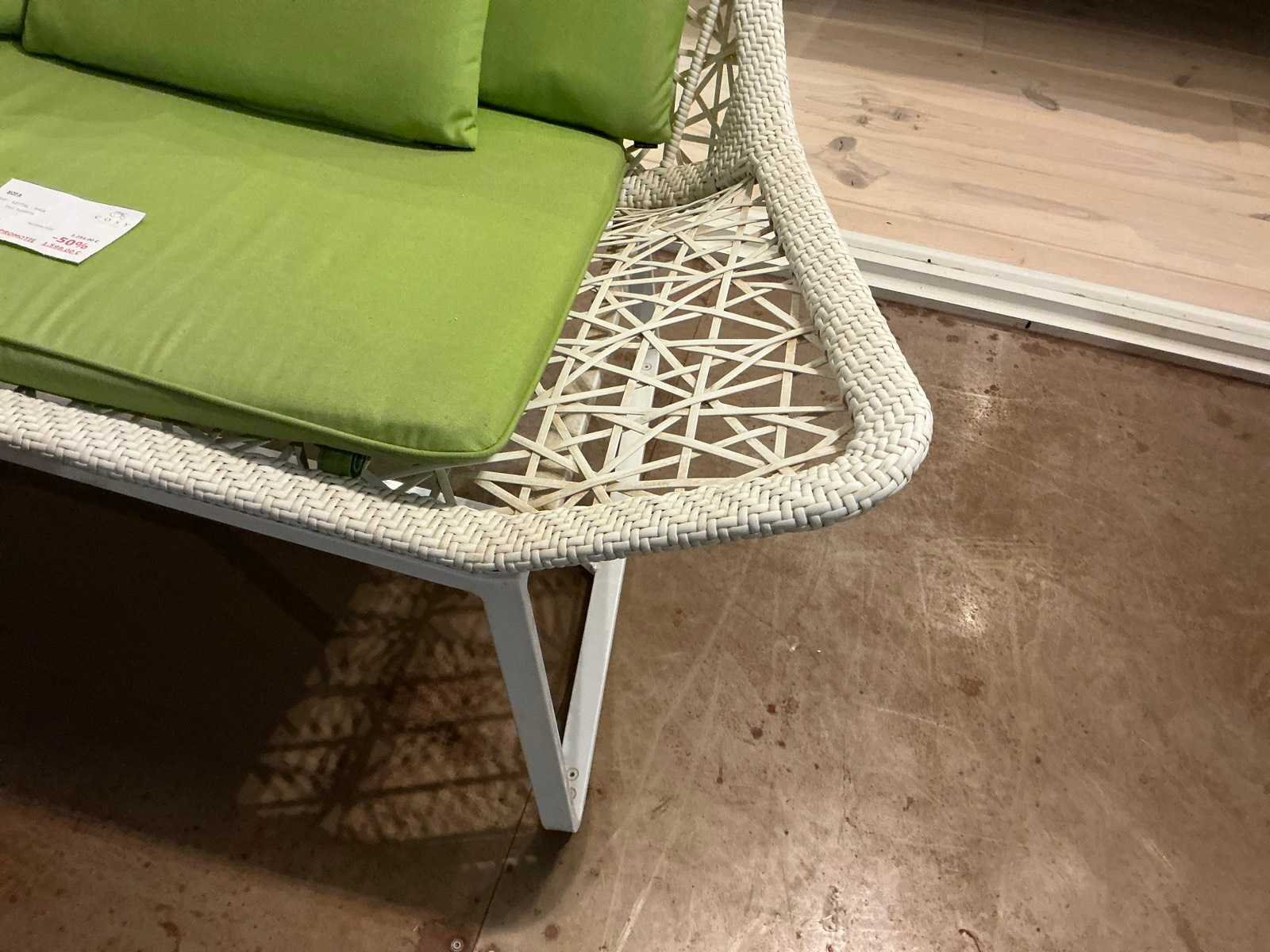Voorzien van metalen frame en gevlochten pvc zitting met kussens, zithoogte: 45cm Merk: Tuinbank Model: Kettal Lengte: 190cm Breedte: 90cm Hoogte: 110cm
