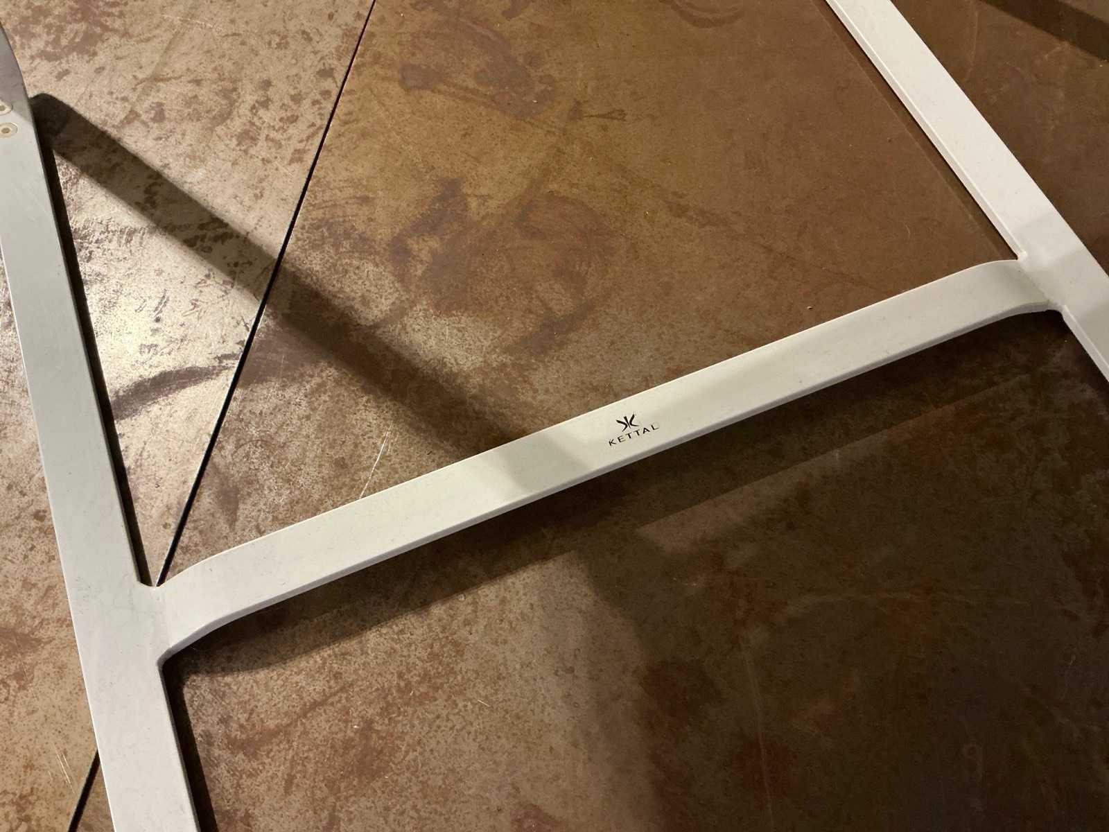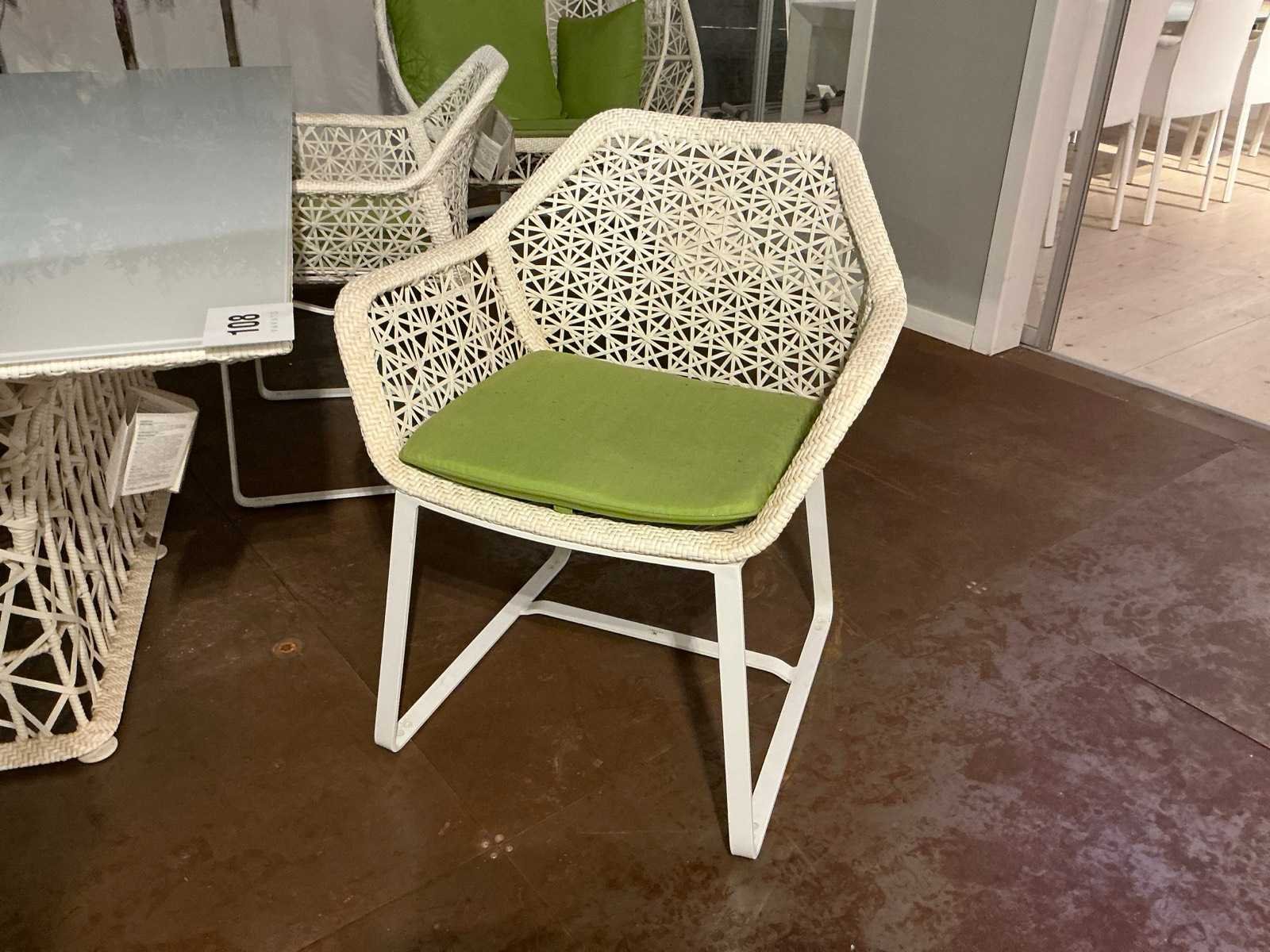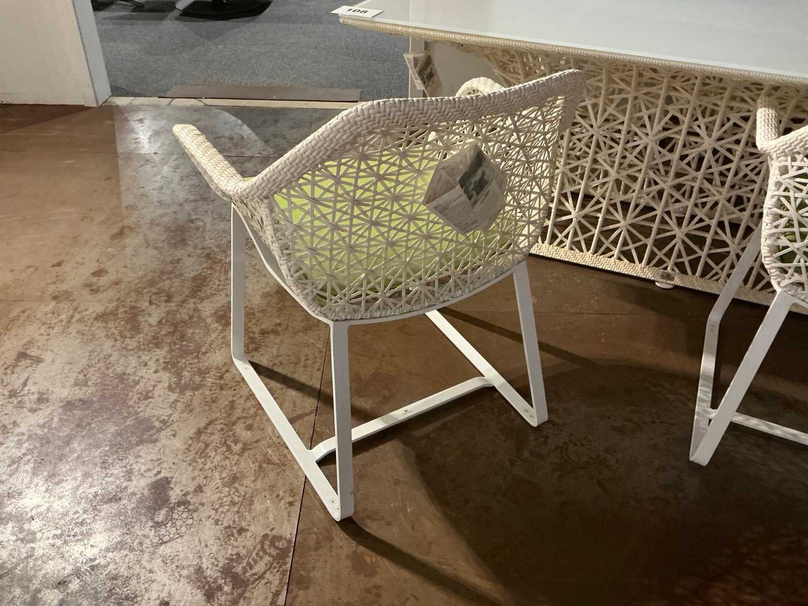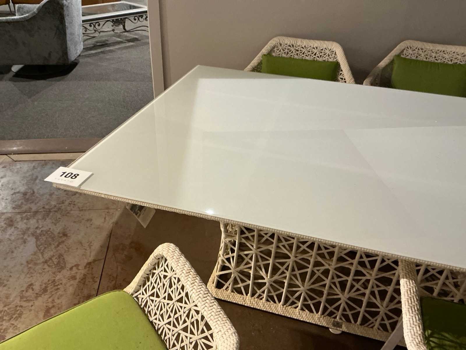 Bestaande uit tafel voorzien van pvc gevlochten structuur en glazen bovenblad 180x120cm en 4x pvc gevlochten stoel met metalen onderstel Model: Kettal-Maia
