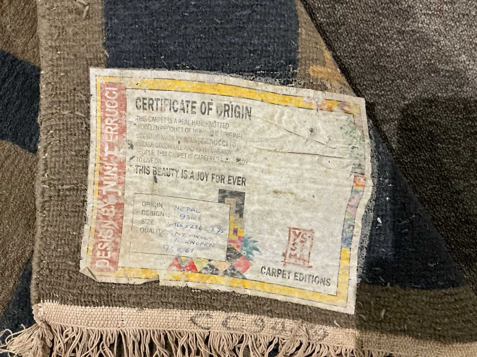 Origine: Nepal, licht bevuild met gebruikssporen Merk: Yssima Model: By Mini Ferrucci Oppervlakte: 3.75m² Lengte: 1660mm Breedte: 2360mm Materiaal: Wool